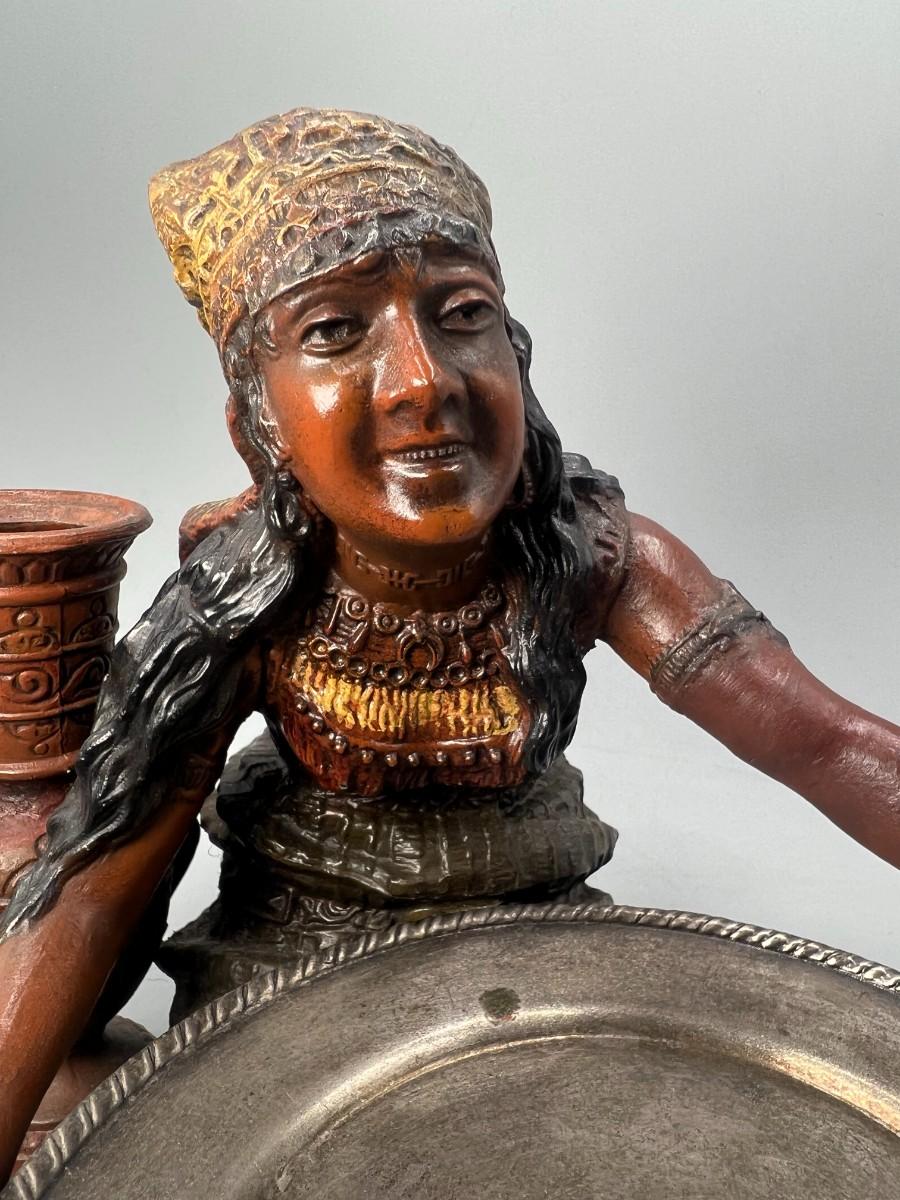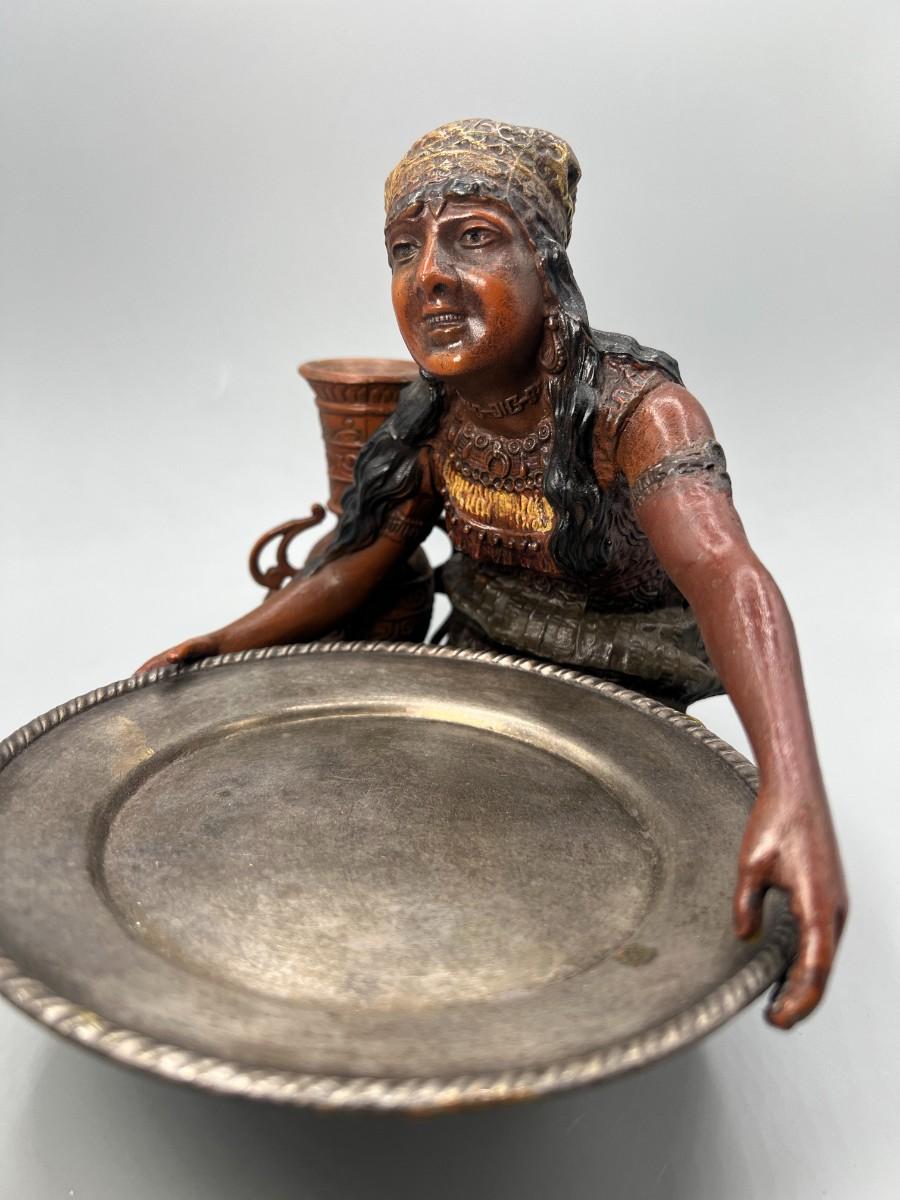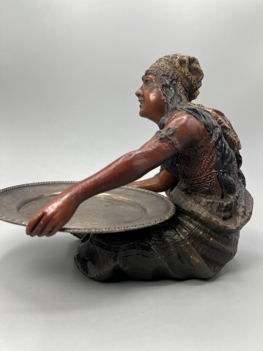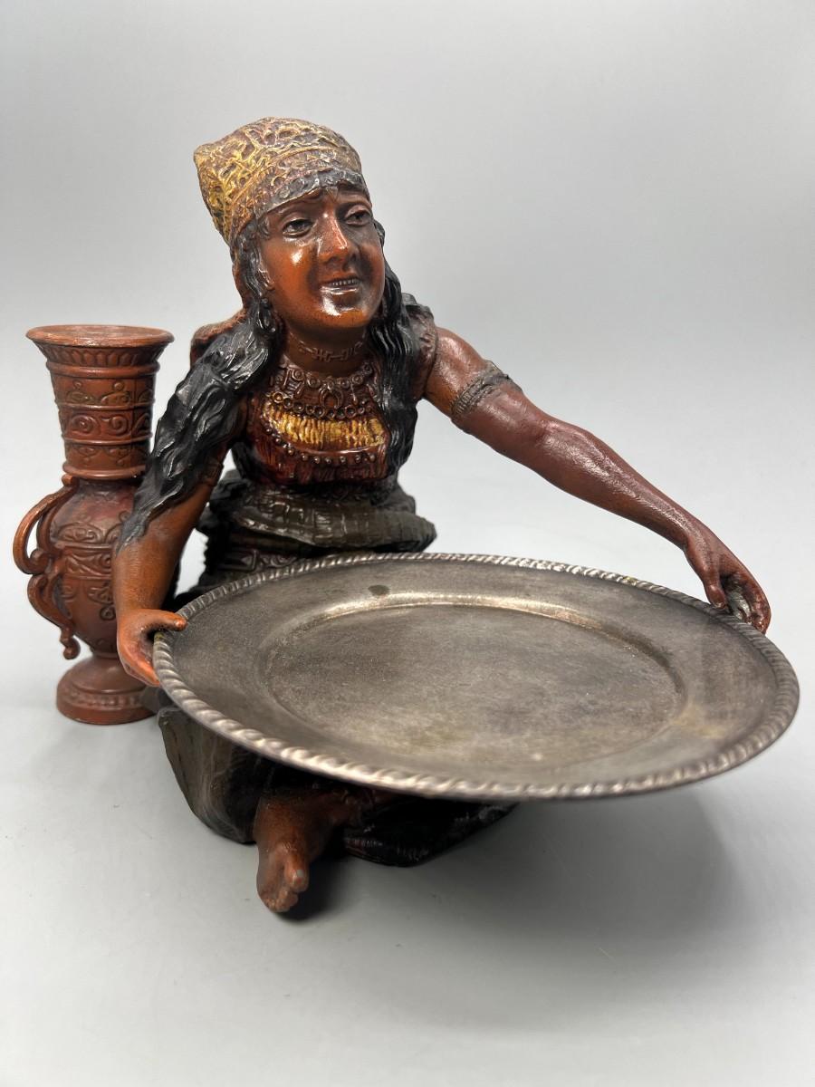 Vintage Cold Painted Arabian Woman Metalware Bronze Art Deco Spelter Statue with Saucer Plate