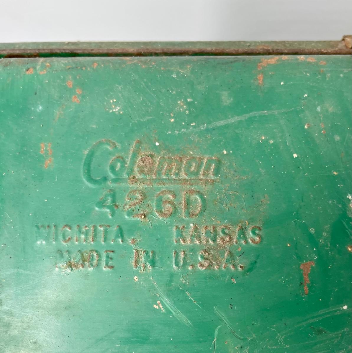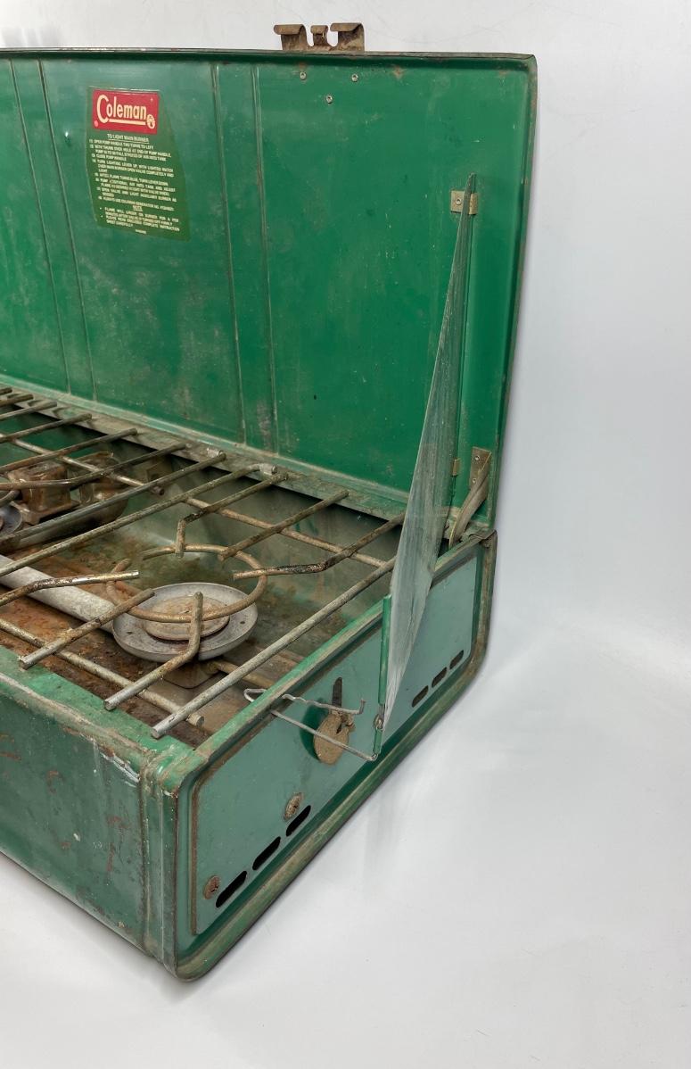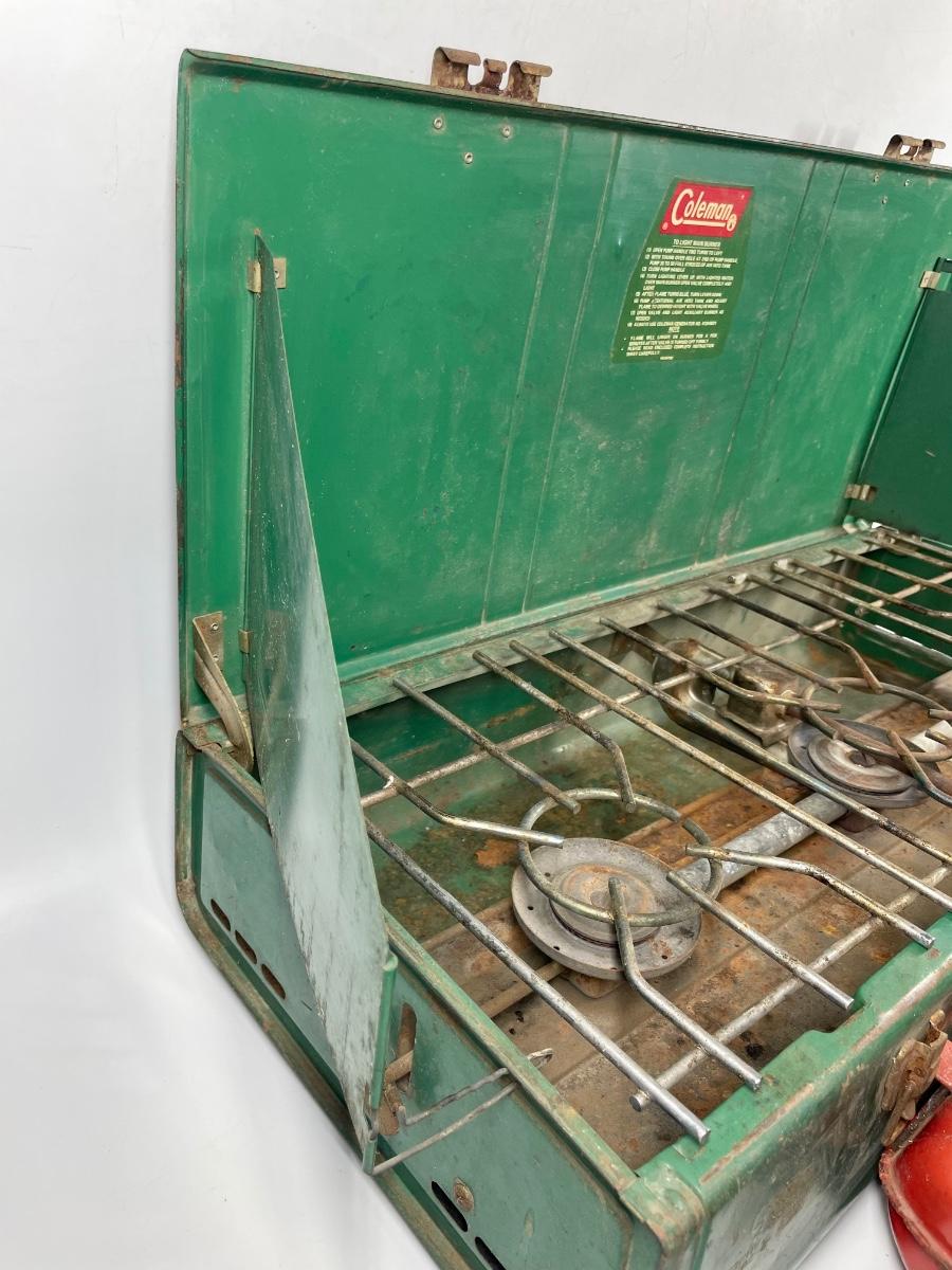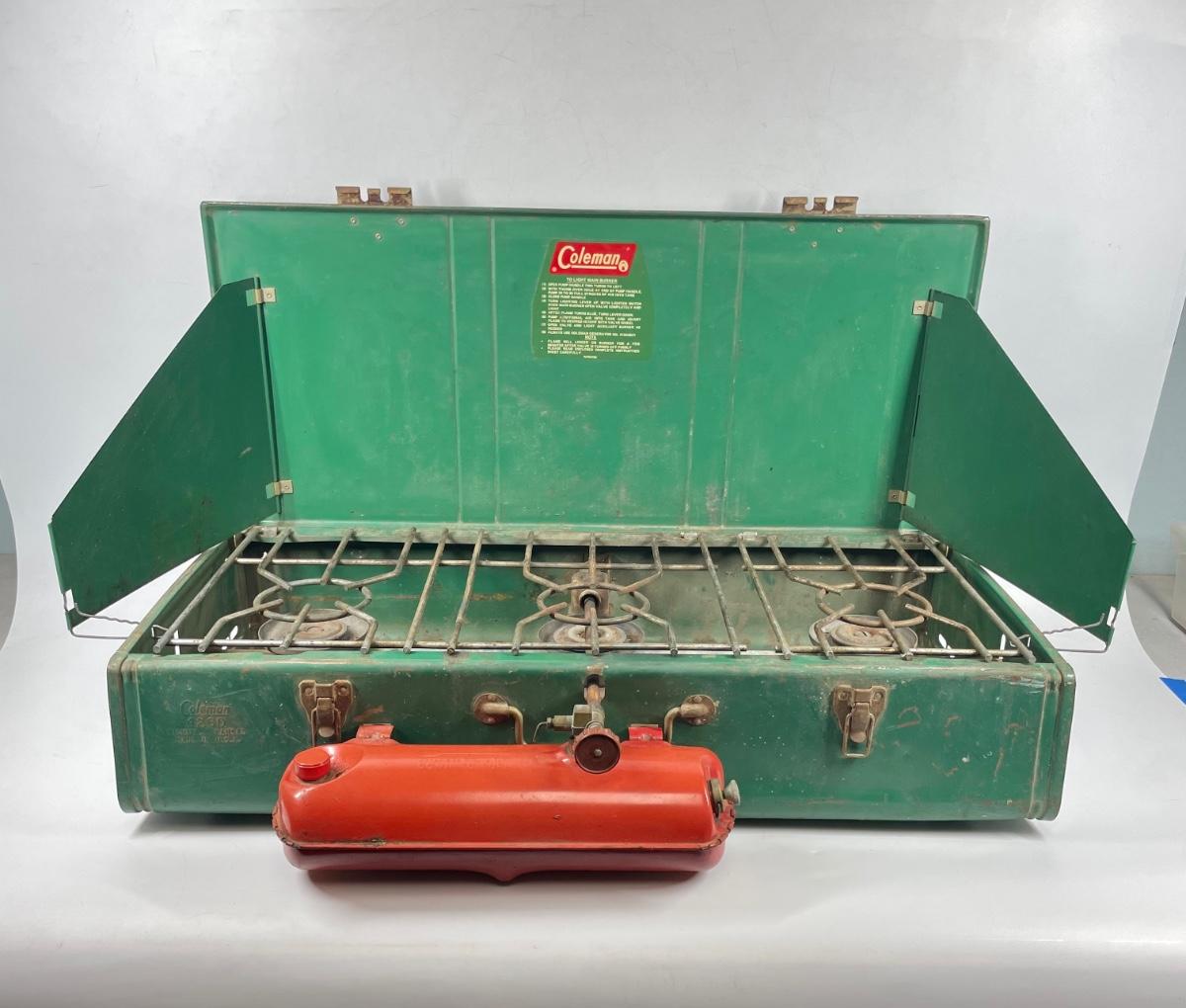 Vintage Coleman 3-Burner Gas Camping Stove. Model 426D. Includes red pump-style fuel tank.