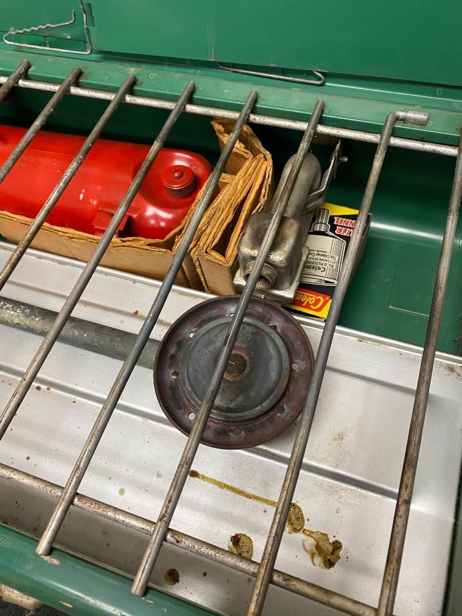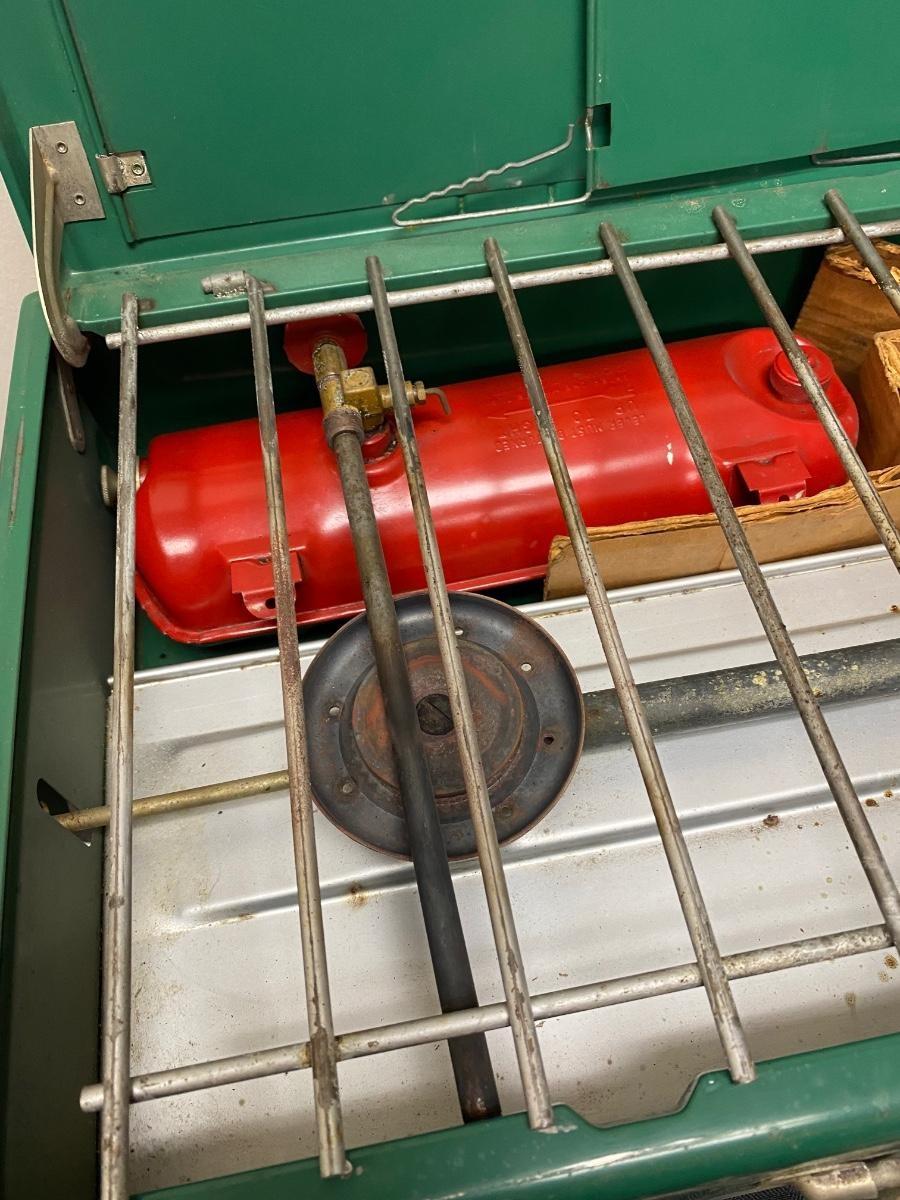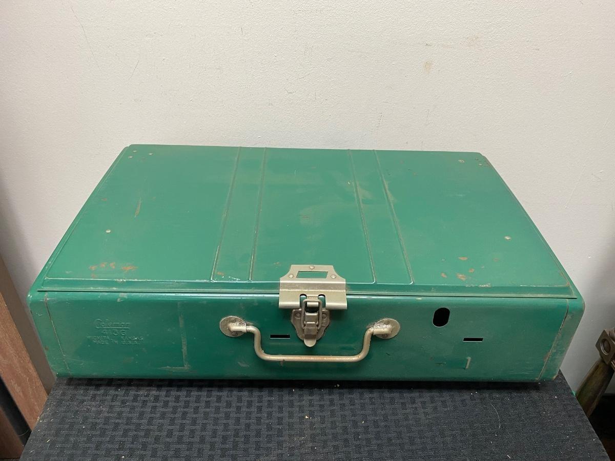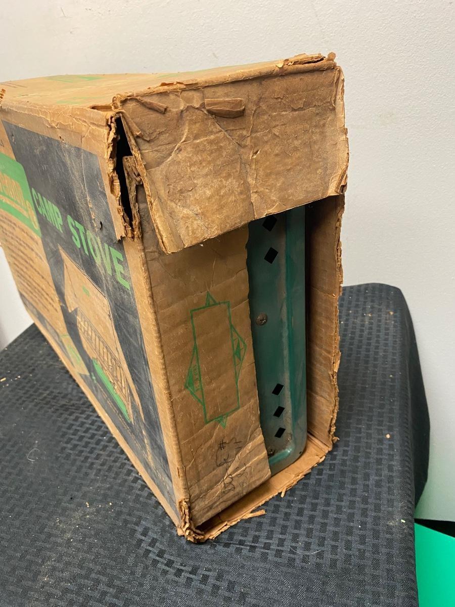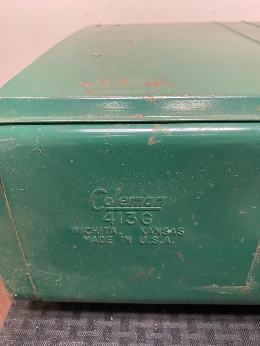 Vintage Coleman green camp stove. Model 413G with original box. Looks lightly used. Box is brittle from age. See photos. Two burner gas stove, perfect for camping or picnics. Untested.