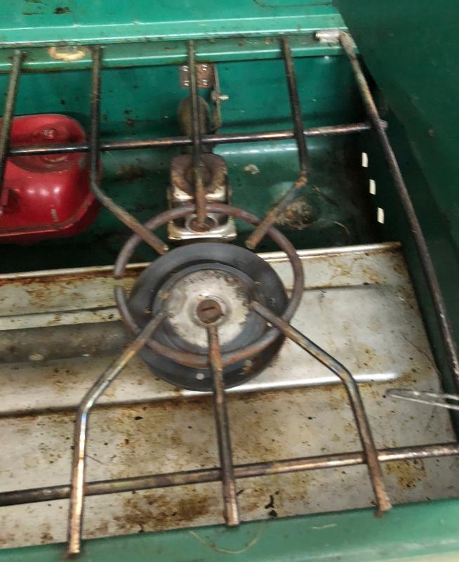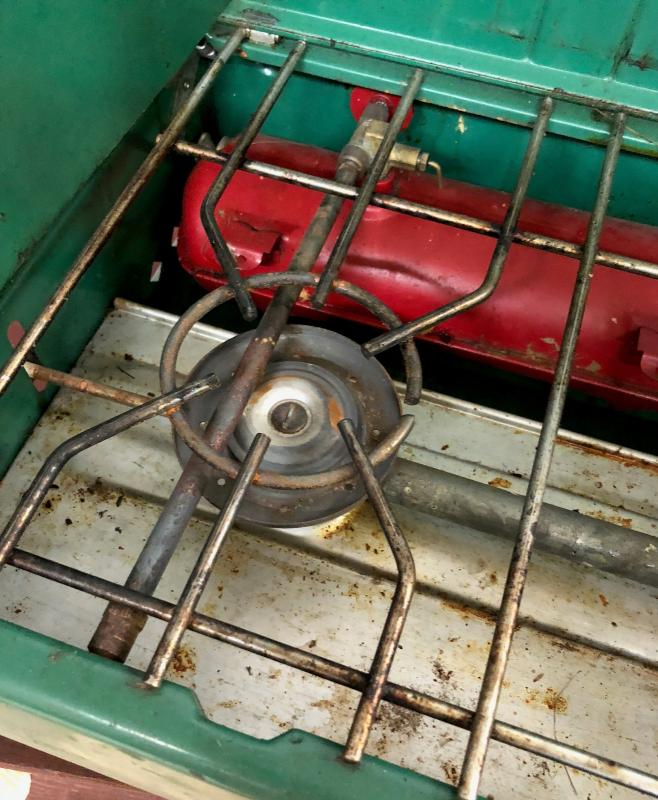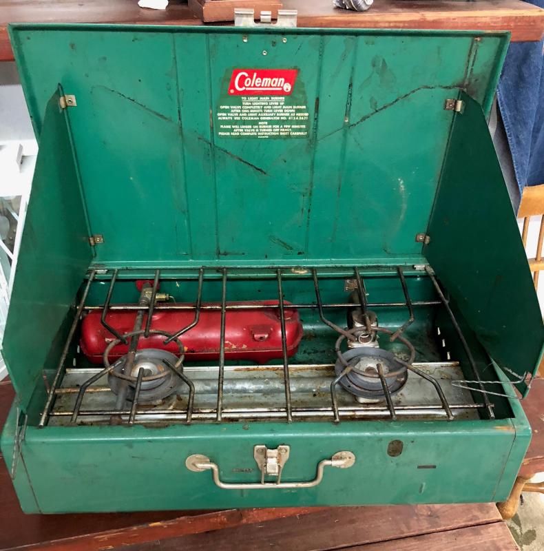 Here is a vintage two-burner camp stove from Coleman...White gas...Used condition...