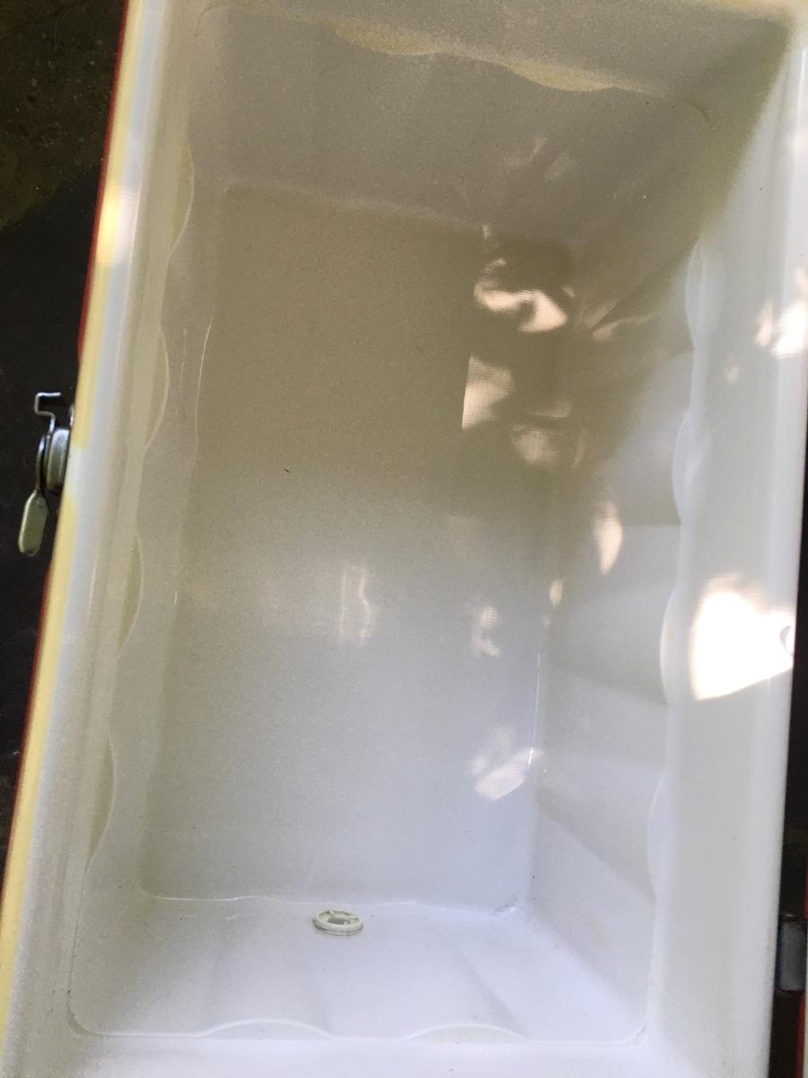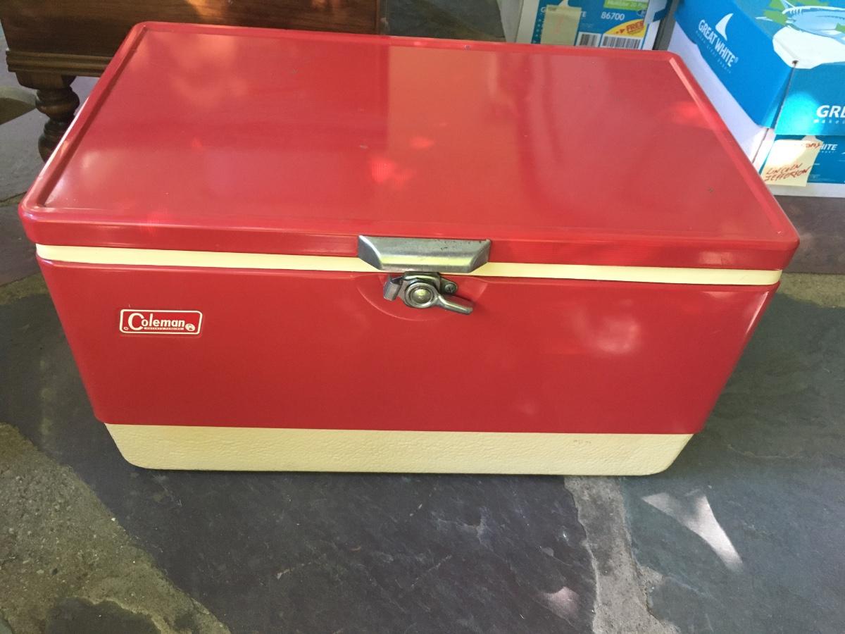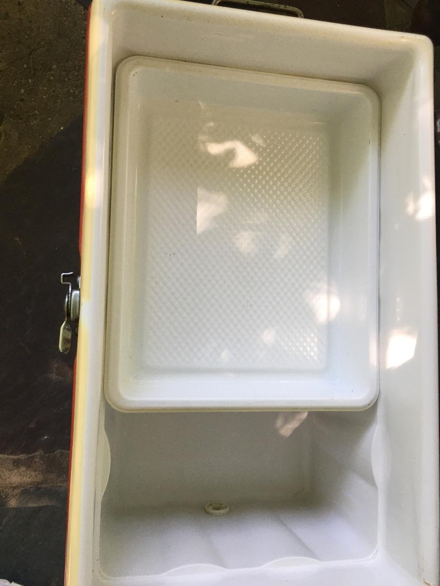 Vintage cooler. . Shows some tiny rust spots on top as noted in picture but in overall good condition. Removable inside tray. If this cooler could only talk about all the good times it’s seen“🦆.
