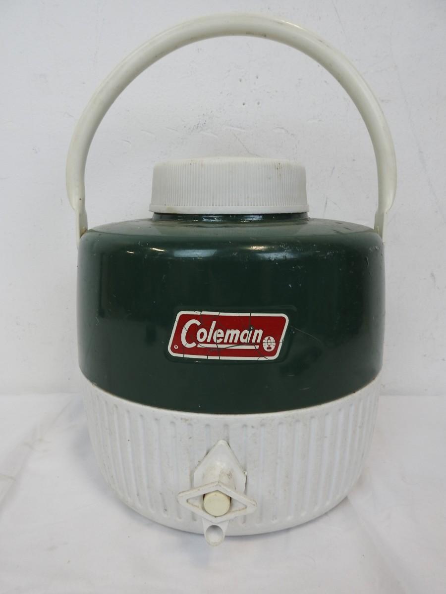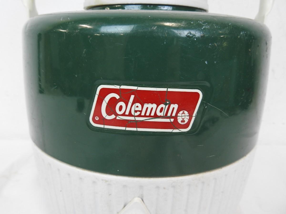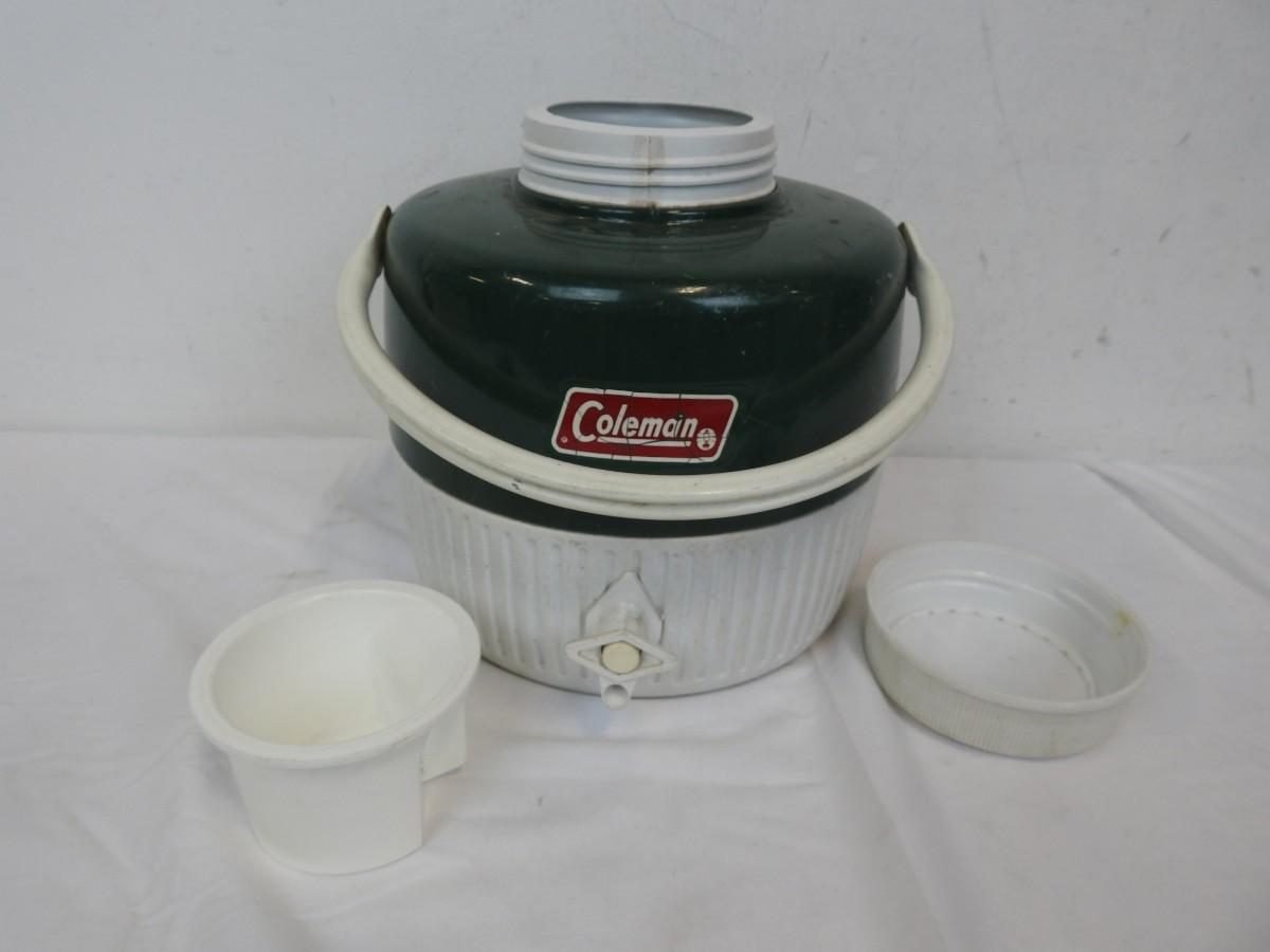 Vintage Coleman Jug w/Cup, White/Green, Spout Works