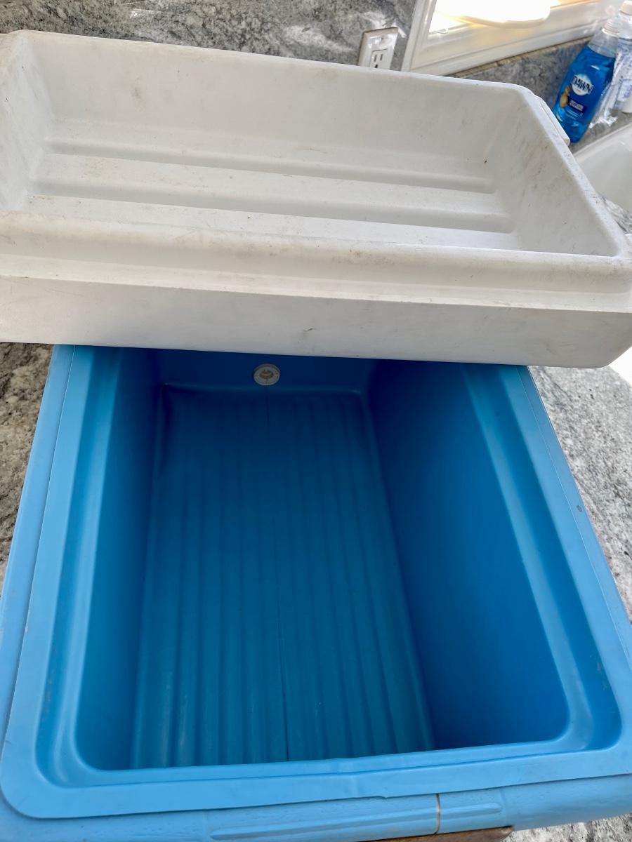 Vintage cooler in fair condition. This is a Coleman cooler, but it’s missing its labels. Measures 20 x 14 x 12 inches.