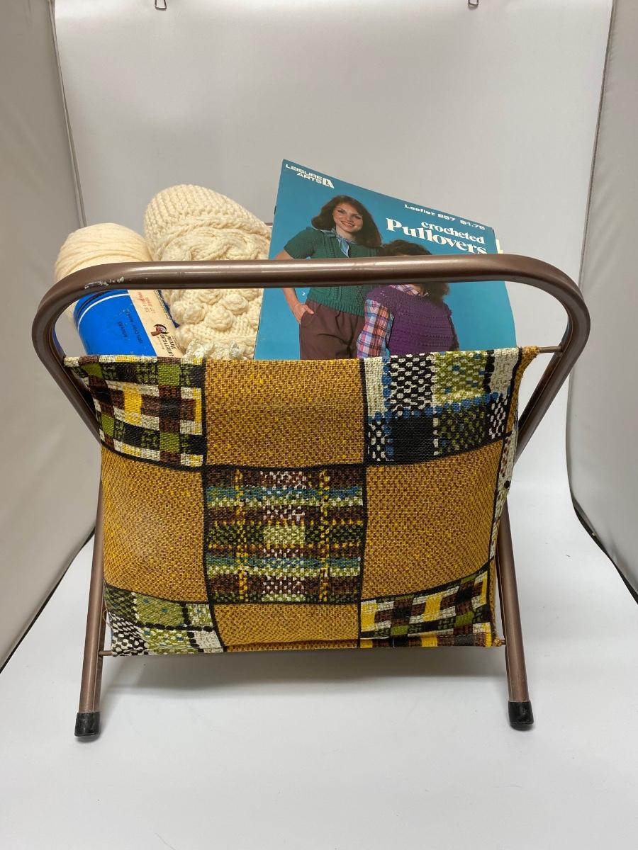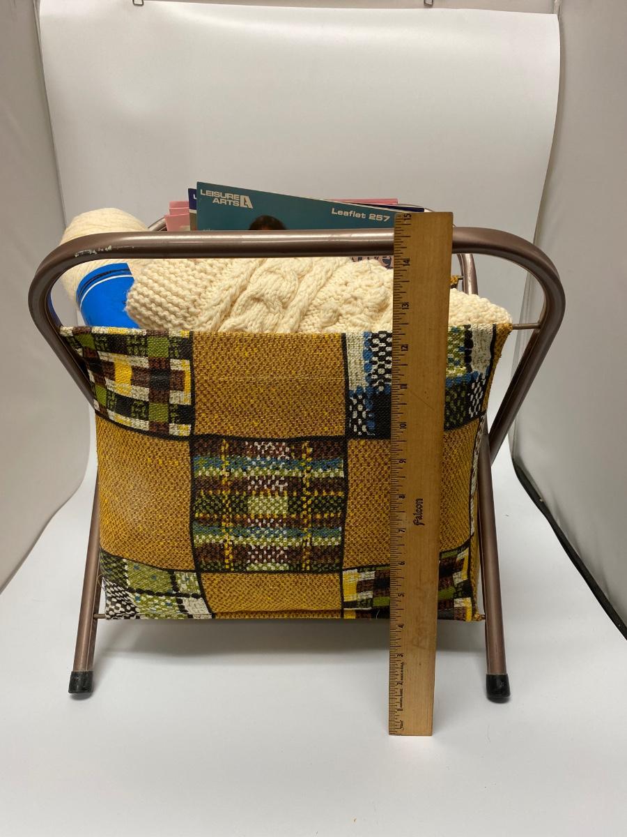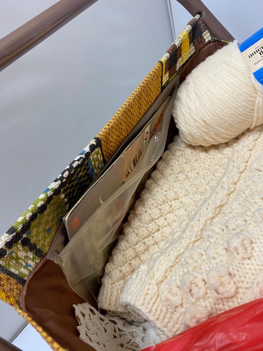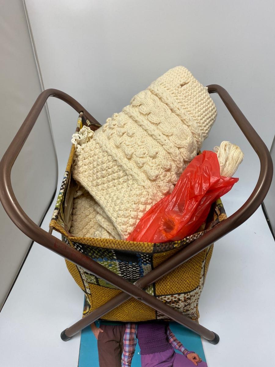 Vintage Collapsible Yarn Basket with Unfinished Sweater Project Inside