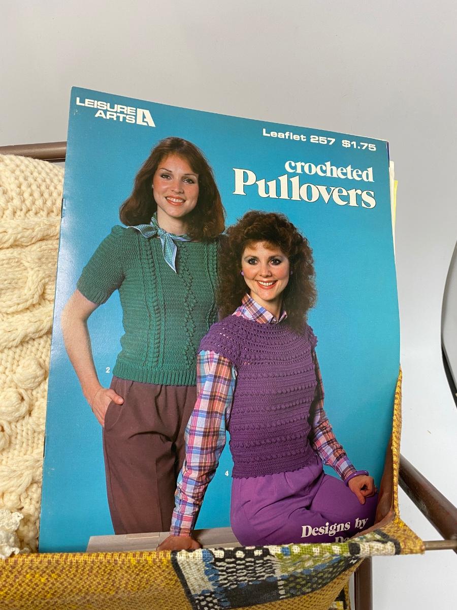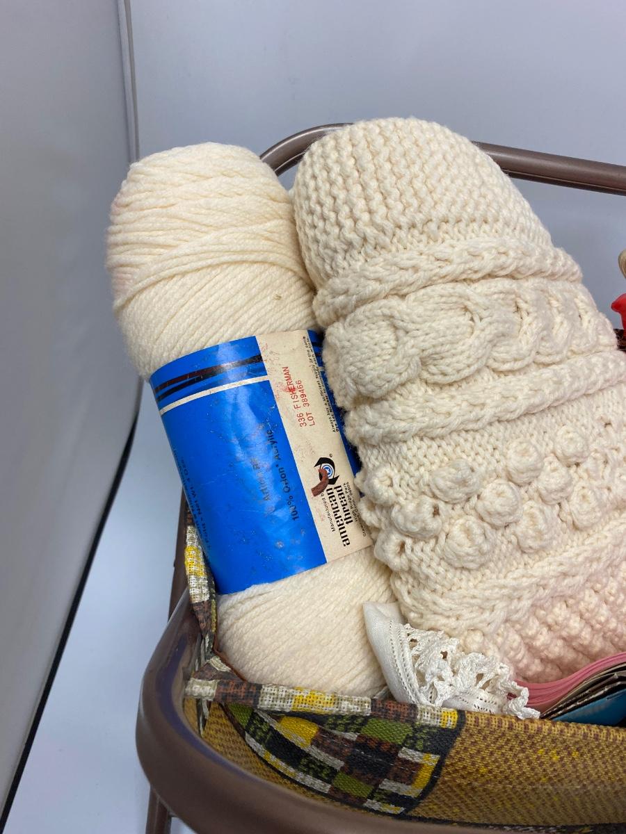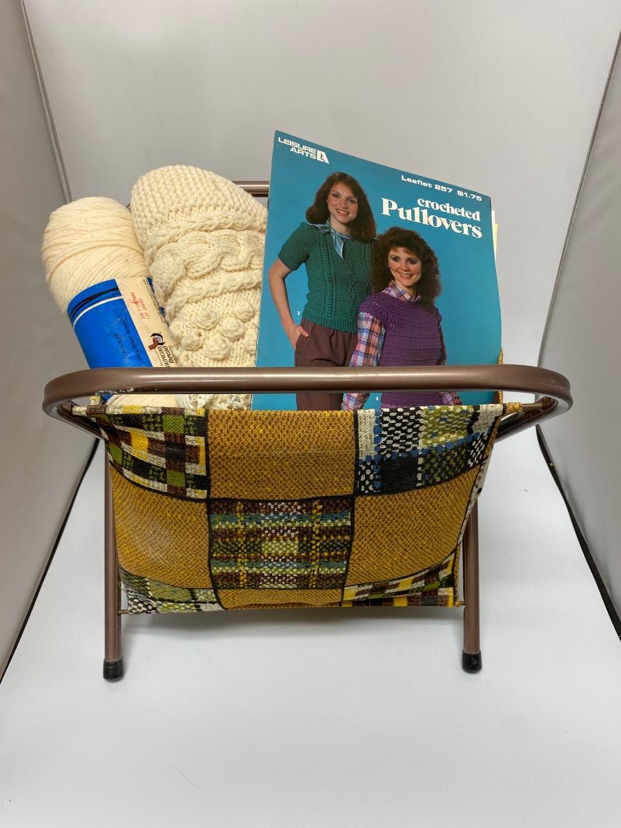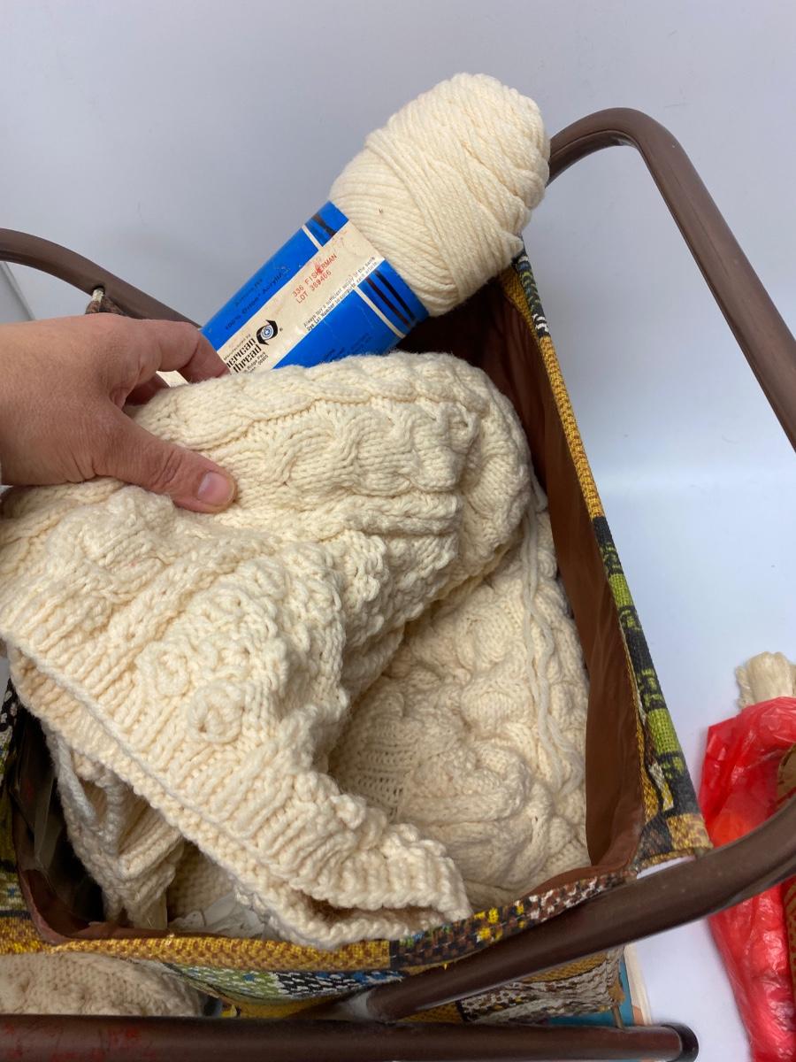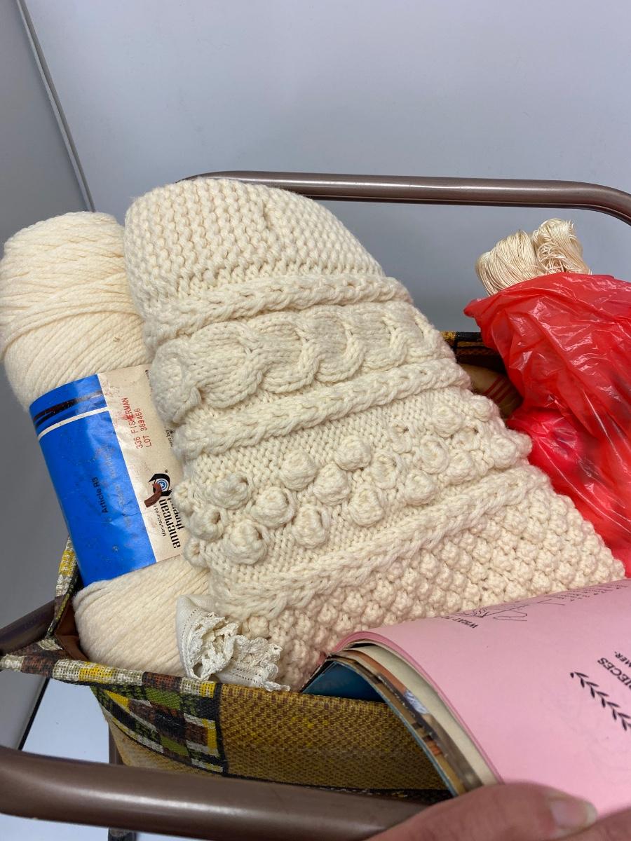 Vintage collapsible yarn basket with unfinished sweater project still in it. Crochet cable knit sweater pieces, booklet, and yarn. Basket is in good vintage condition.