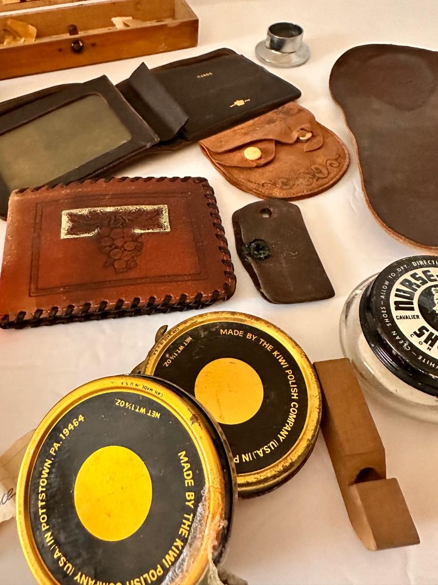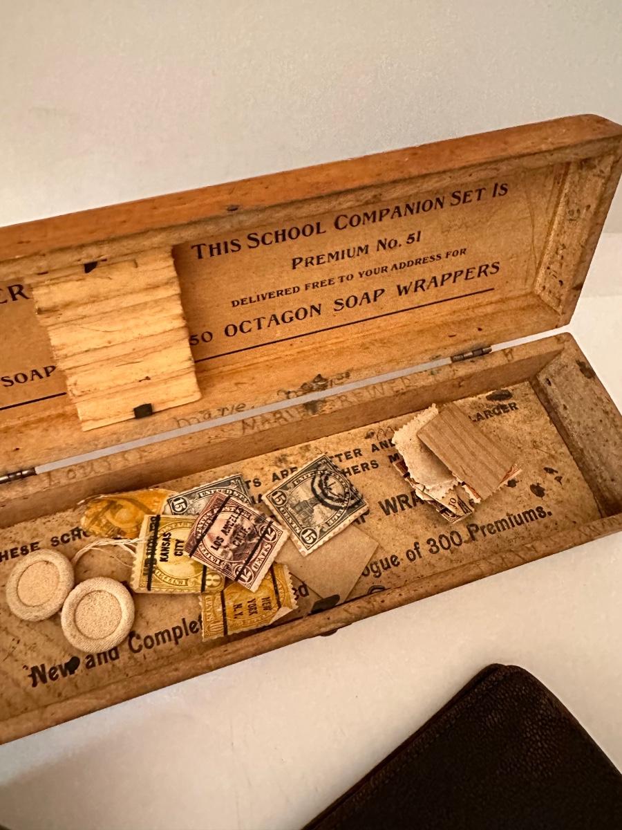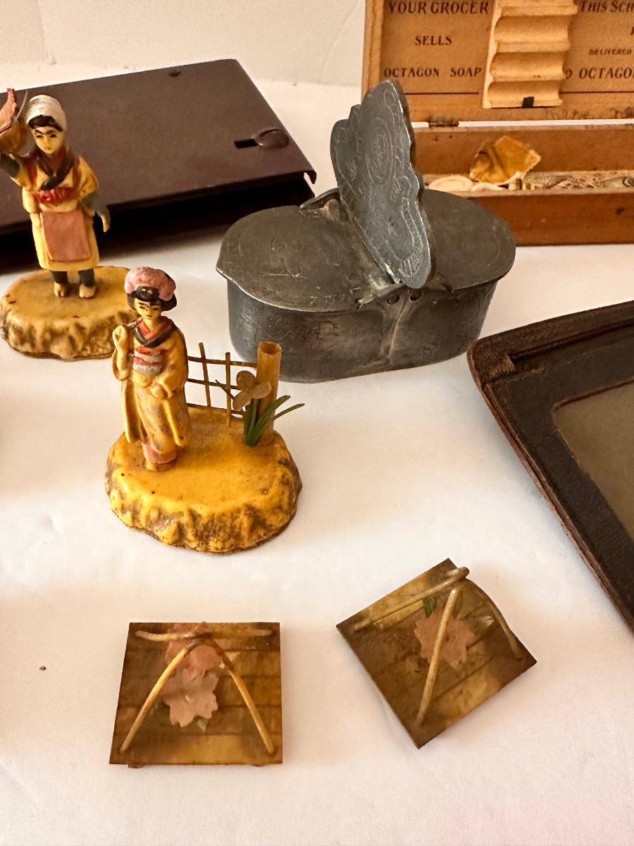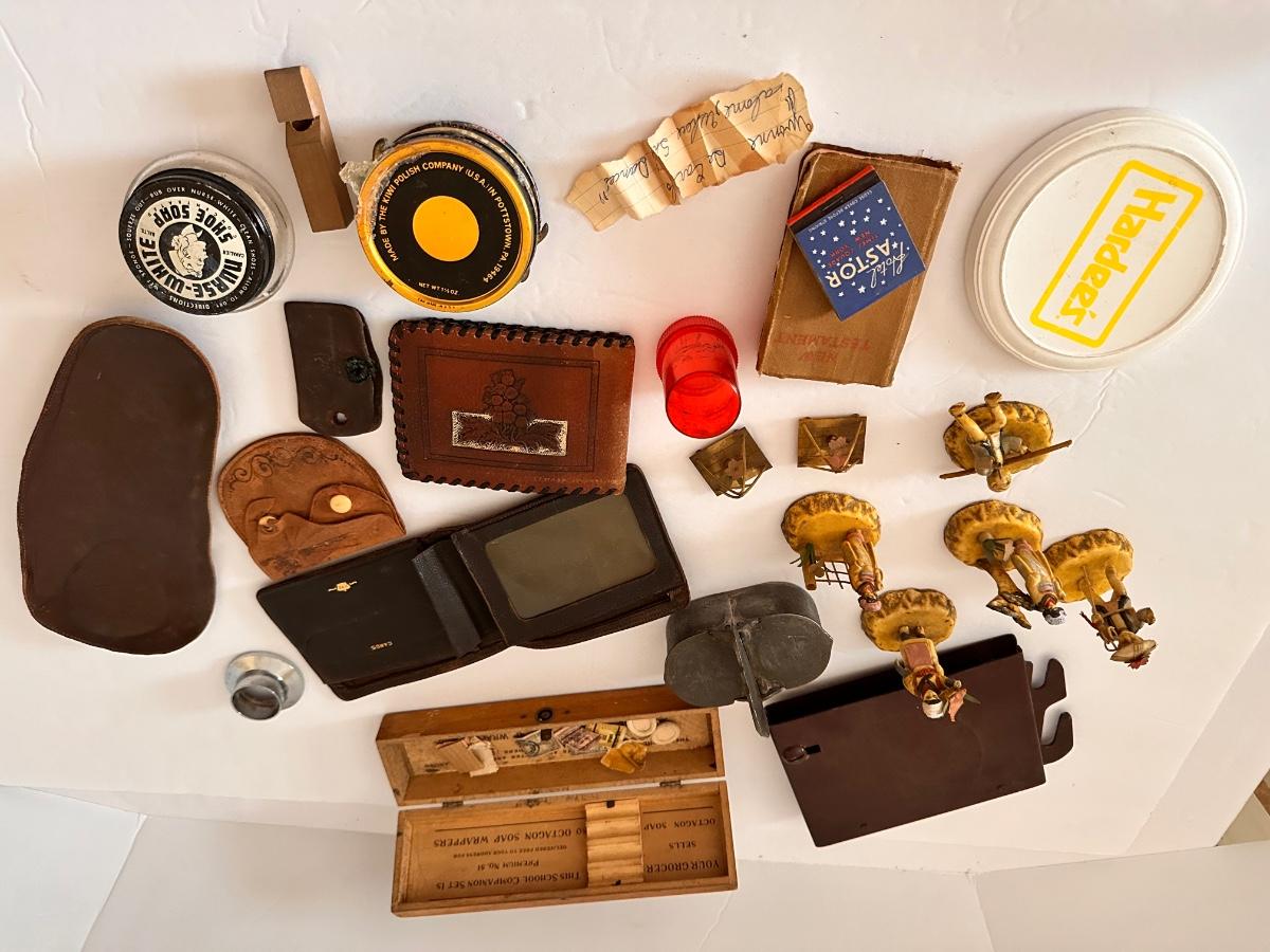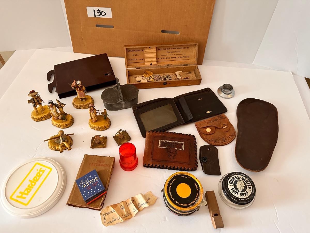 Vintage Collectable Lot, Shoe Soap, Figurines, Vintage Wallets, Octagon Soap Pencil Box and More As Pictured