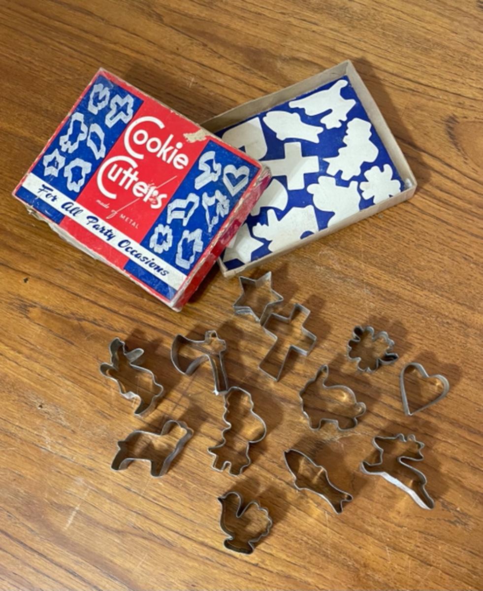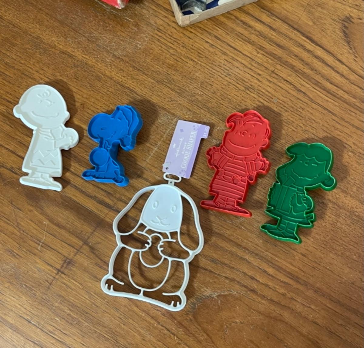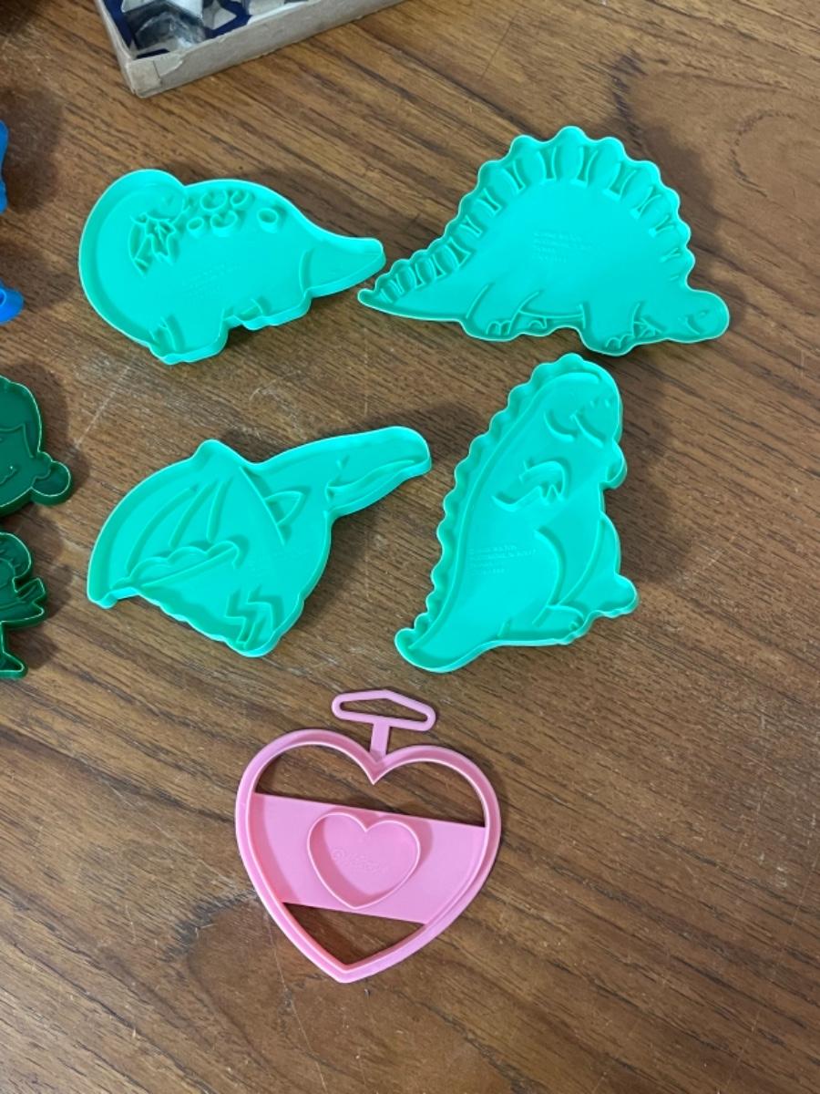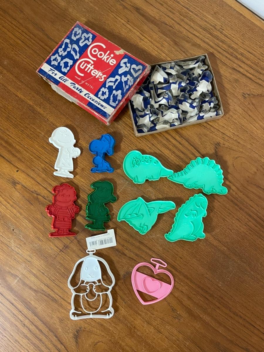 4 pc Charlie Brown /Peanuts (United Feature Syndicate), Hallmark Bunny and Heart, 4 pc Wilton Dinosaurs. Box of metal cutters are unbranded and show signs of storage wear /age. All appear unused or minimally used and in very good condition. Shipping available.