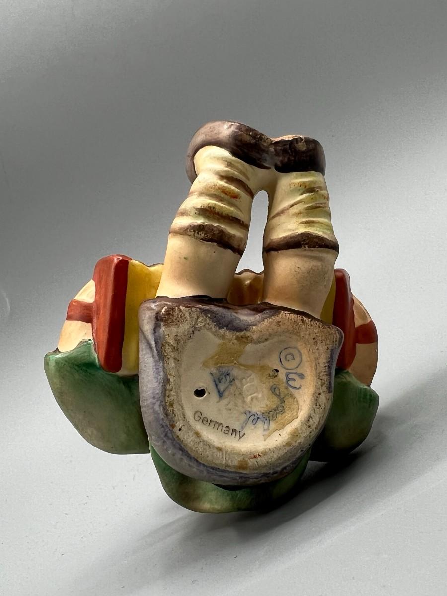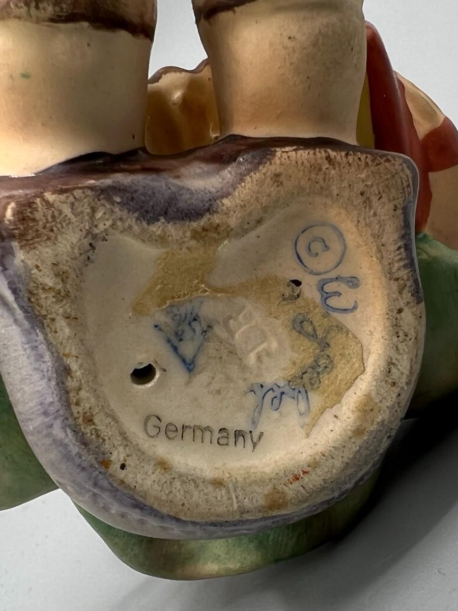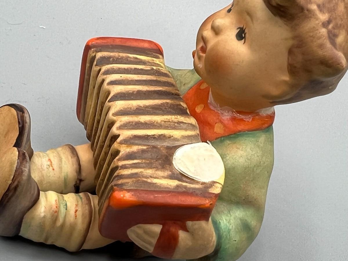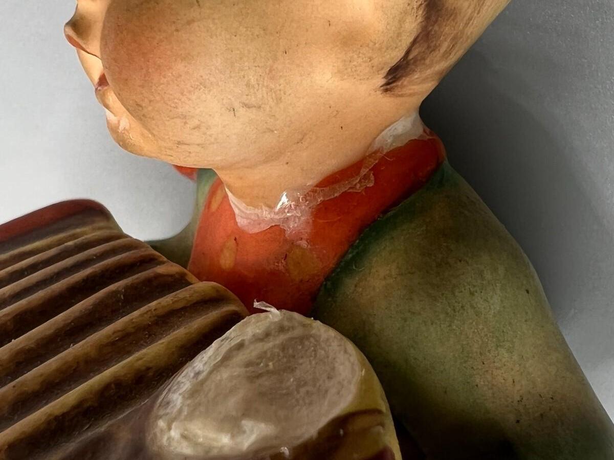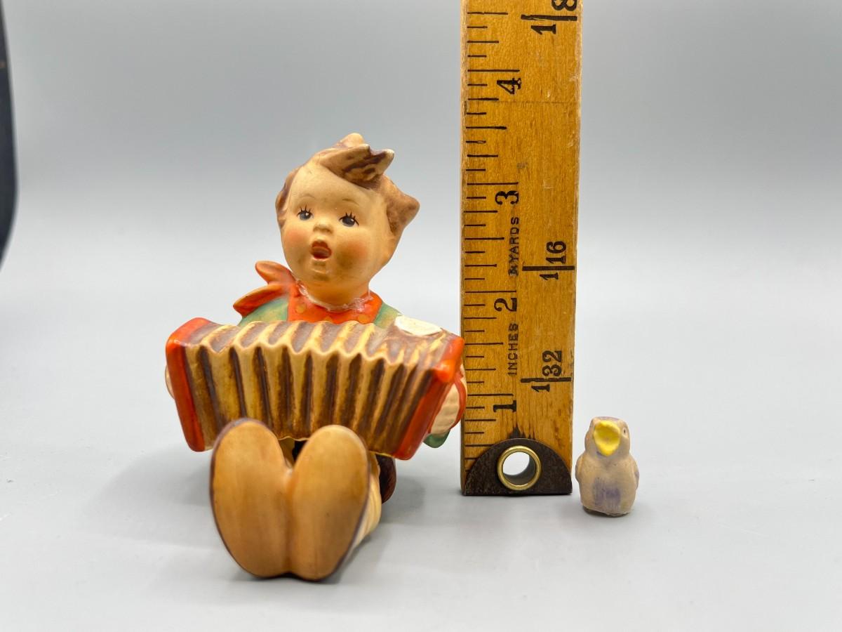 Vintage Collectible Goebel Hummel Figurine Lets Sing Singing Boy with Bird, the bird has been cracked off and there have been some repairs to the boy's neck/head. There is no other significant damage to the piece and is in fair condition, check pictures for more details and for sizing.