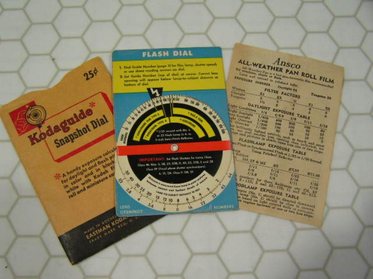 Vintage collectible photographers guides. Kodak "Kodaguide" snapshot/flash exposure calculator AND Ansco All-Weather Pan Roll Film user guide. Great additions to your collection display