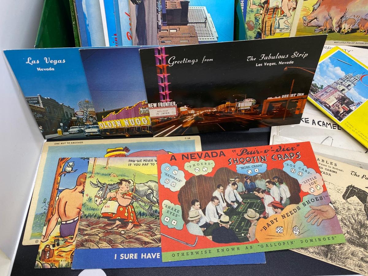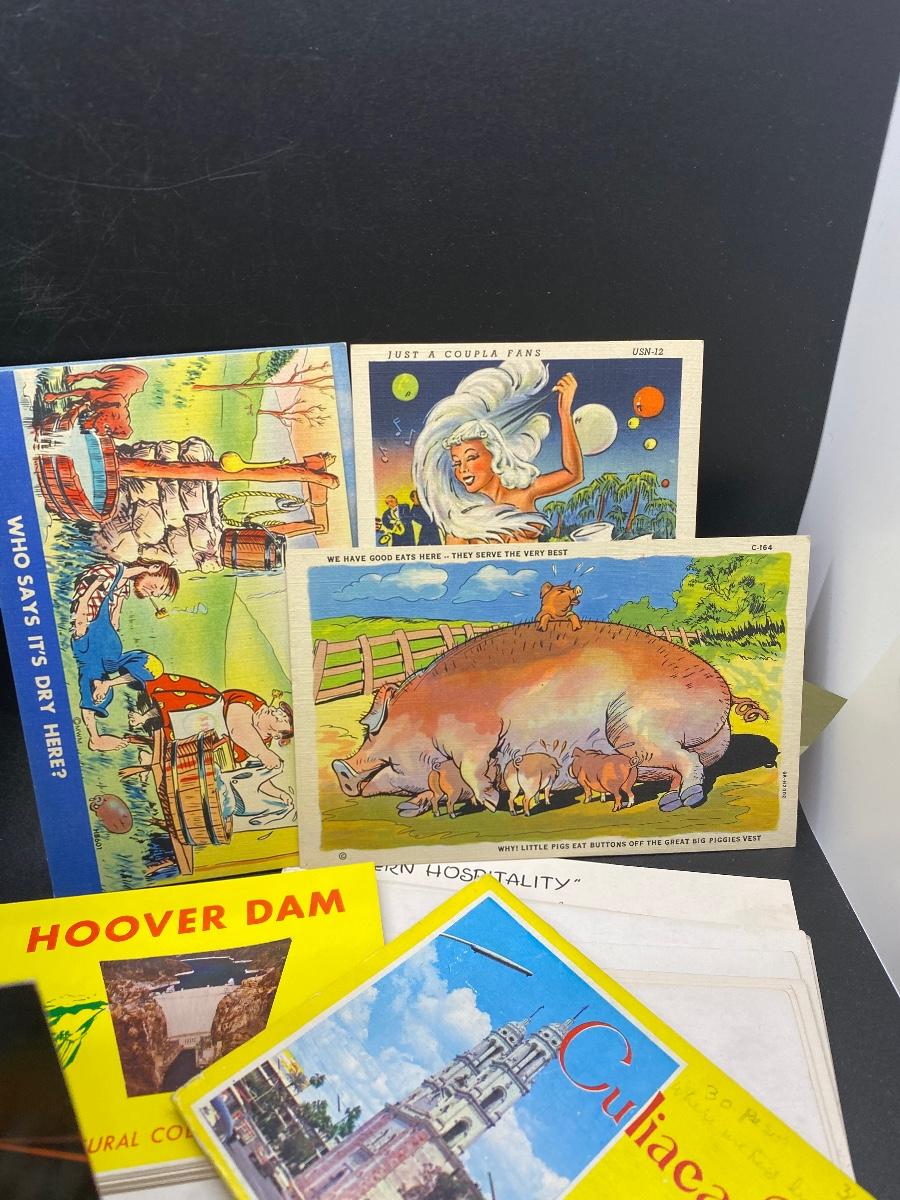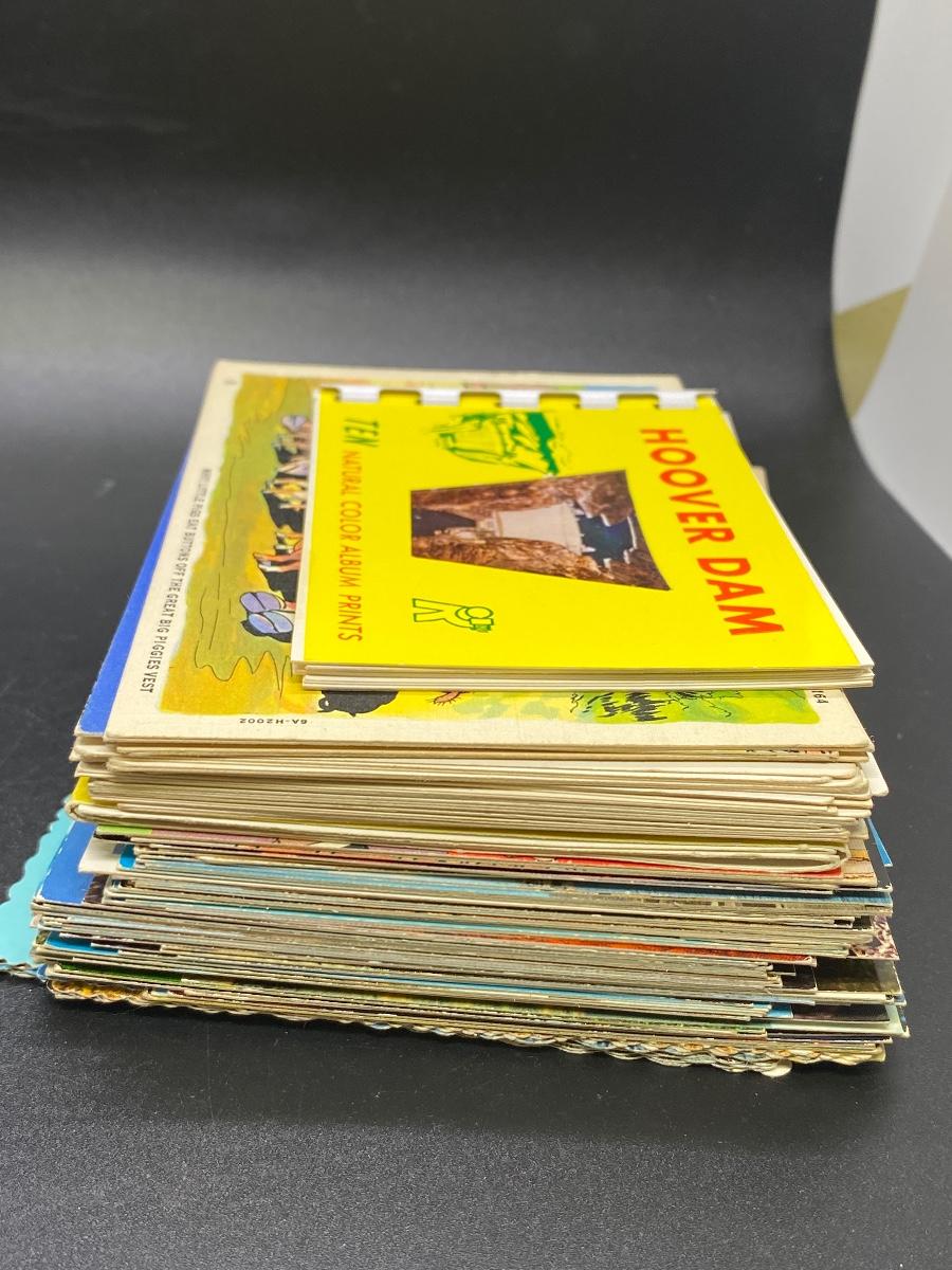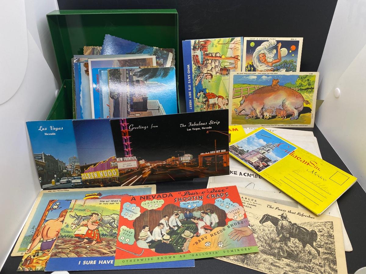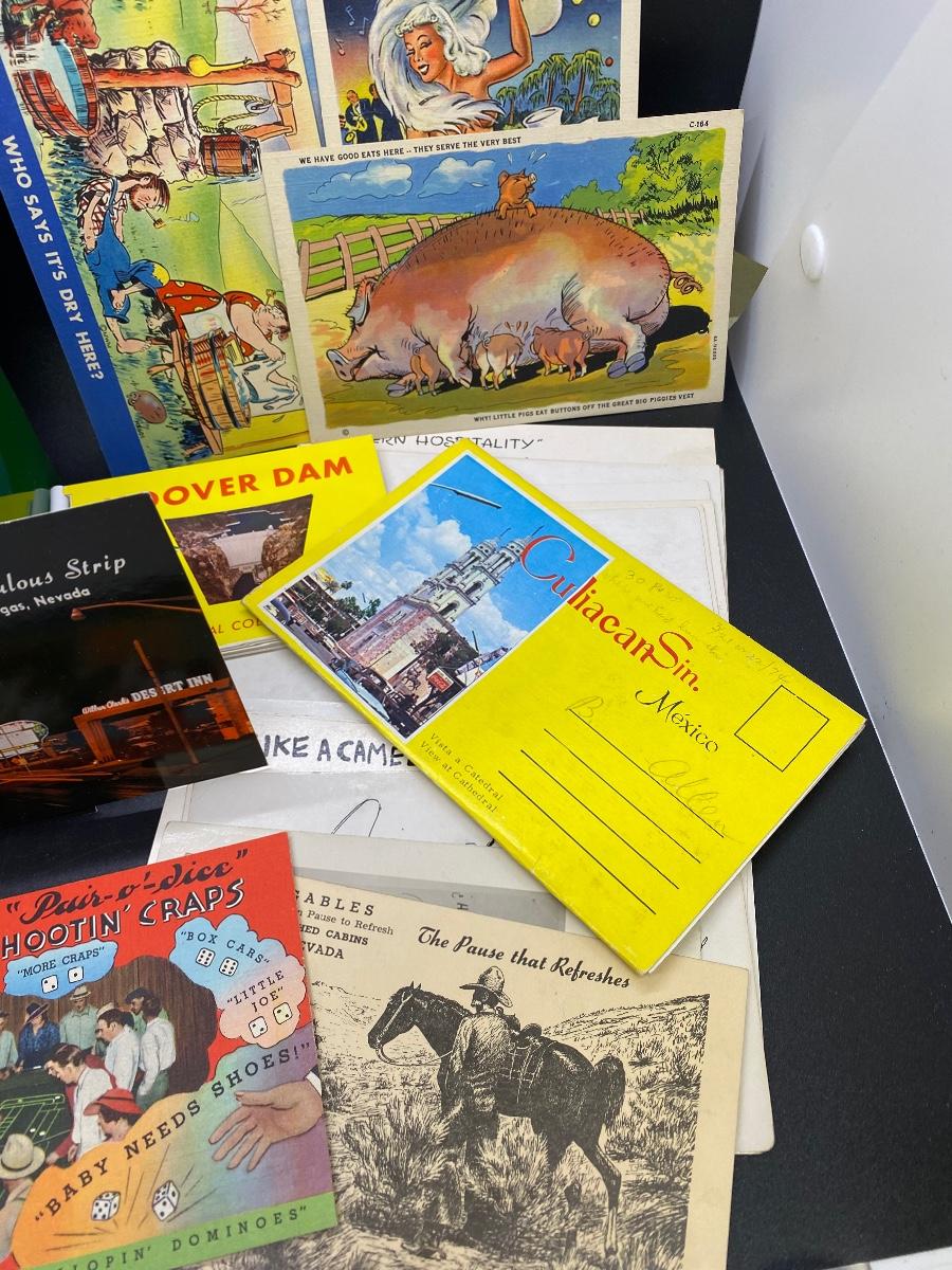 Vintage Collectible Las Vegas, Hoover Dam, Mexico Souvenir Postcards in a J. Chen & Co Metal Recipe Box