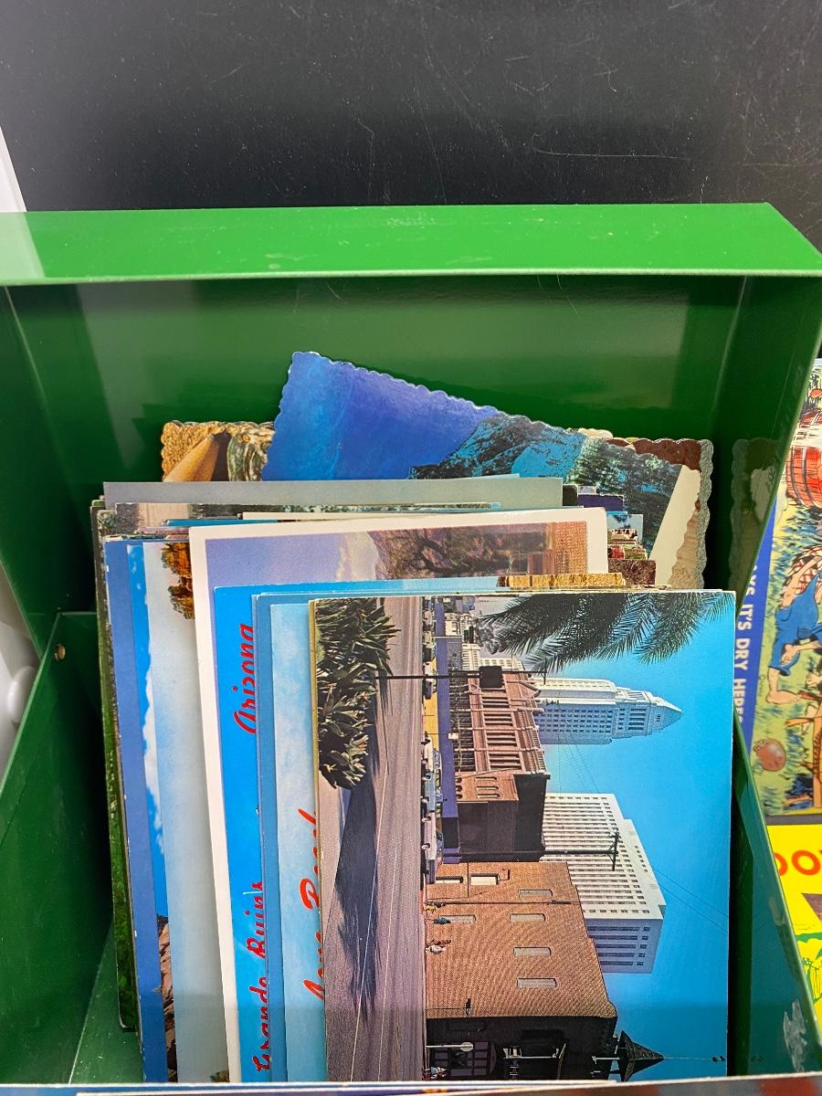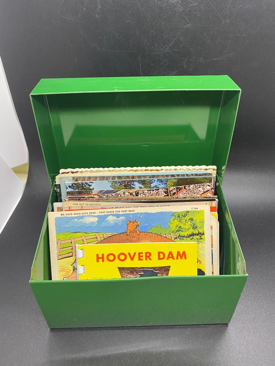 Vintage Collectible Las Vegas, Hoover Dam, Mexico Souvenir Postcards in a J. Chen & Co Metal Recipe Box, there are no significant rips or tears to any of the postcards and is in good vintage condition. The metal green box is also in good condition, check pictures for more details and for sizing.