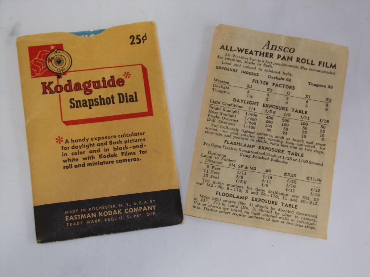 Vintage collectible photographers guides. Kodak "Kodaguide" snapshot/flash exposure calculator AND Ansco All-Weather Pan Roll Film user guide. Great addition to your collection display. As pictured.