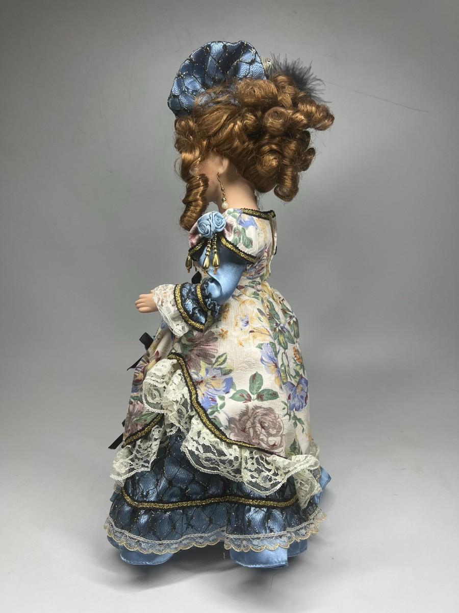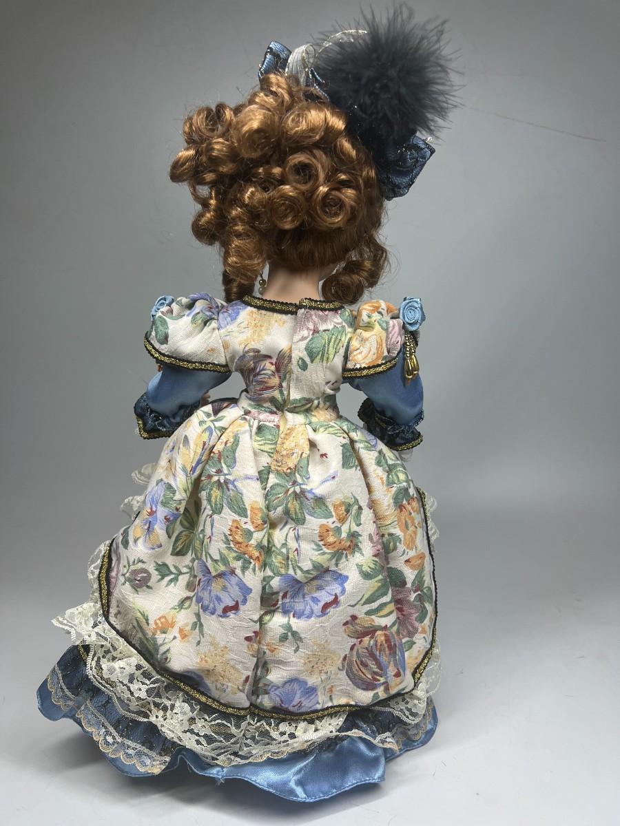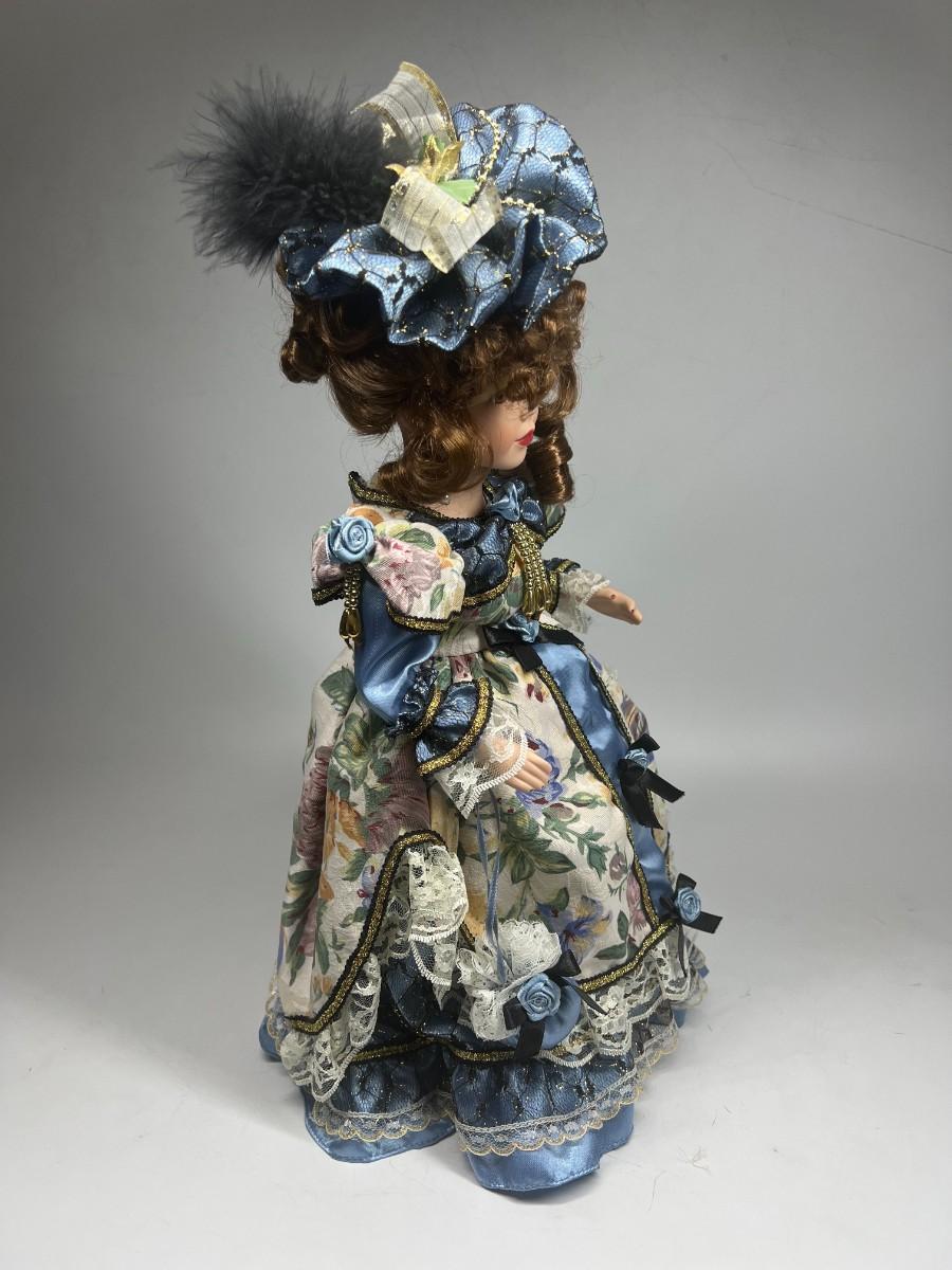 Vintage Collectible Porcelain Doll with Stand Fancy Blue Dress. Good previously displayed condition.