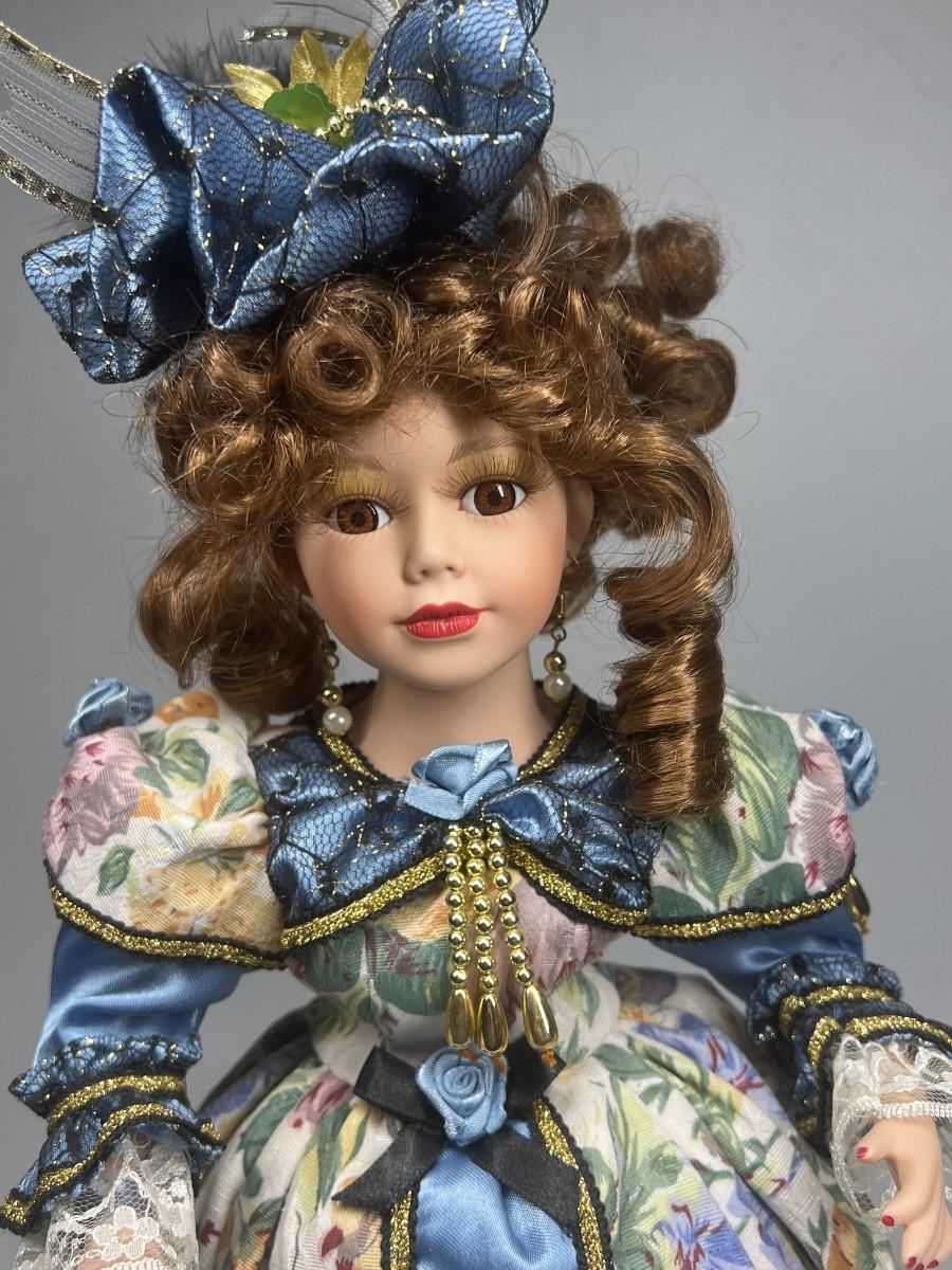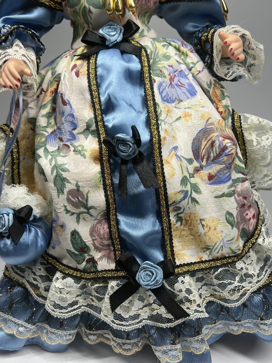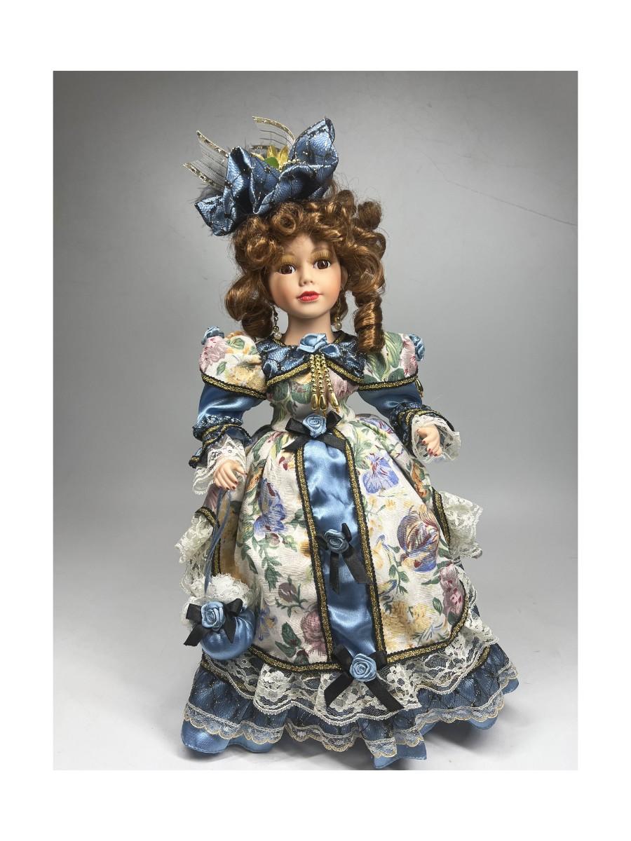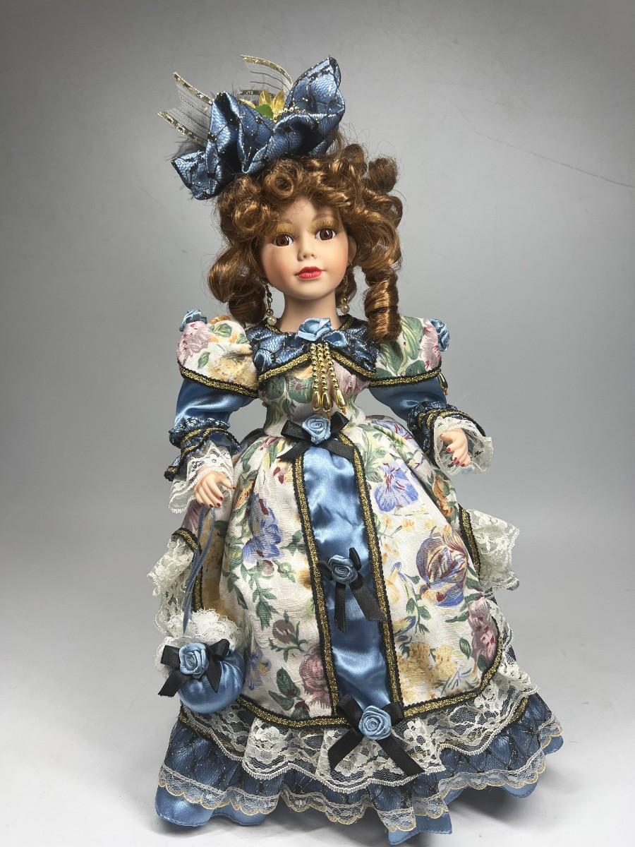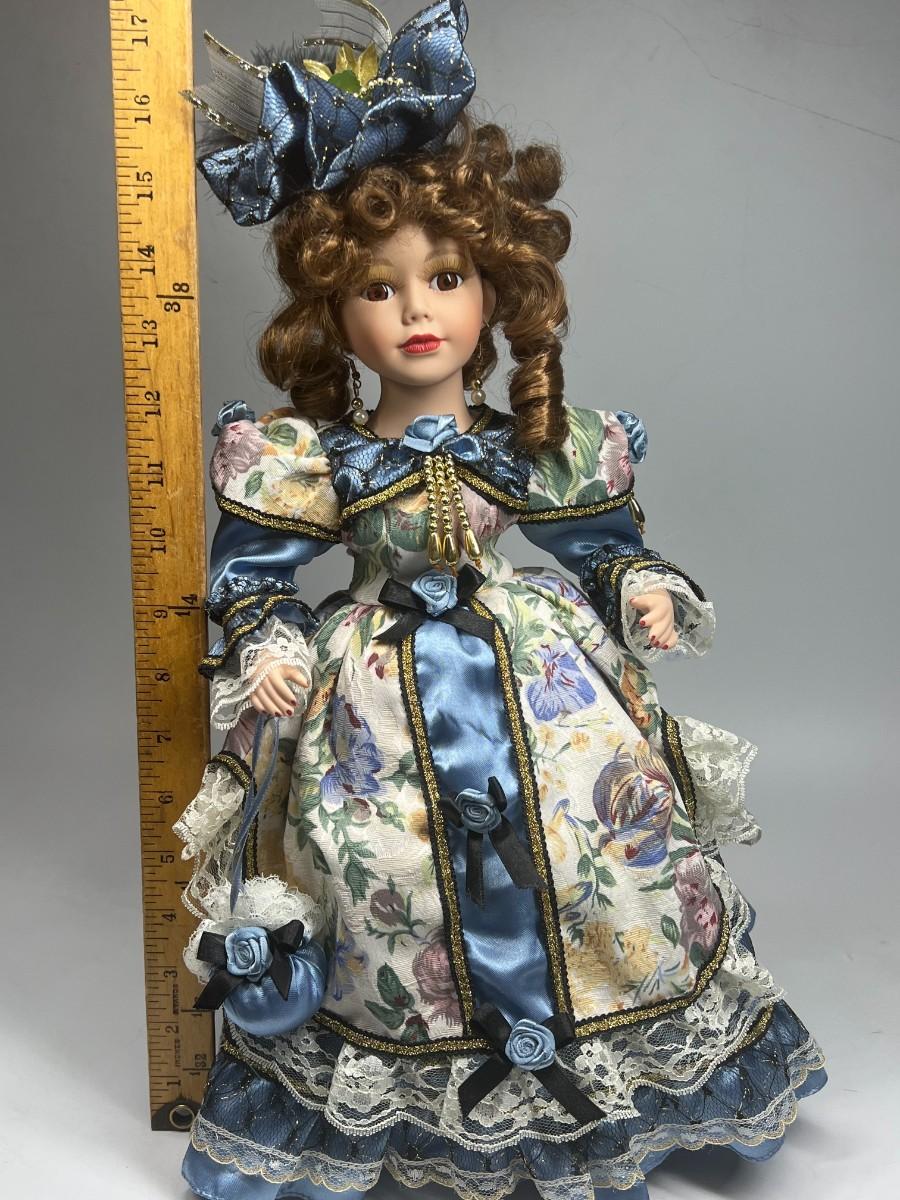 Vintage Collectible Porcelain Doll with Stand Fancy Blue Dress