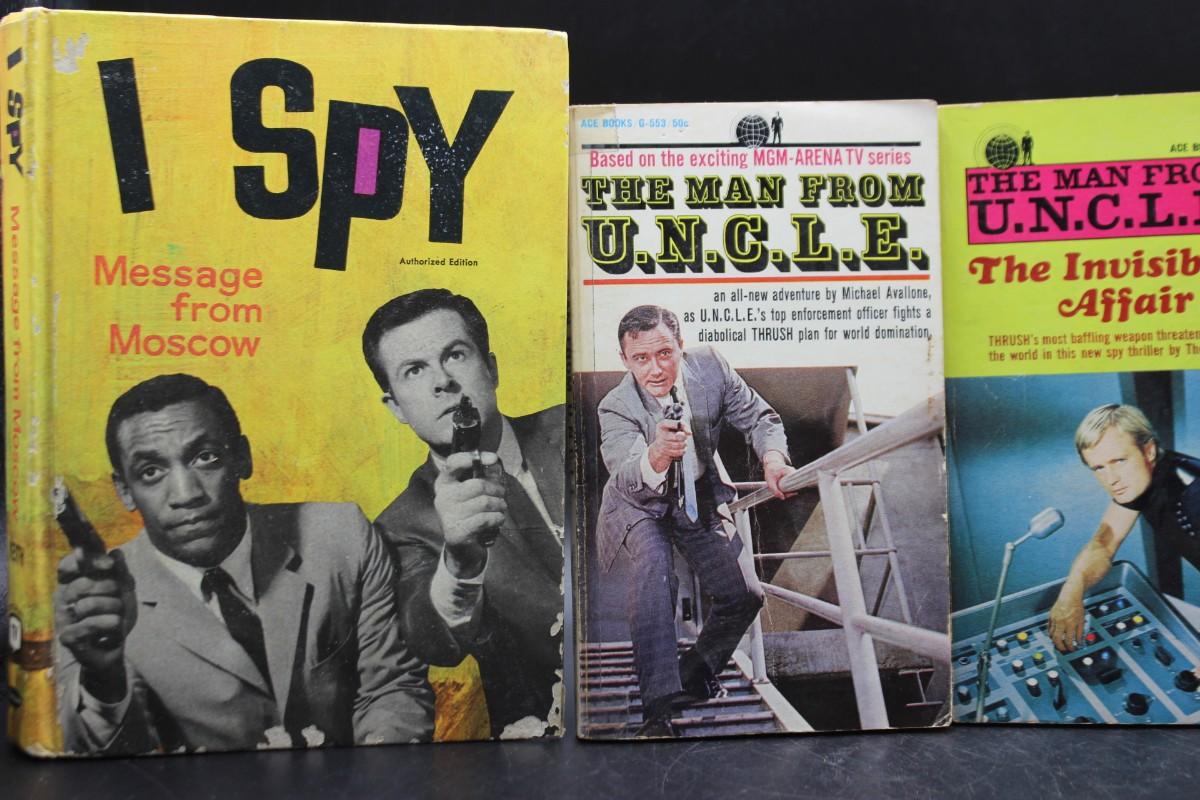 Vintage Collectible Pulp Television Spy Novels The Man From U.N.C.L.E & I Spy, one of the covers from The Man From U.N.C.L.E. has been torn, but there is no other significant damage to any of the books and is in good vintage condition. Check pictures for more details and for sizing. The I Spy novel is a hard cover, the rest are paper back.