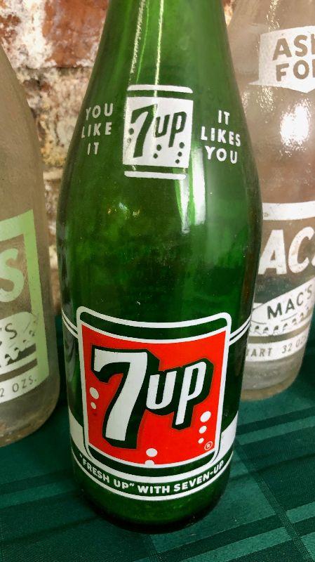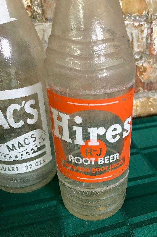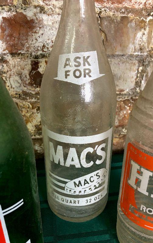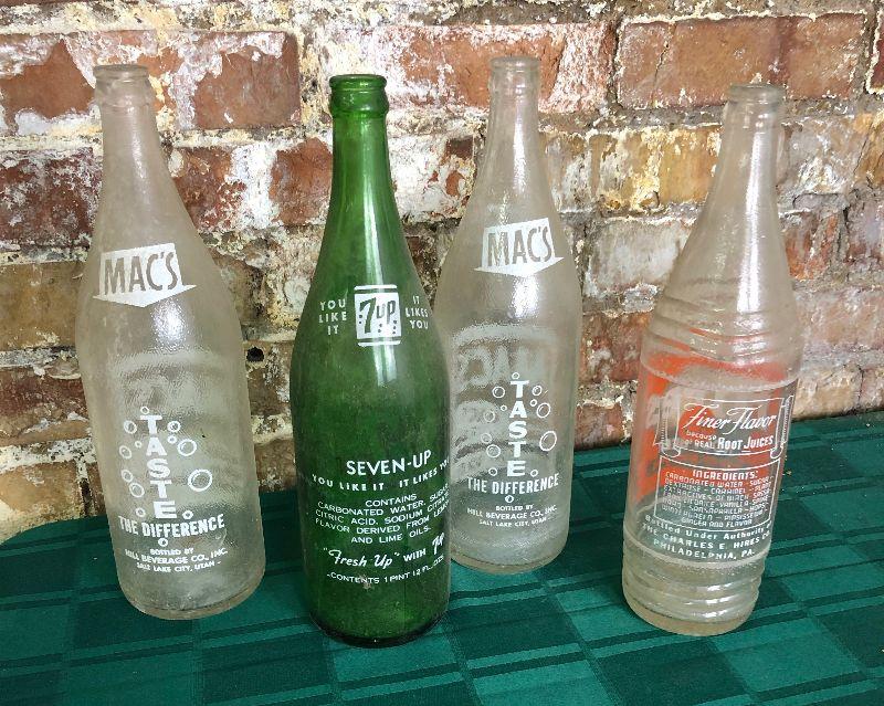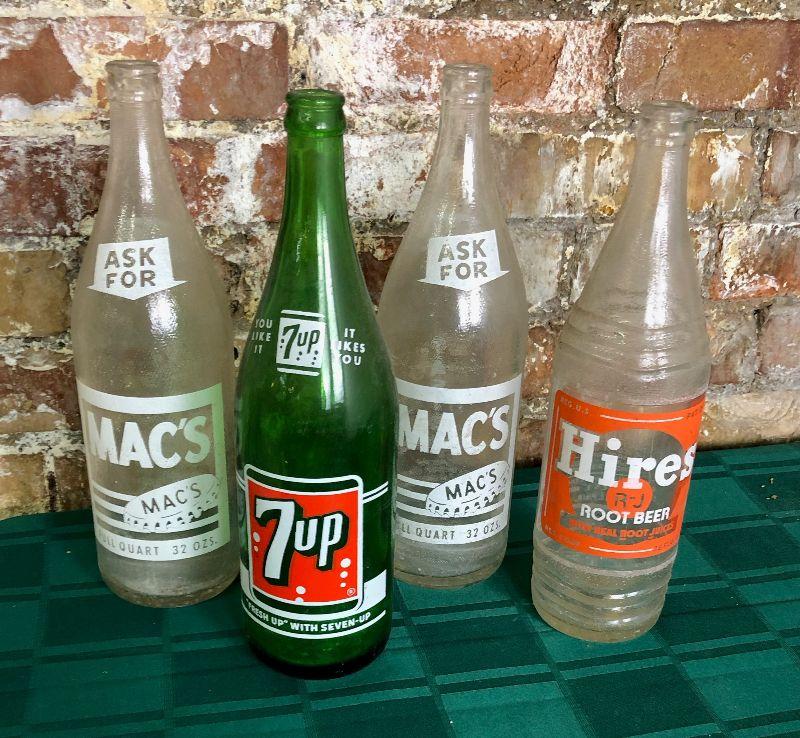 Mac's..7up and Hire's Root Beer in this lot of four quart size collectible pop bottles...Good condition on the ACL graphics...