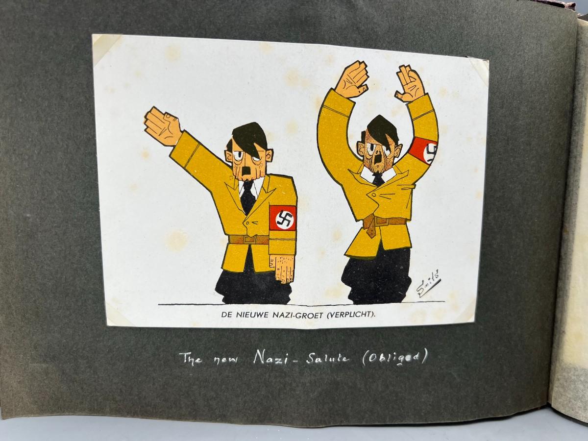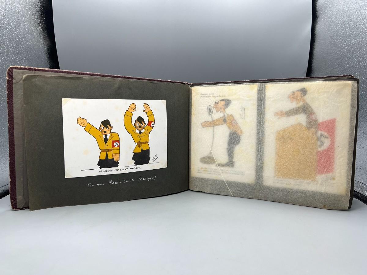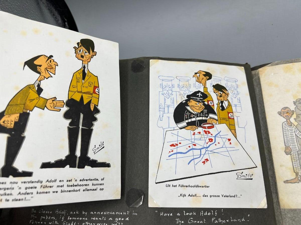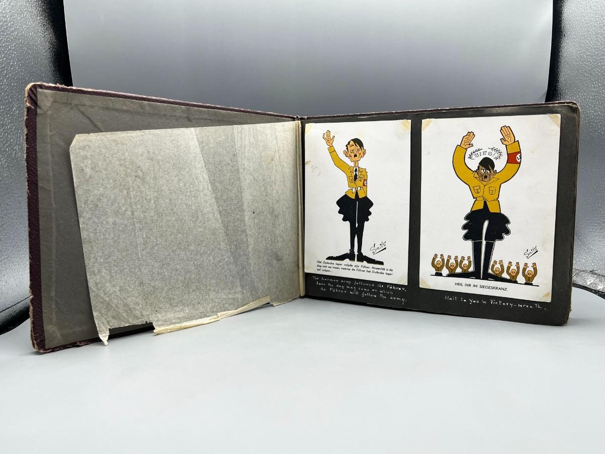 Vintage Collectible WWII Era Picture Album Scrapbook Postcards Photos Hitler Germany. Rare anti-Nazi novelty postcards by Dutch artist Smits, B&W postcards and photos. Some of the pages have names and translation under the photos. Pages have worn from age but postcards and photos inside in good vintage condition.