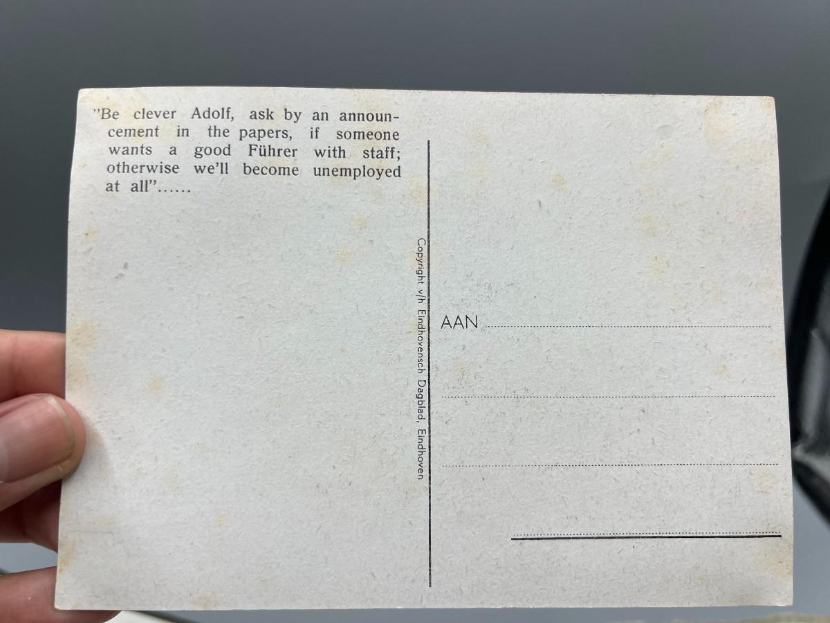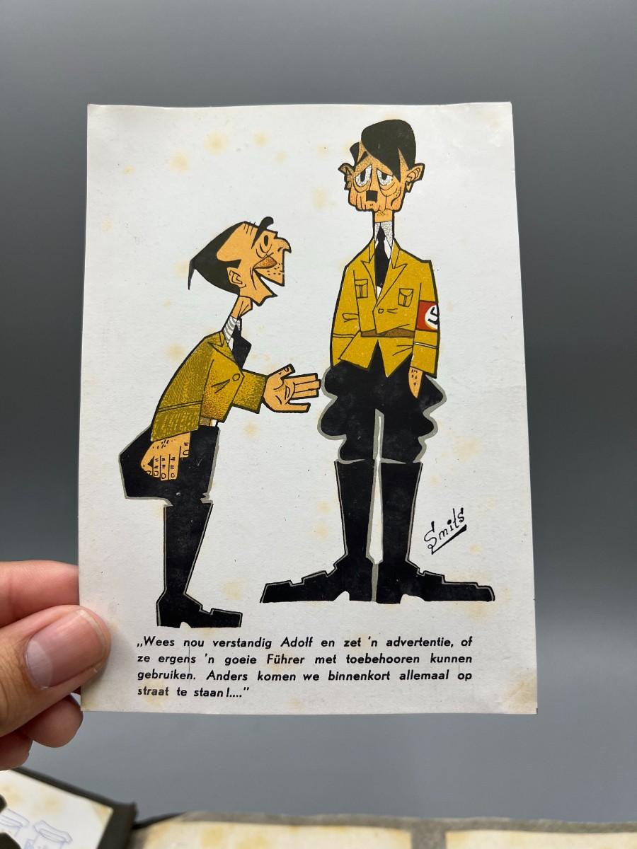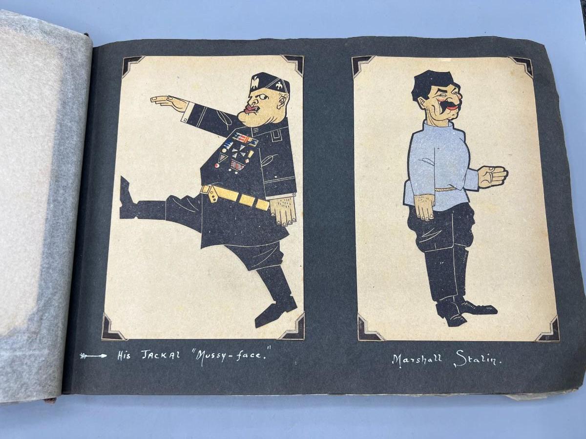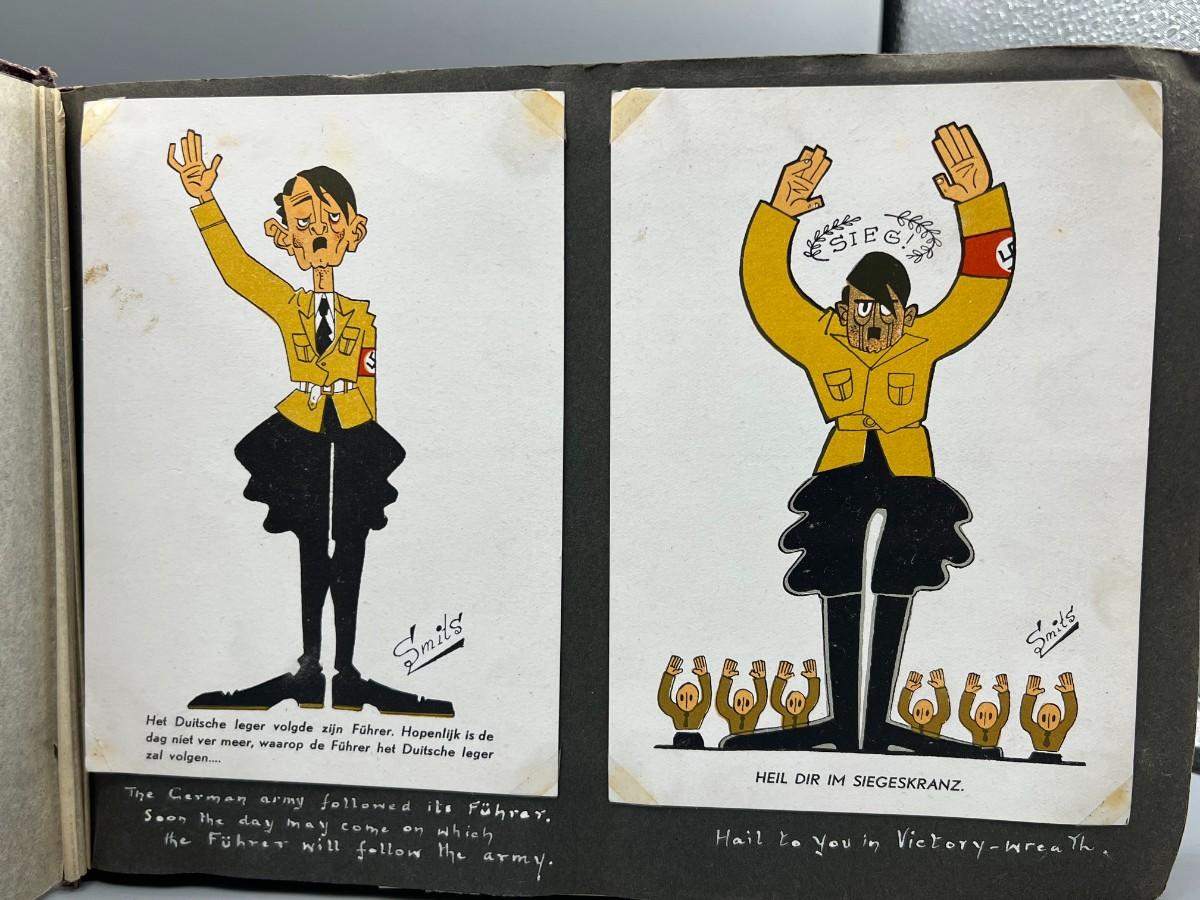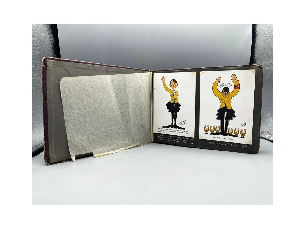 Vintage Collectible WWII Era Picture Album Scrapbook Postcards Photos Hitler Germany. Rare anti-Nazi novelty postcards by Dutch artist Smits, B&W postcards and photos. Some of the pages have names and translation under the photos. Pages have worn from age but postcards and photos inside in good vintage condition.