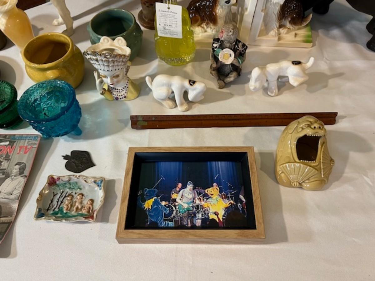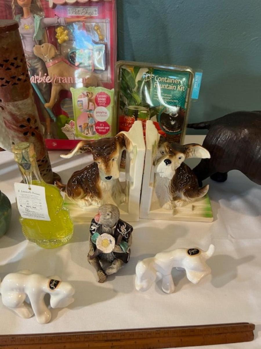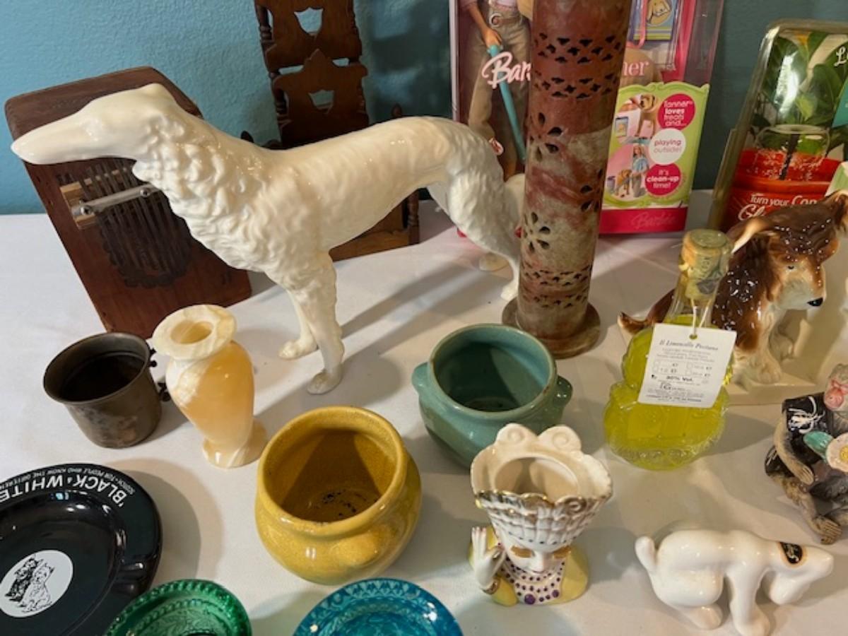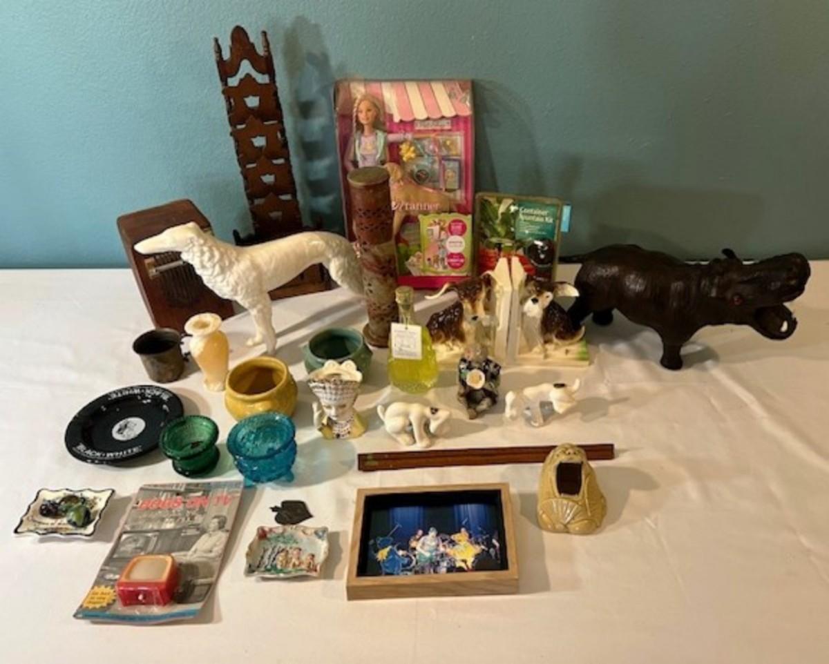 Includes leather wrapped hippo, Barbie, pottery, art glass, and more. Total of 25+ pieces.