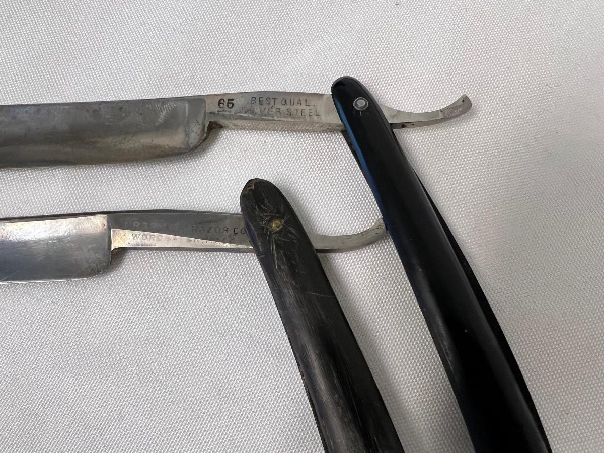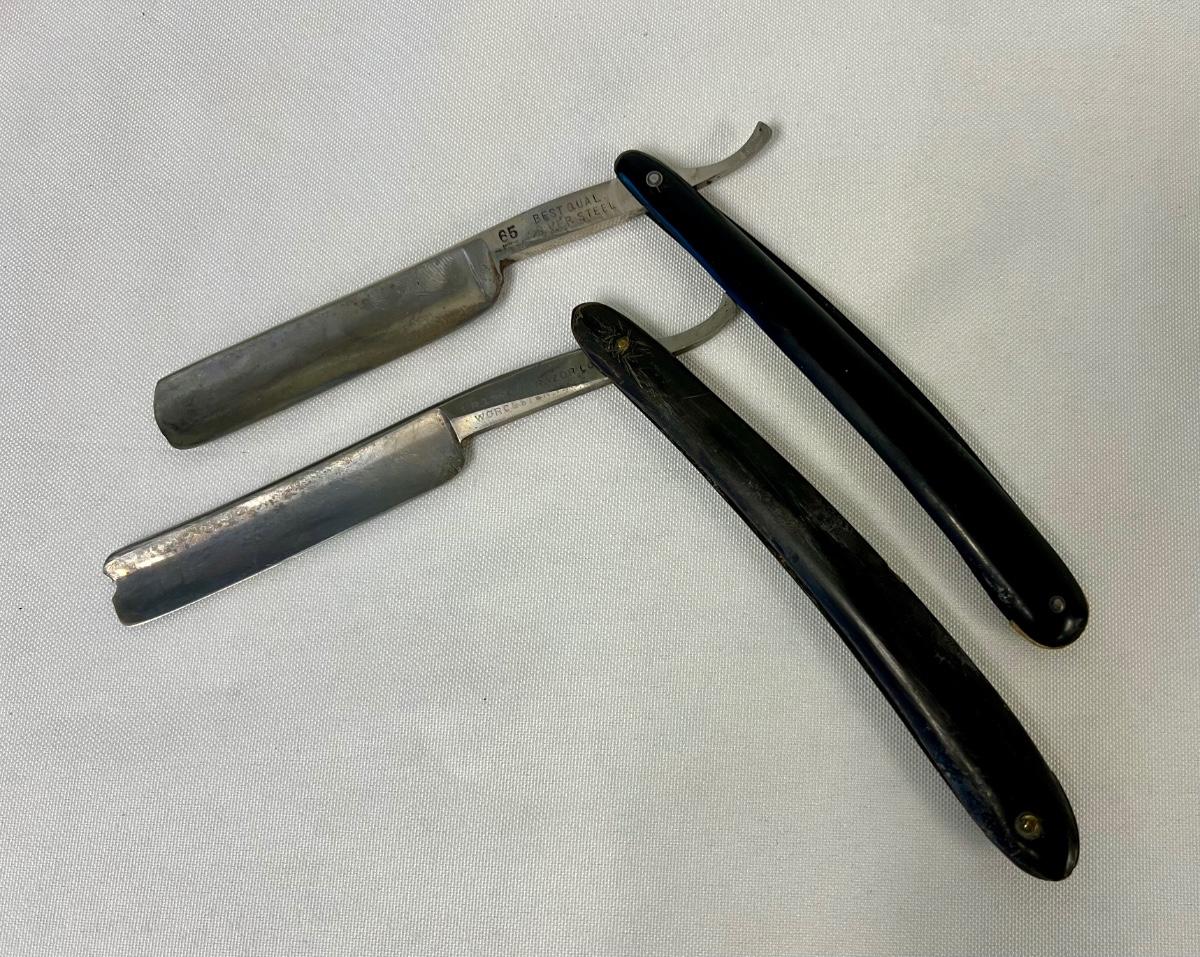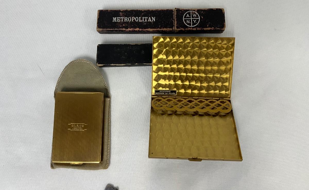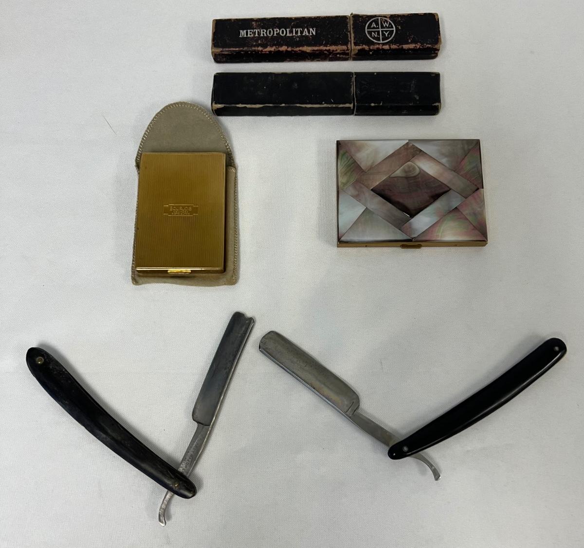 Includes two compacts and two straight razors. Total of 4 pieces. Shipping dimensions: 5" x 8". [SG]