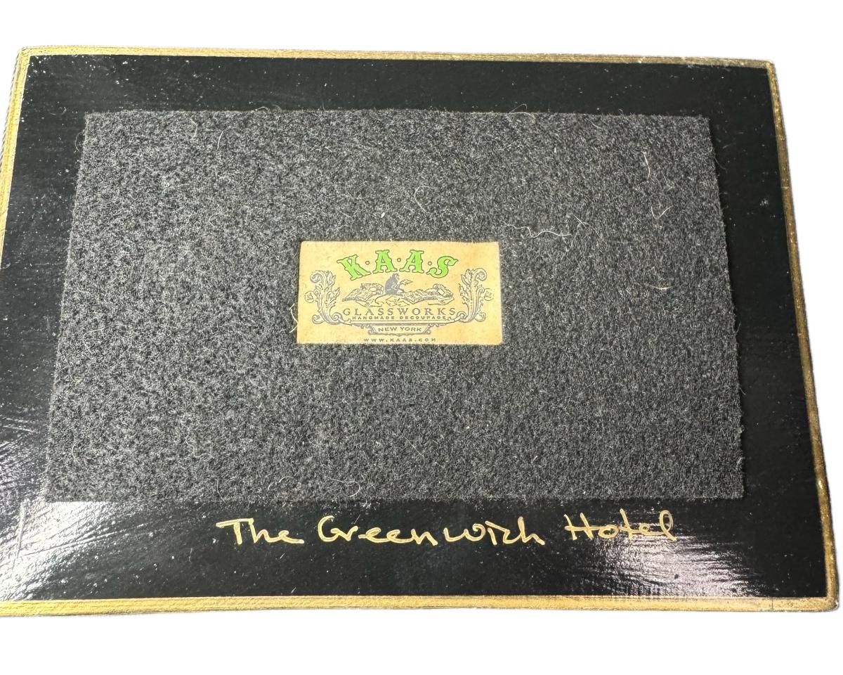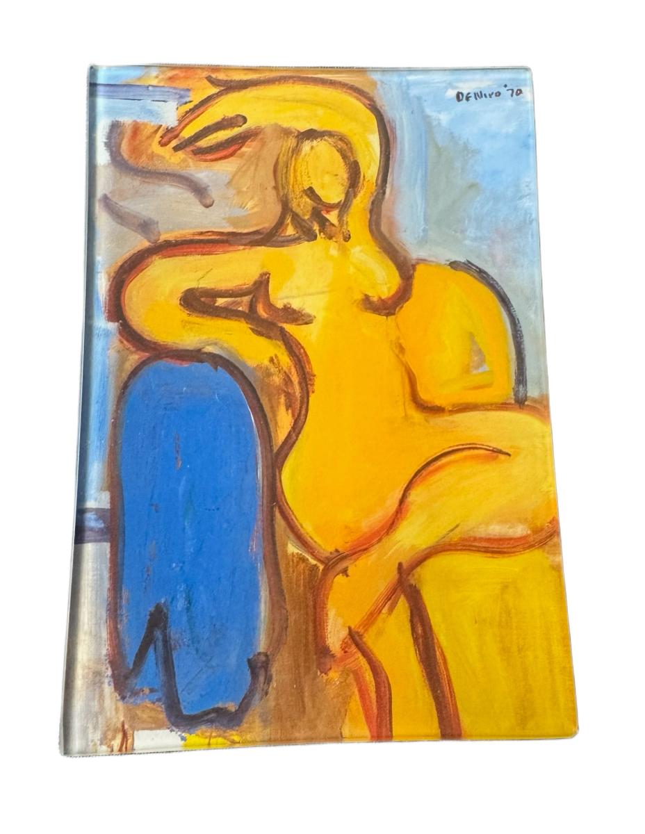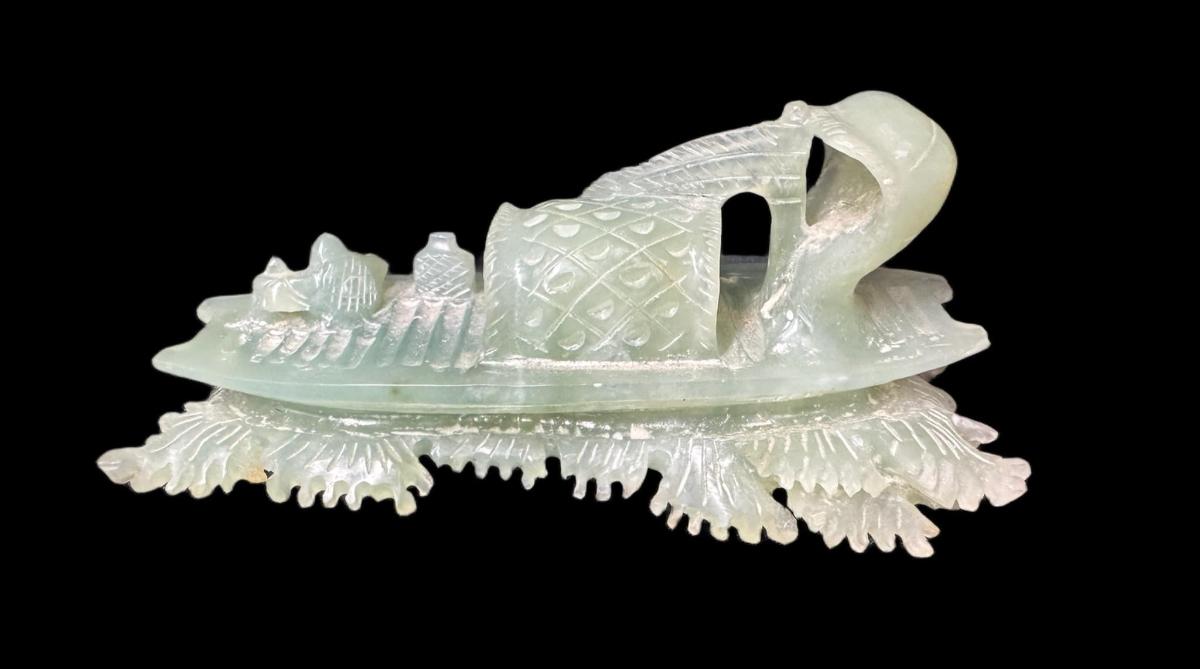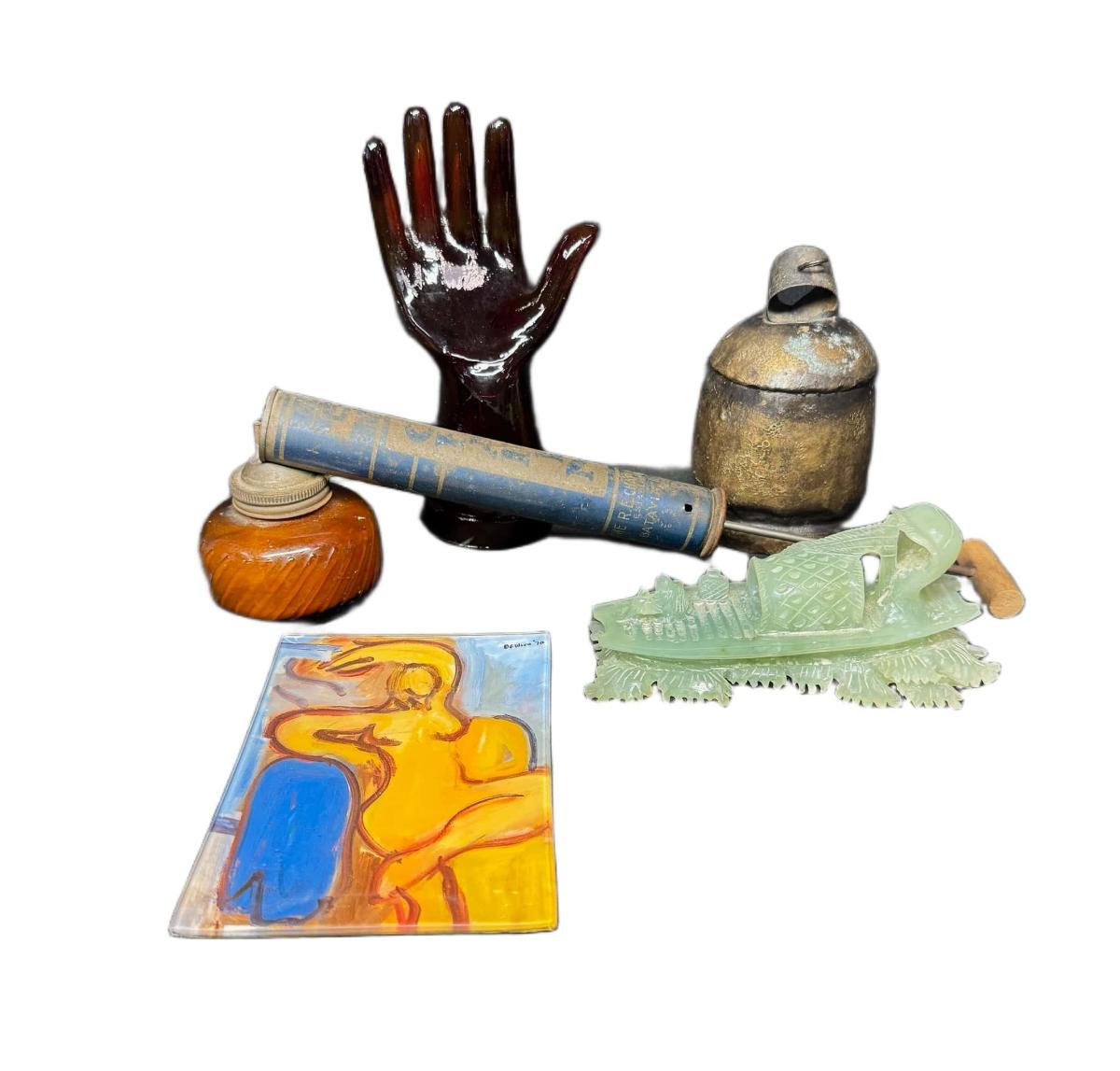 Includes a carved jade fisherman, a Noah cow bell, a Robert De Niro signed painting, a Kaas Glassworks trinket dish, and more. Total of five pieces. Measurement of largest: 12”L. [CS]