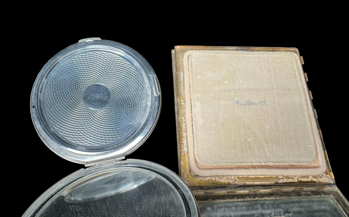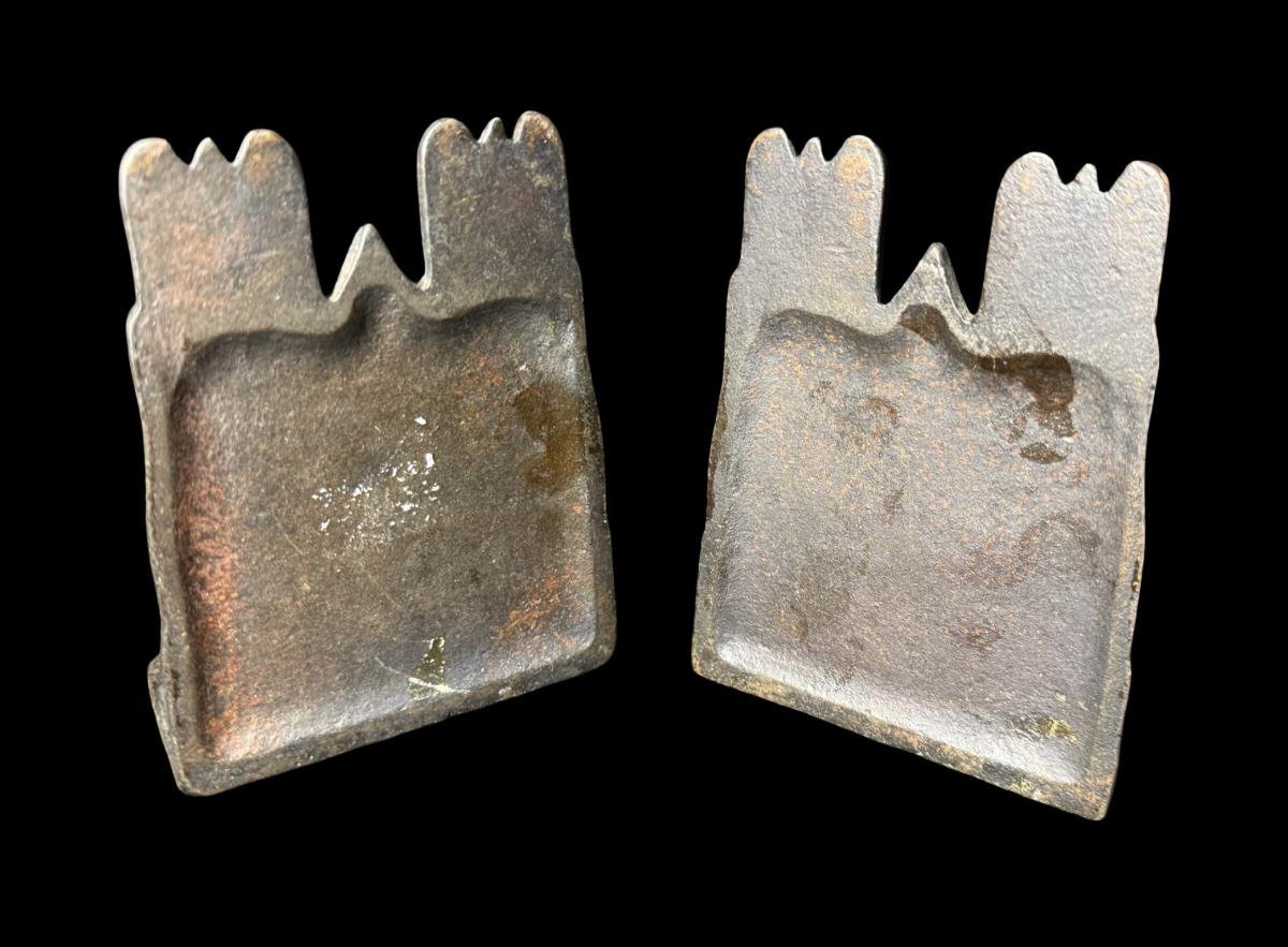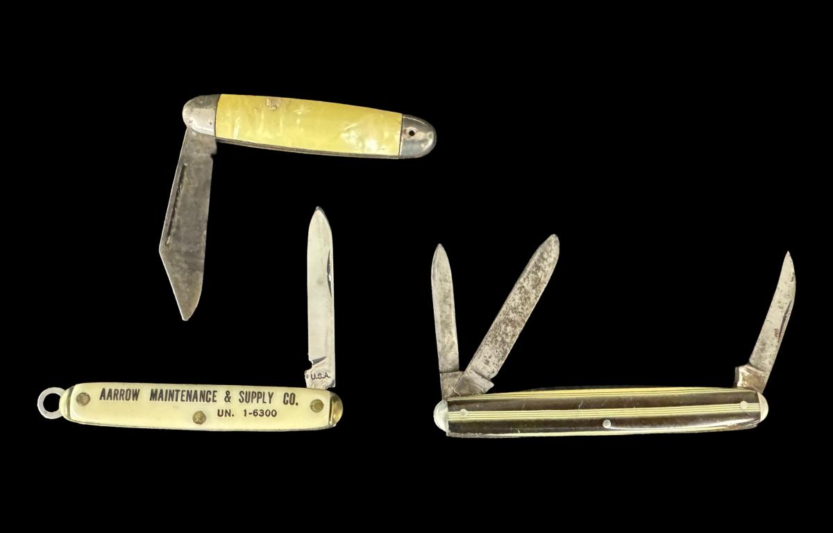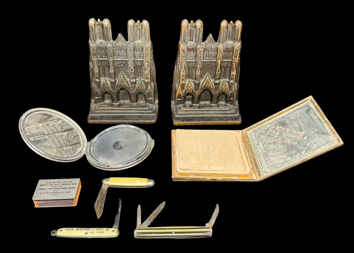 Includes a pair of bronze cathedral bookends, a Burlington Zephyr steel matchbox, three pocket knives, and two compacts. Age related wear. Measurement of tallest: 5”H. [LD]
