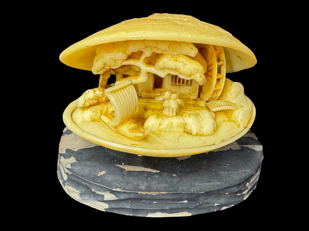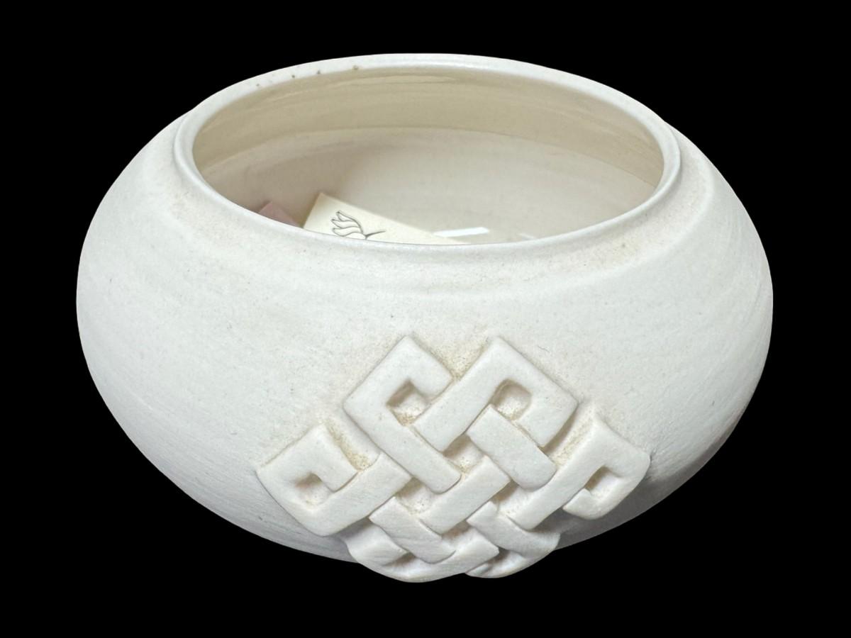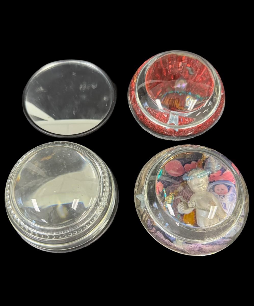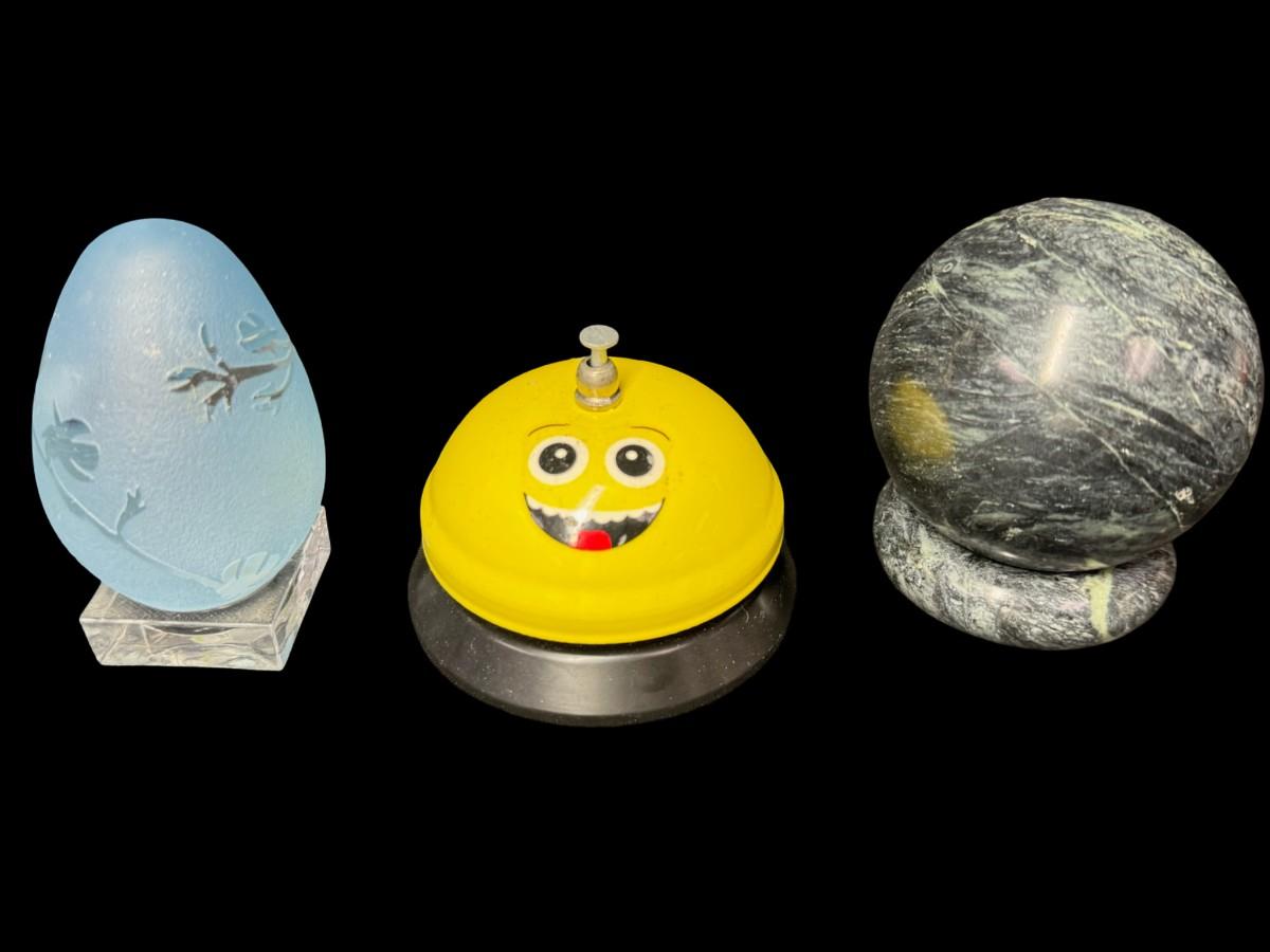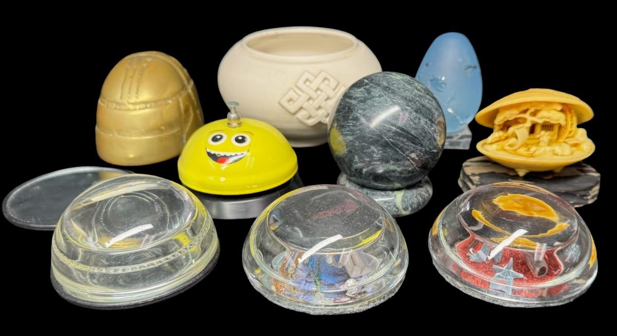 Includes hand made paper weights, a ceramic Buddhist bowl, a brass scarab paperweight, an Arthur Court style glass egg, and more. Total of nine pieces. Age related wear. [BK]