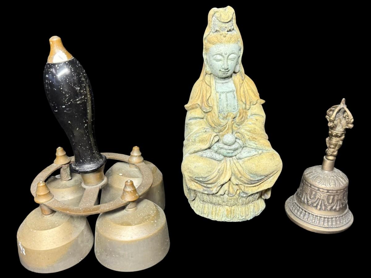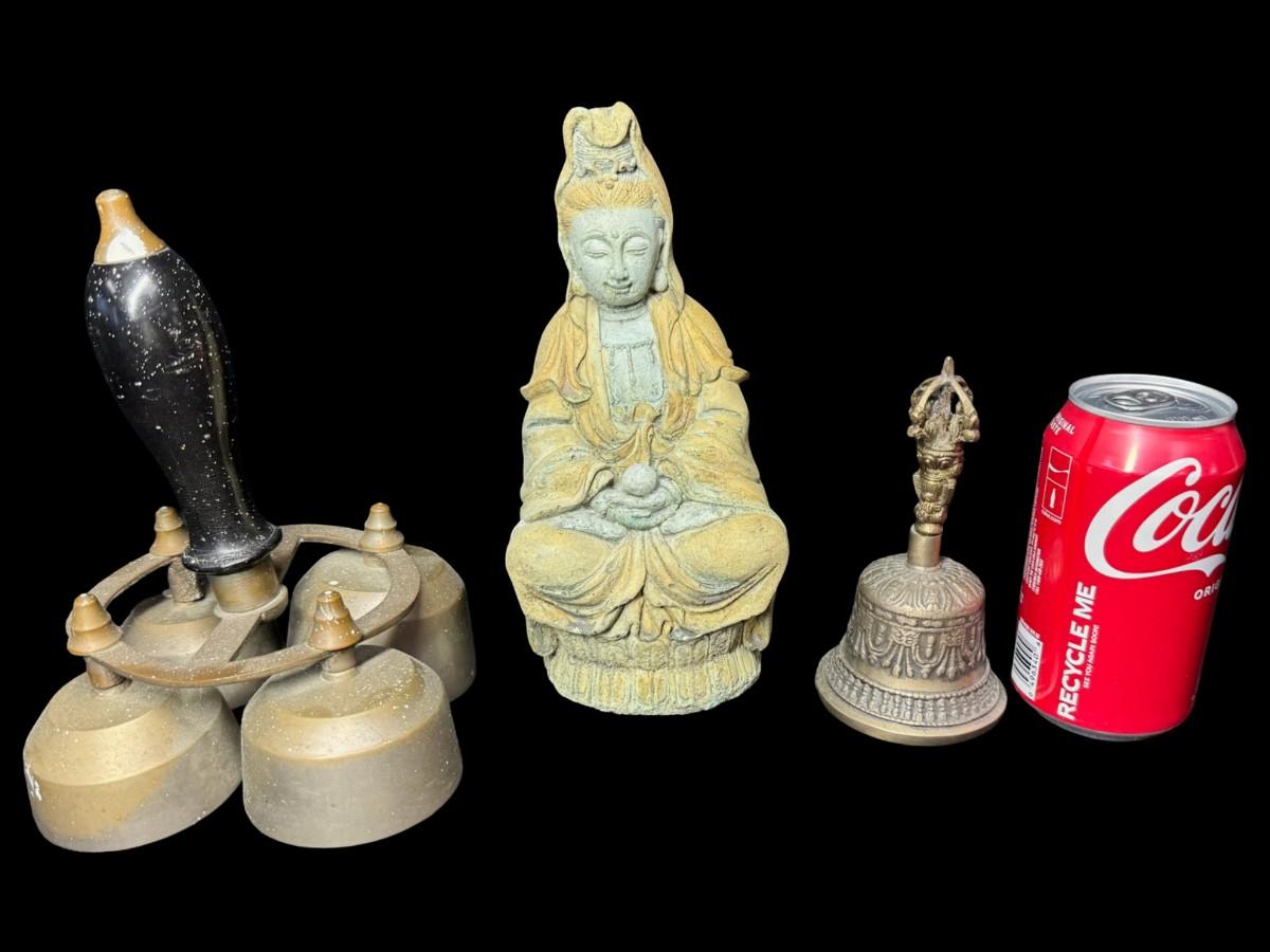 Includes two brass bells, and a Kuan Yin statue. [BK]