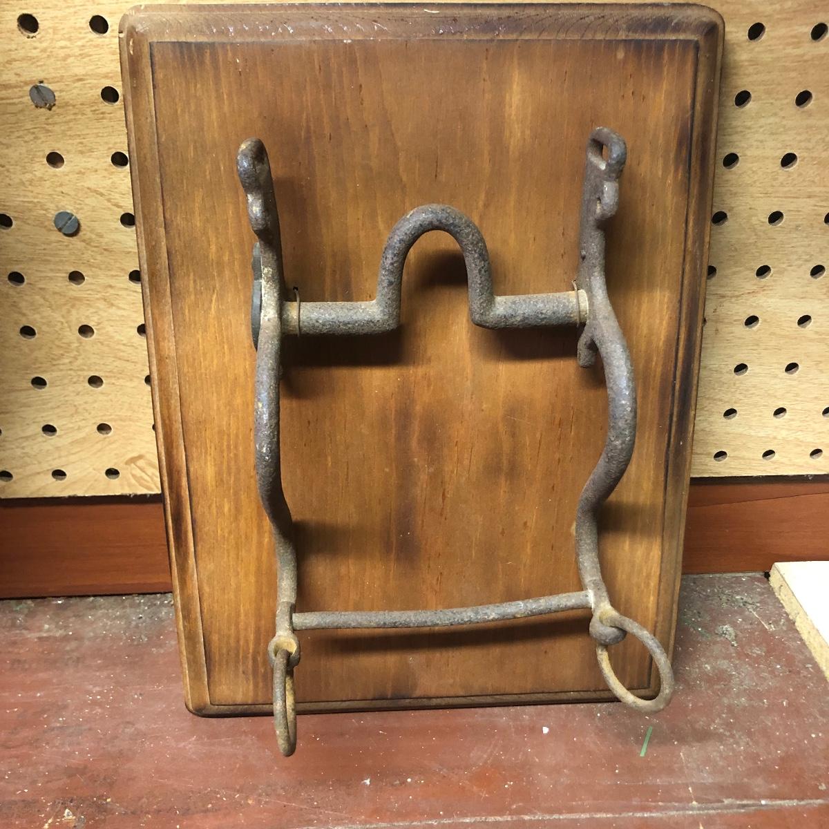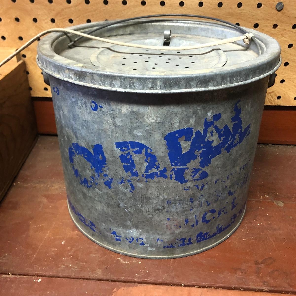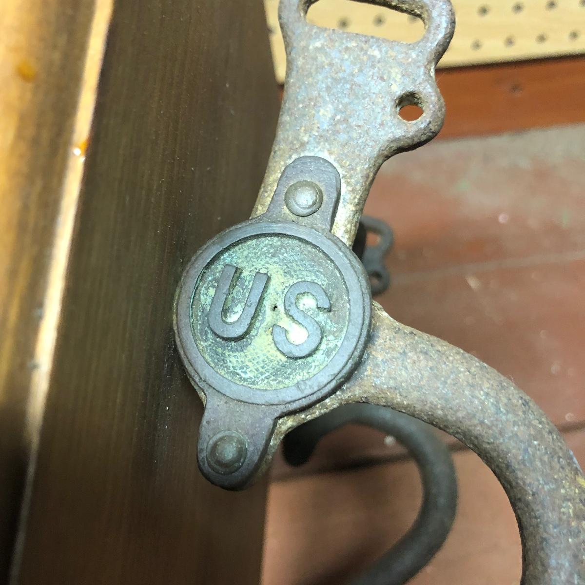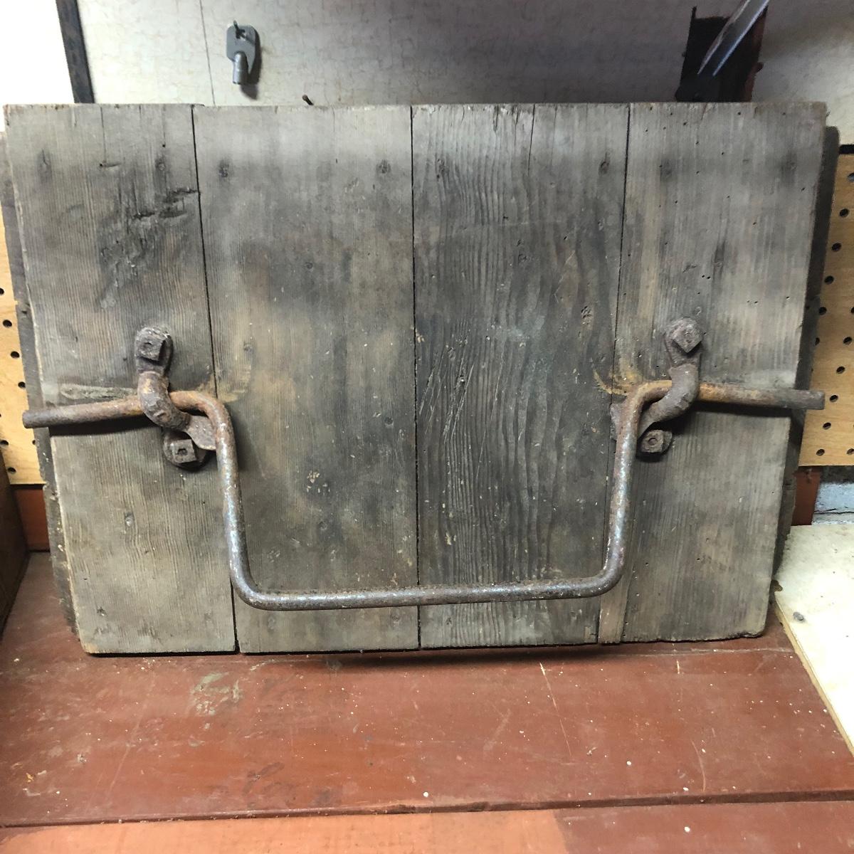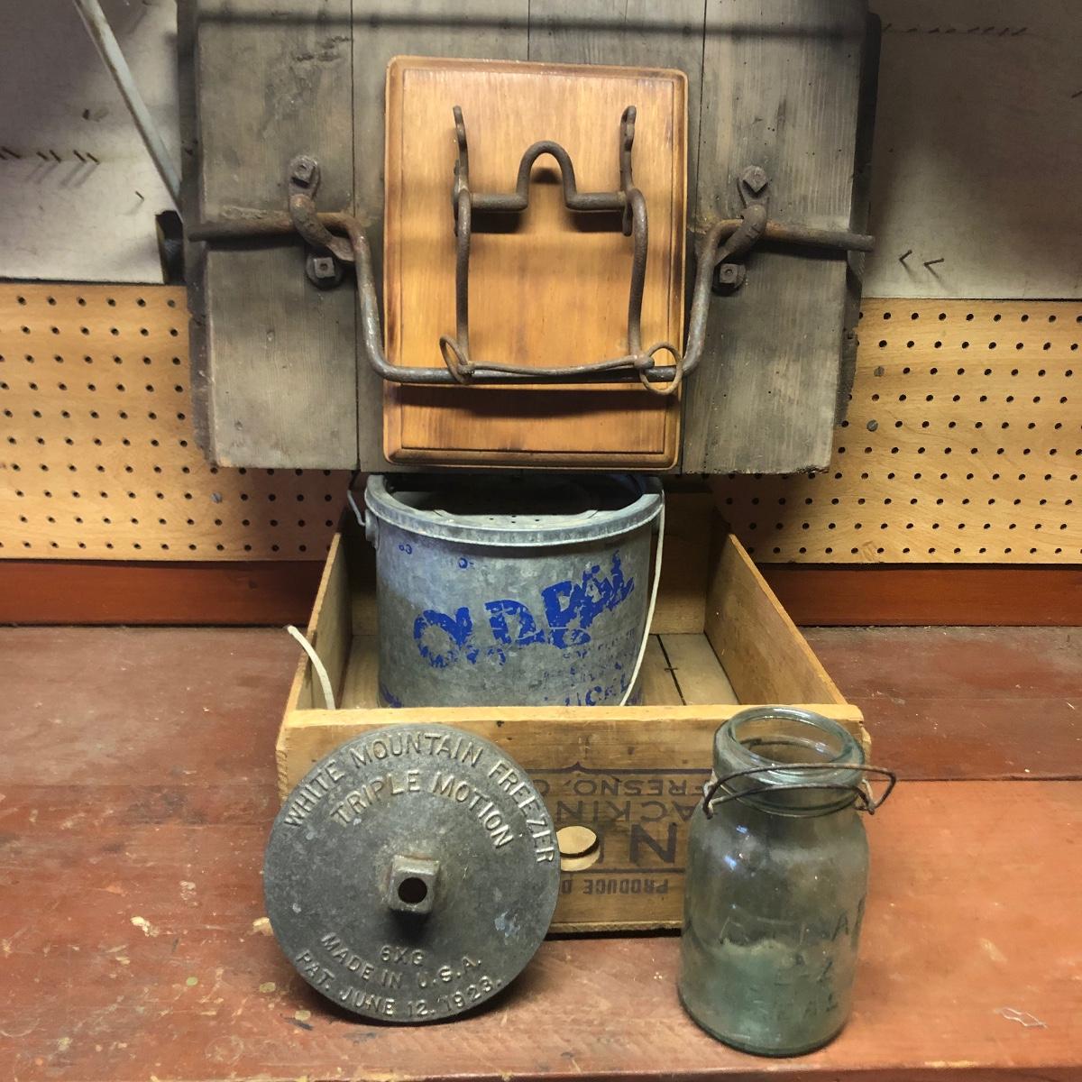 Lot includes a US Calvary bit that is mounted on a wood backing, Old Pal metal minnow bucket, United Packing Co. box, Atlas E-Z Seal jar with no lid, White Mountain Freezer metal top, and a large iron handle bolted to wood. Box measures 14” x 17.5” x 6”