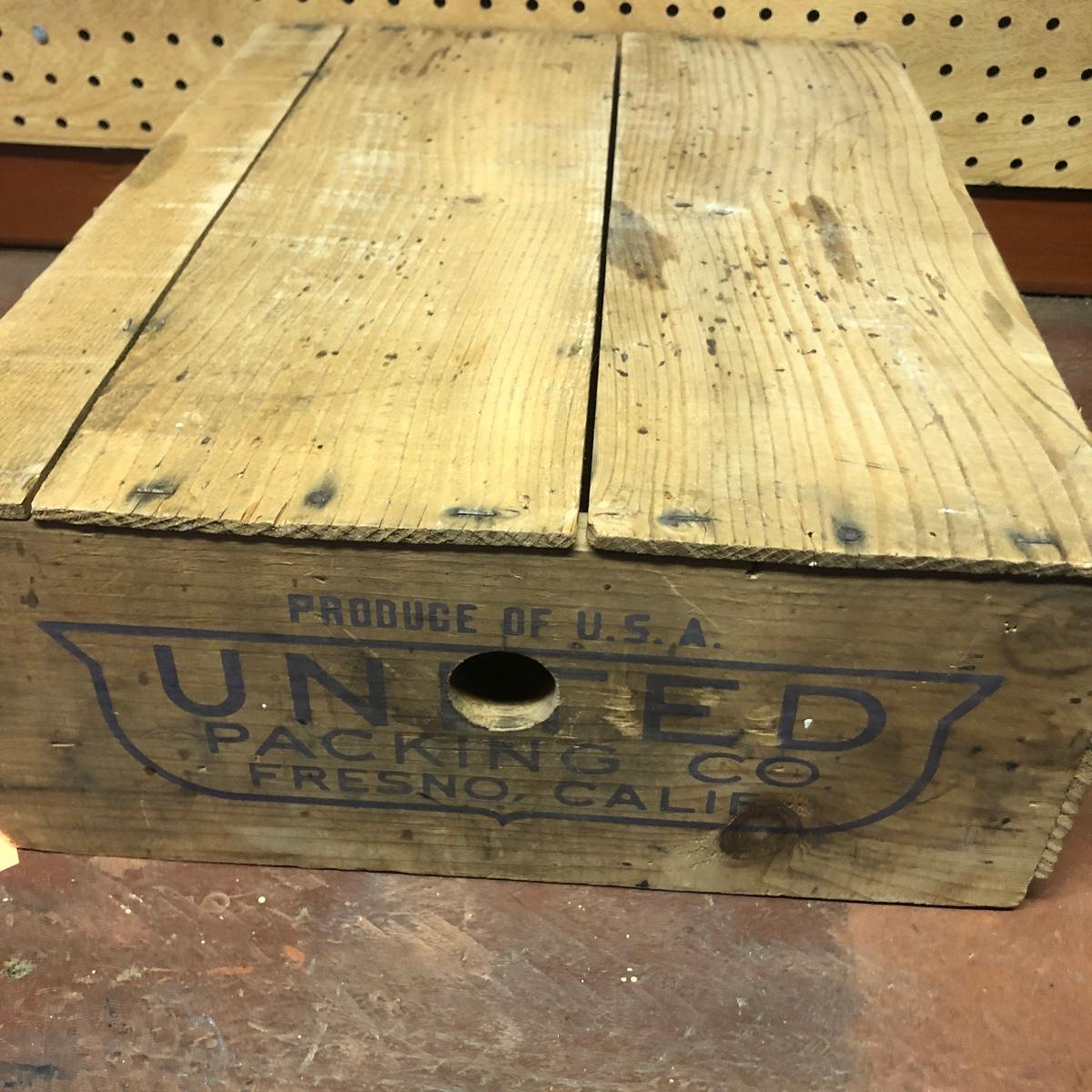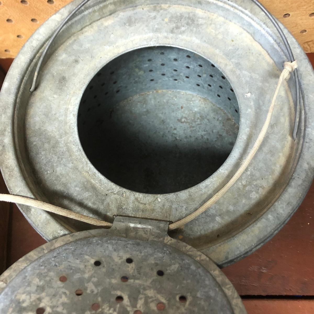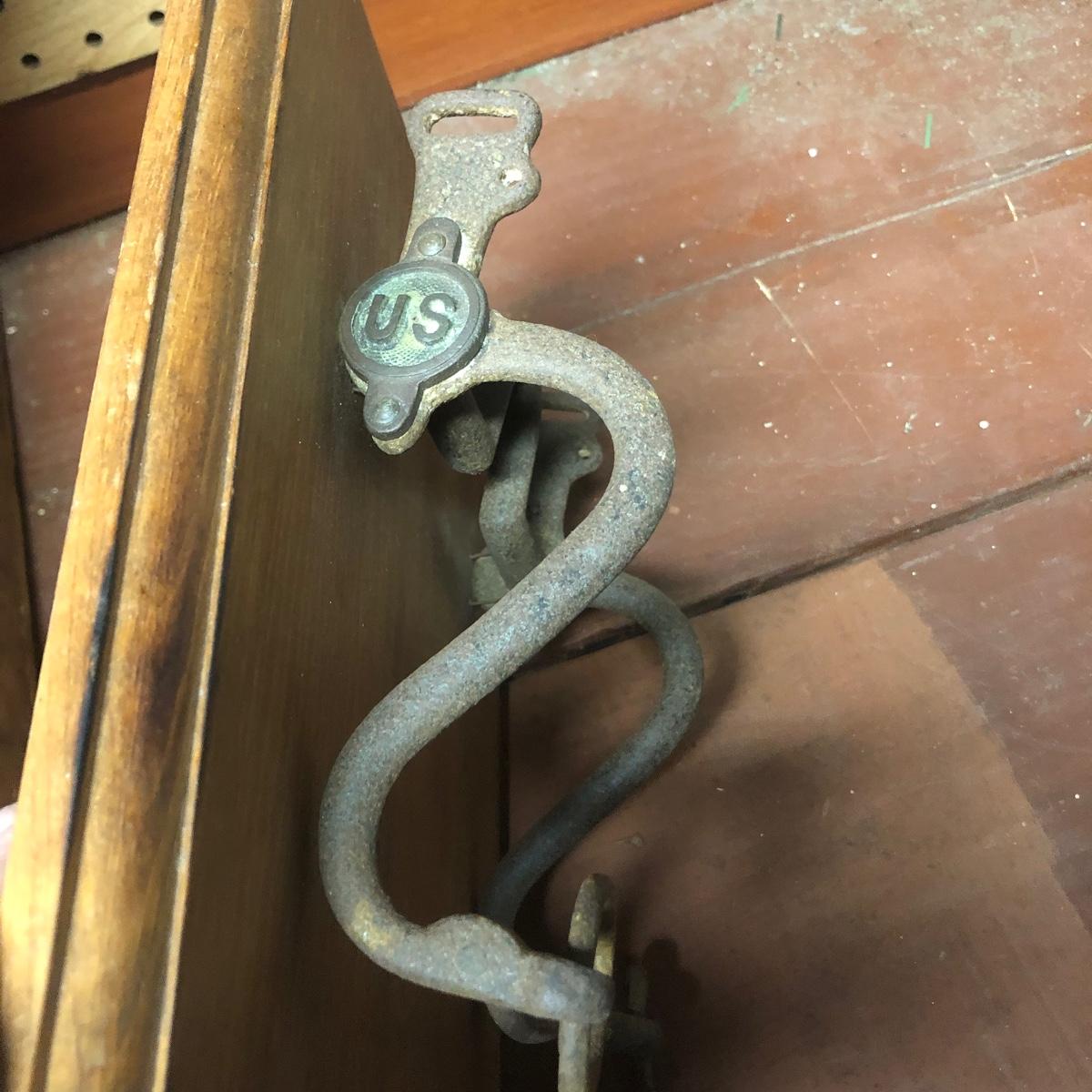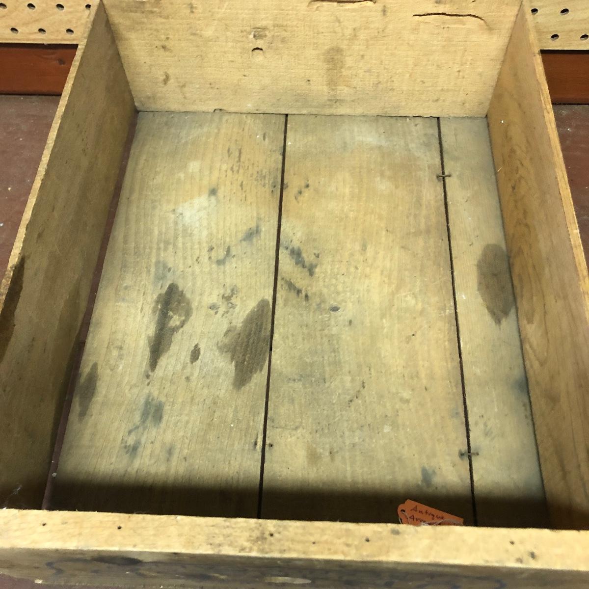 Lot includes a US Calvary bit that is mounted on a wood backing, Old Pal metal minnow bucket, United Packing Co. box, Atlas E-Z Seal jar with no lid, White Mountain Freezer metal top, and a large iron handle bolted to wood. Box measures 14” x 17.5” x 6”