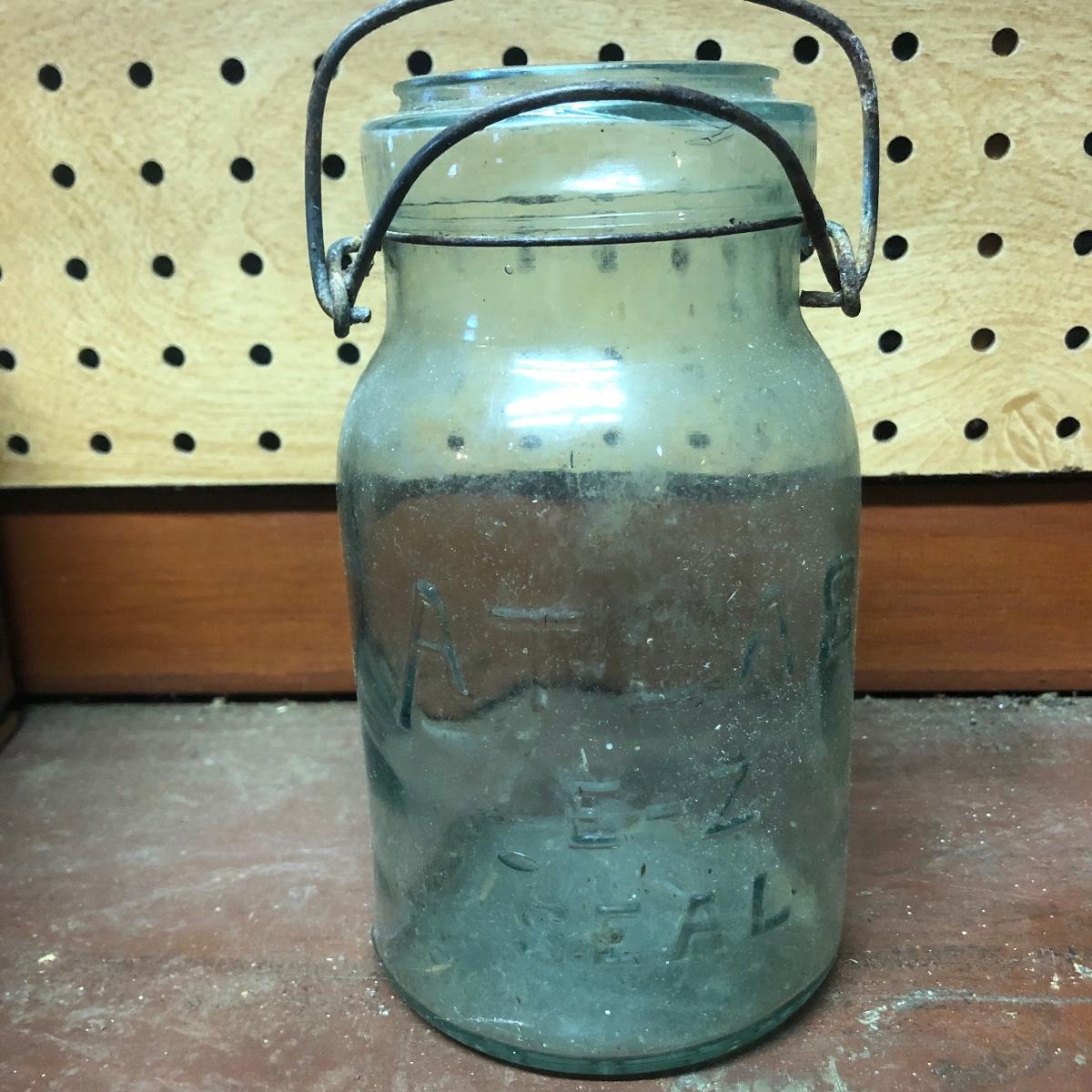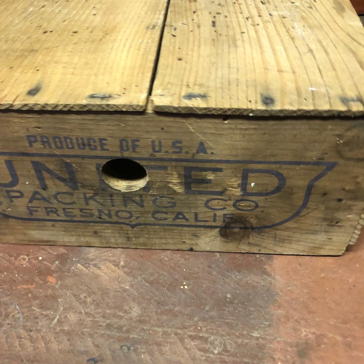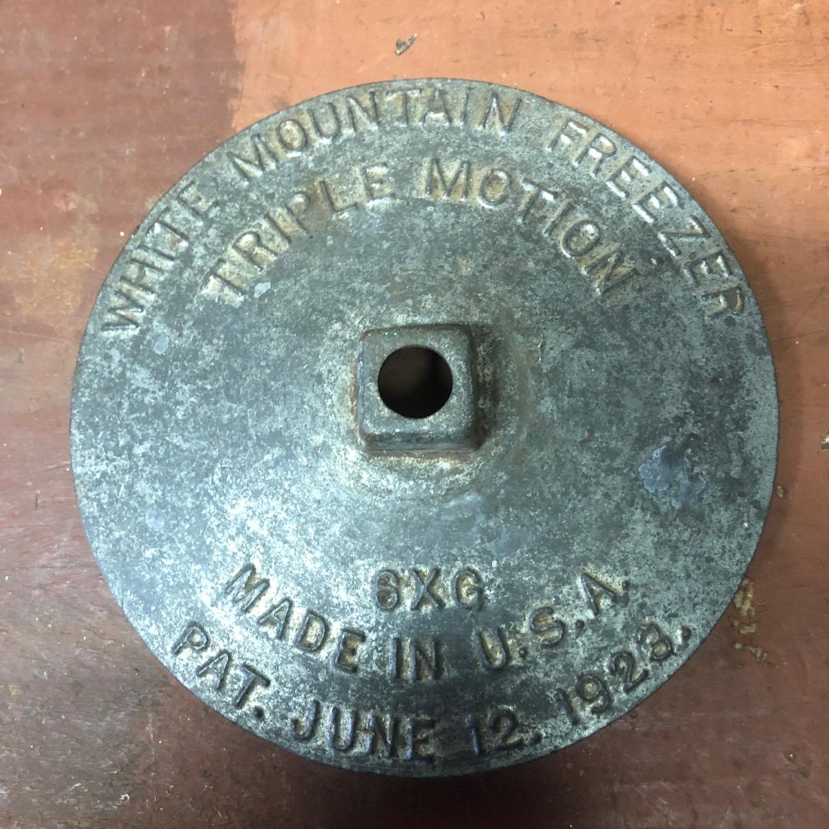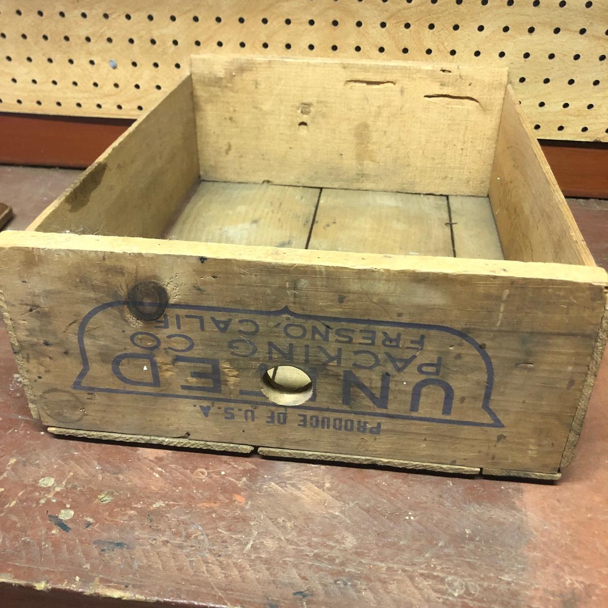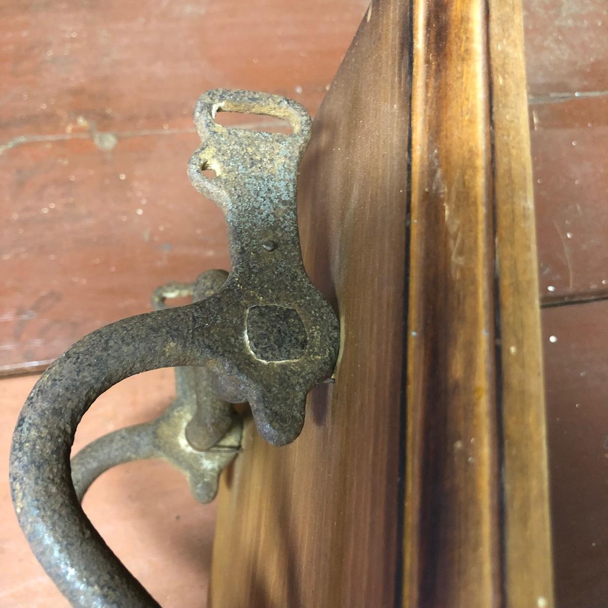 Lot includes a US Calvary bit that is mounted on a wood backing, Old Pal metal minnow bucket, United Packing Co. box, Atlas E-Z Seal jar with no lid, White Mountain Freezer metal top, and a large iron handle bolted to wood. Box measures 14” x 17.5” x 6”
