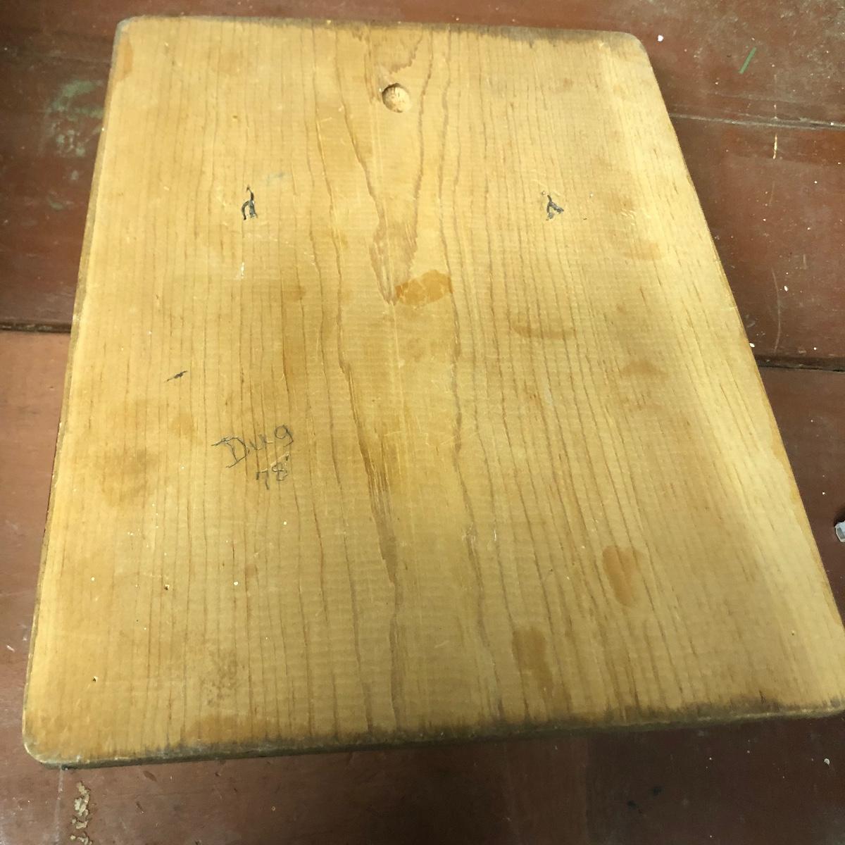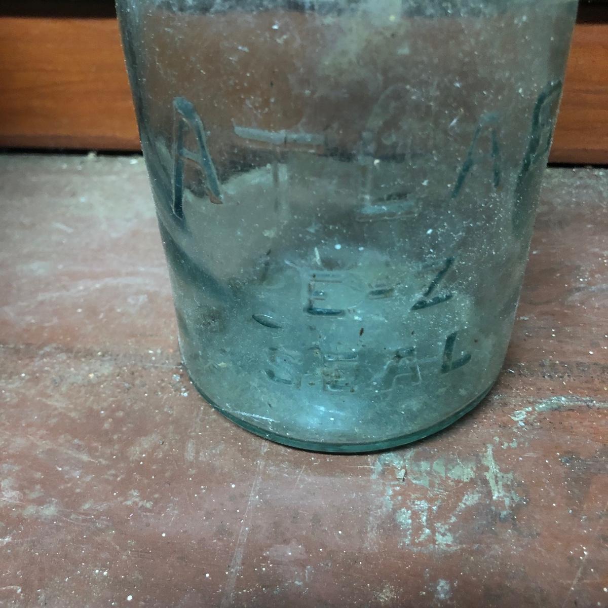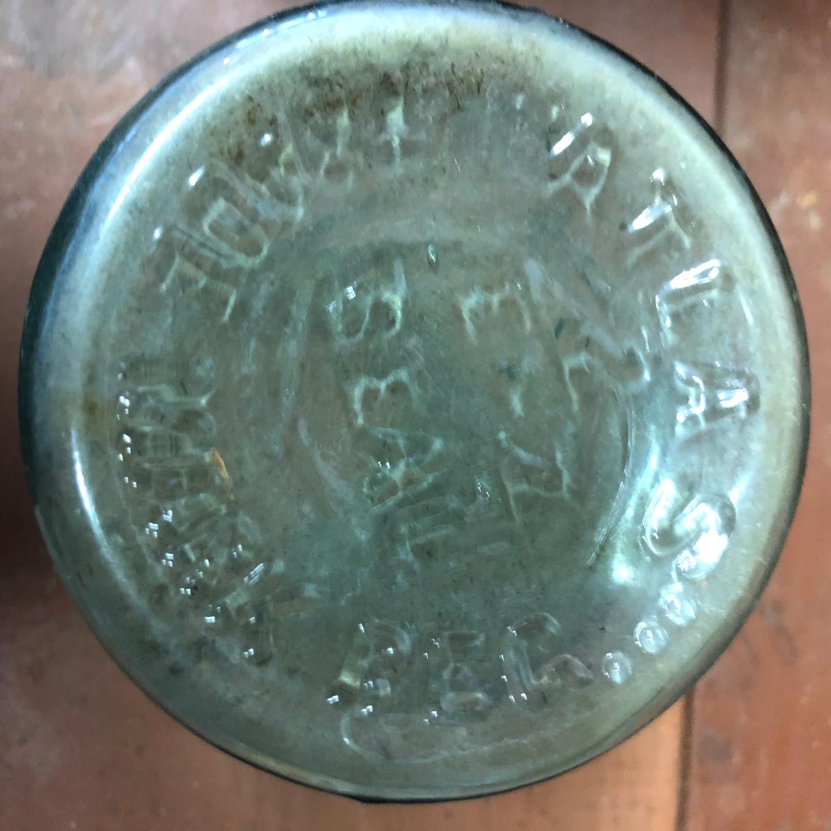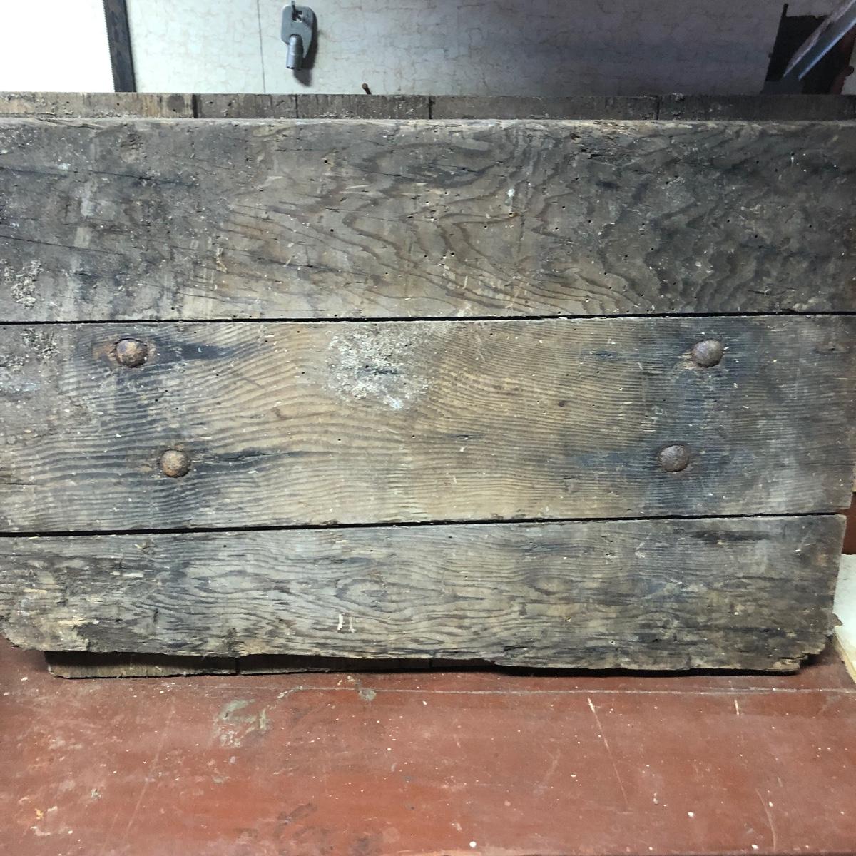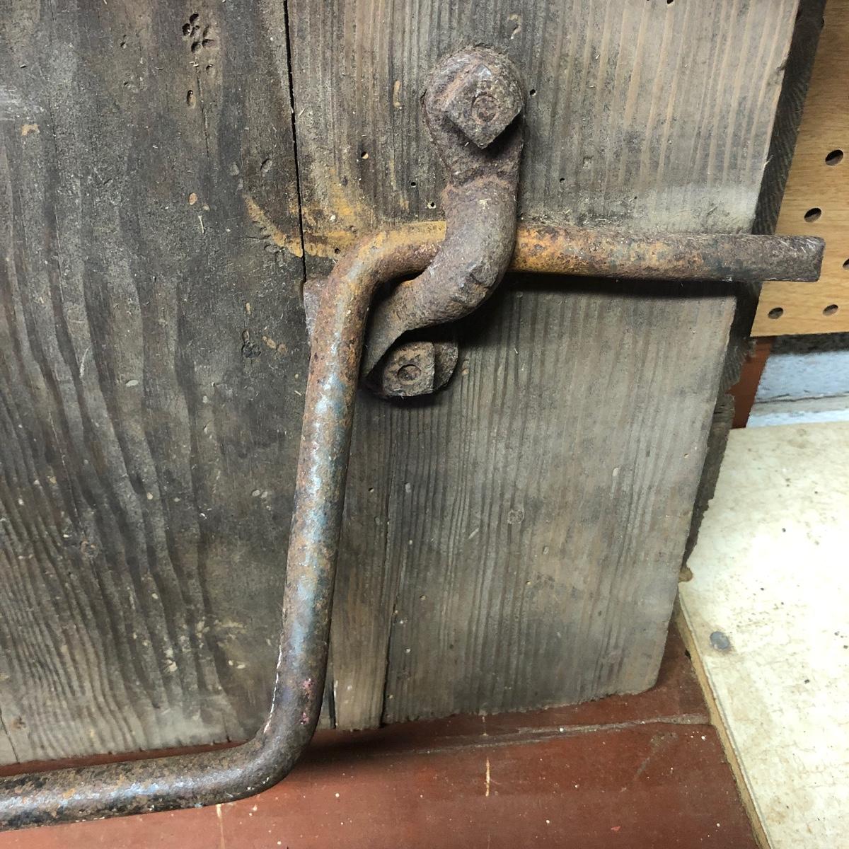 Lot includes a US Calvary bit that is mounted on a wood backing, Old Pal metal minnow bucket, United Packing Co. box, Atlas E-Z Seal jar with no lid, White Mountain Freezer metal top, and a large iron handle bolted to wood. Box measures 14” x 17.5” x 6”
