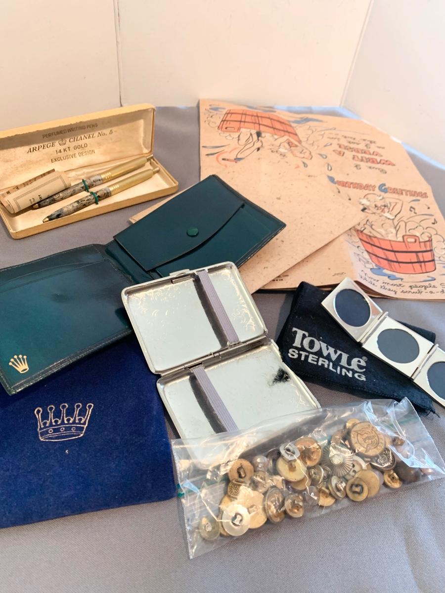 Vintage Collectibles Lot - Towle Mirror Rolex Wallet Chanel Pen Set 1940s Foldout Card +++