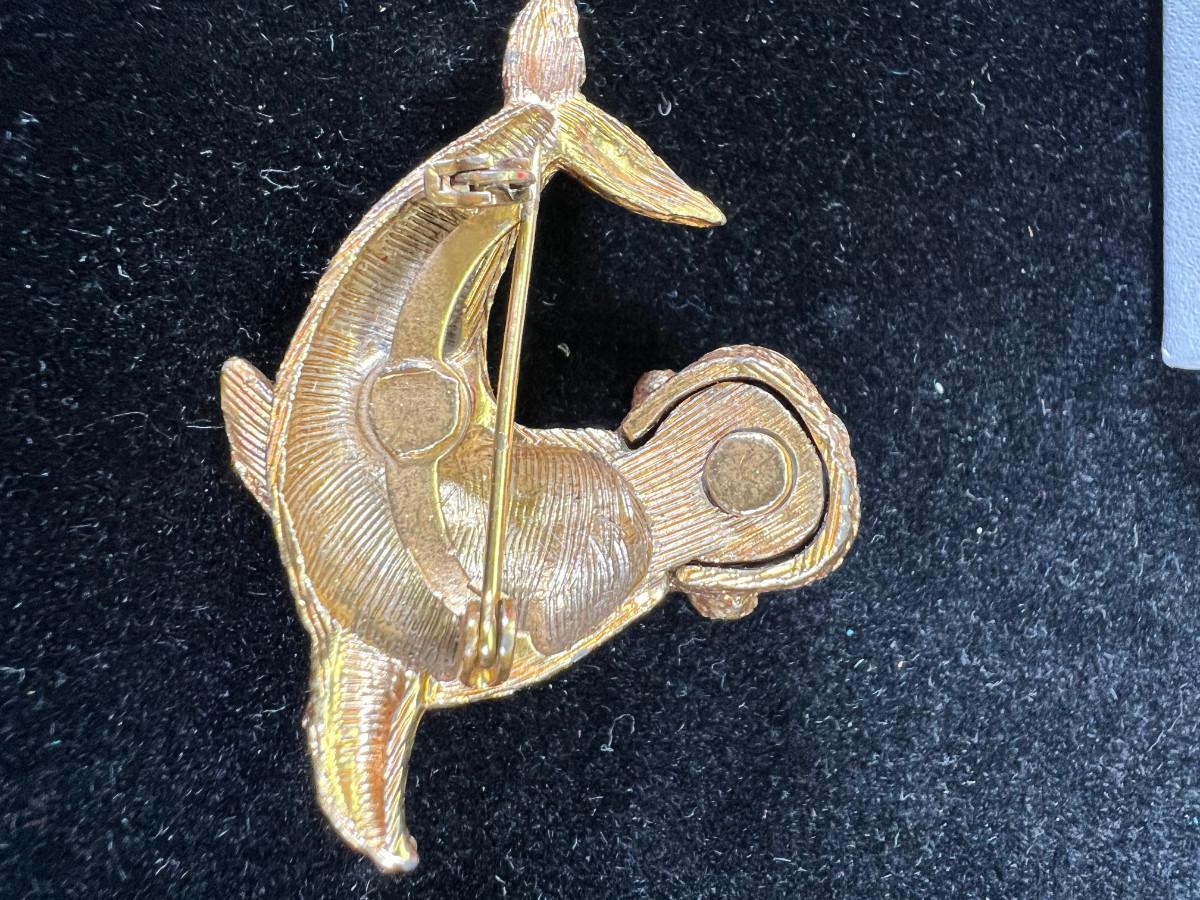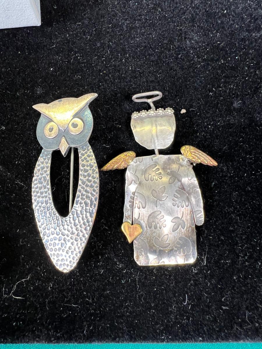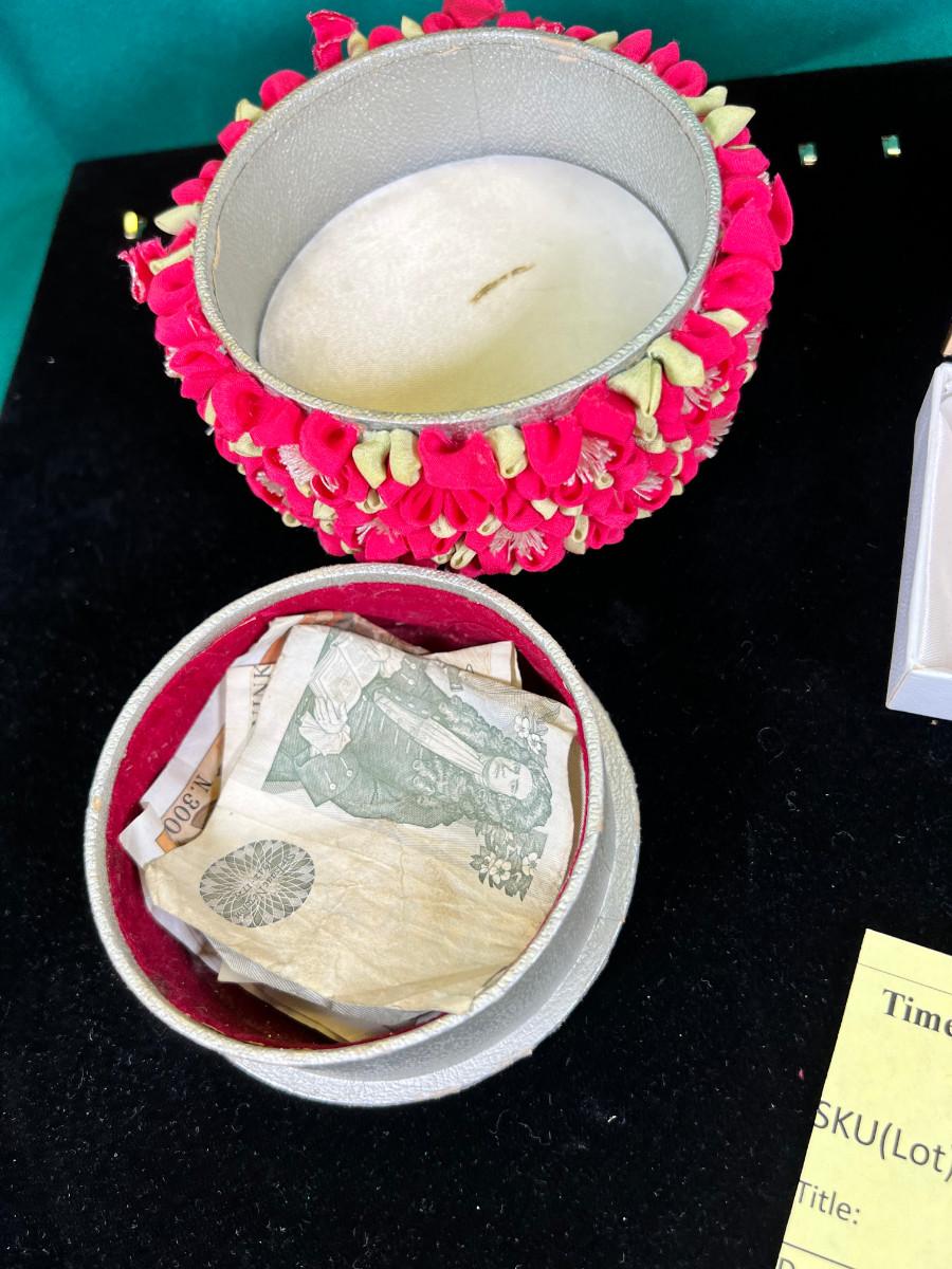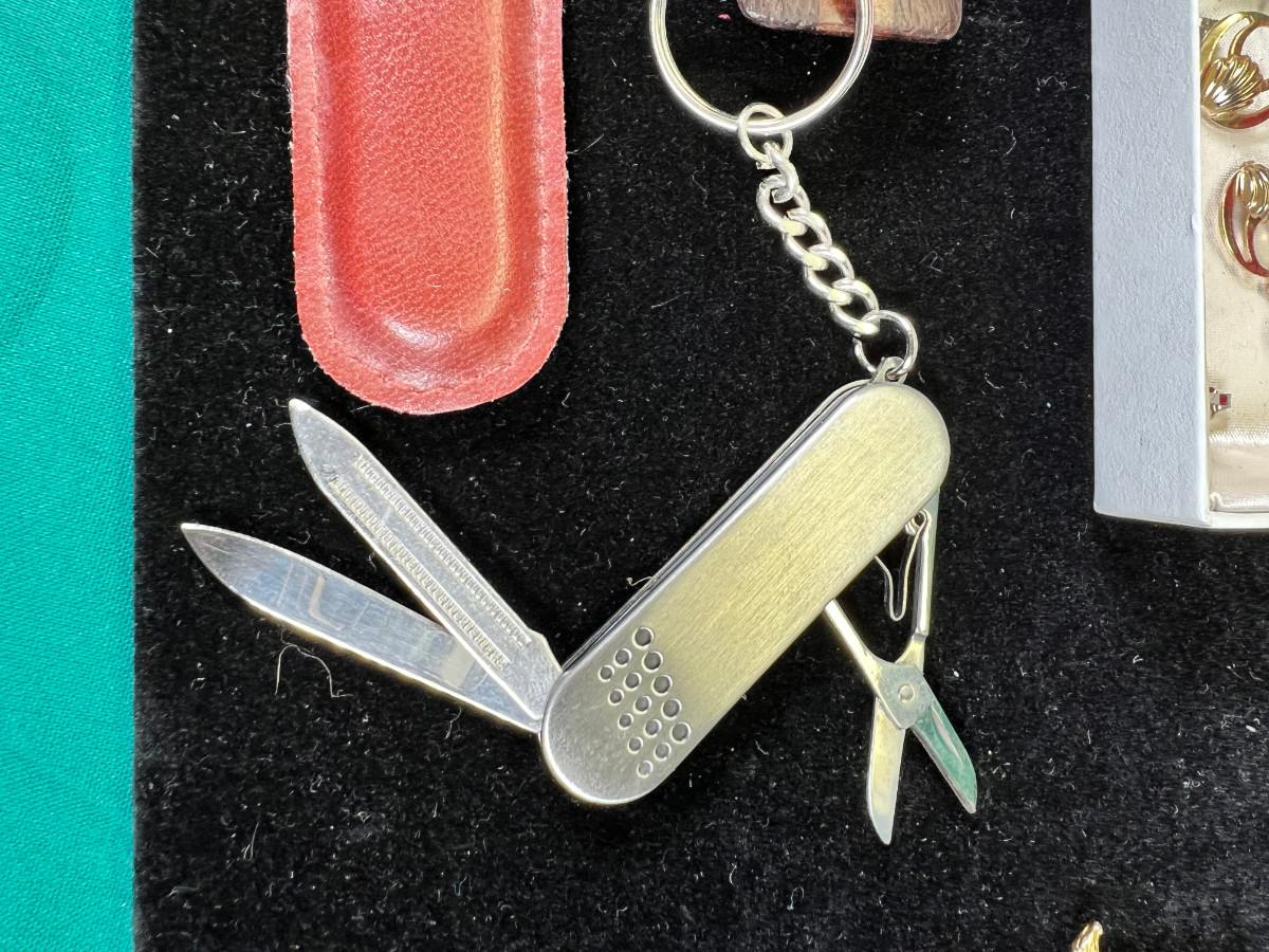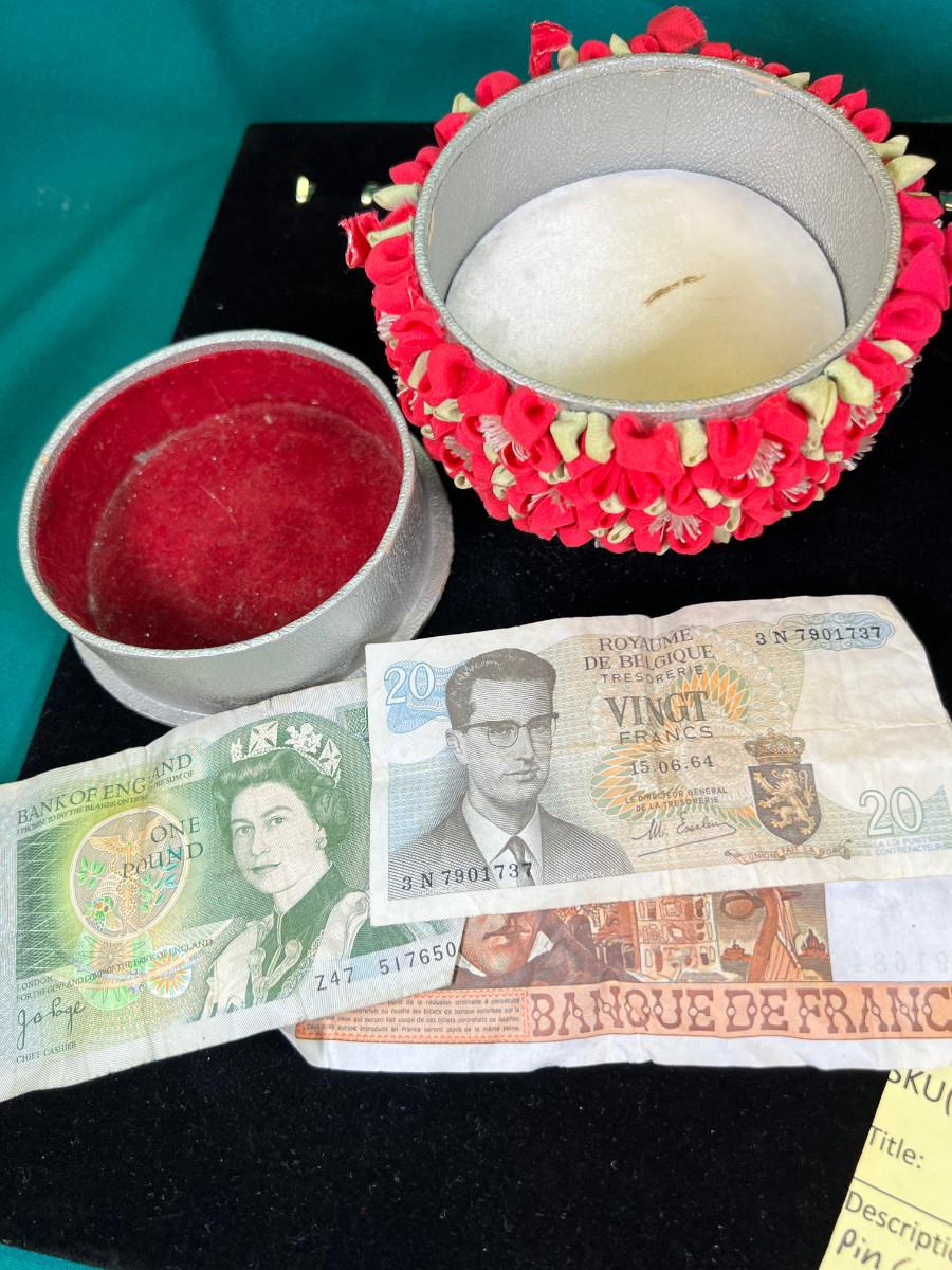1950s red and multi color puff box with currency inside., pocket utility knife from Lillian Veron. 2 Handmade Sterling pins, Artist signed inlaid wood money clip, Costume jewelry Walrus with tusks pin, gold plate.