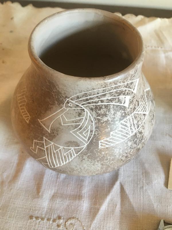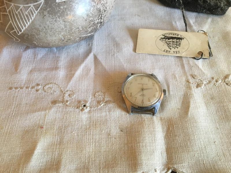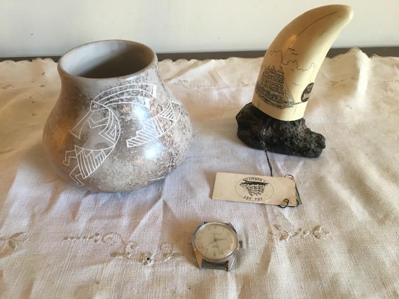 Vintage Collectibles Lot with Art Pottery, Scrimshaw and Vintage Watch