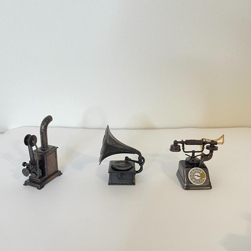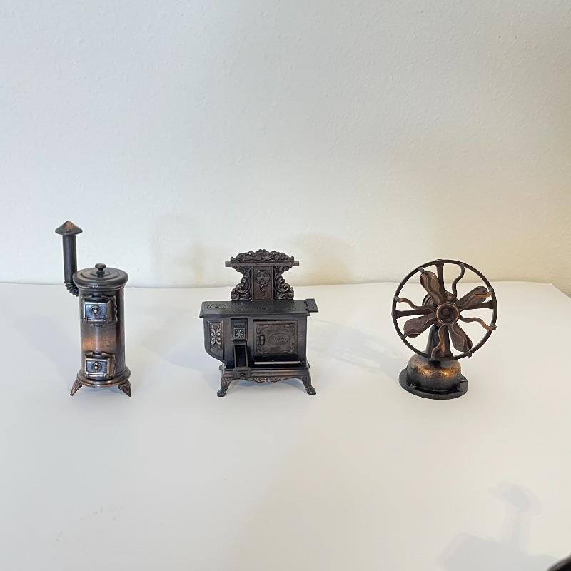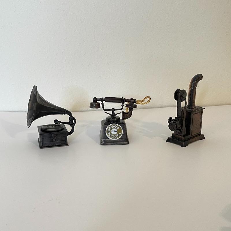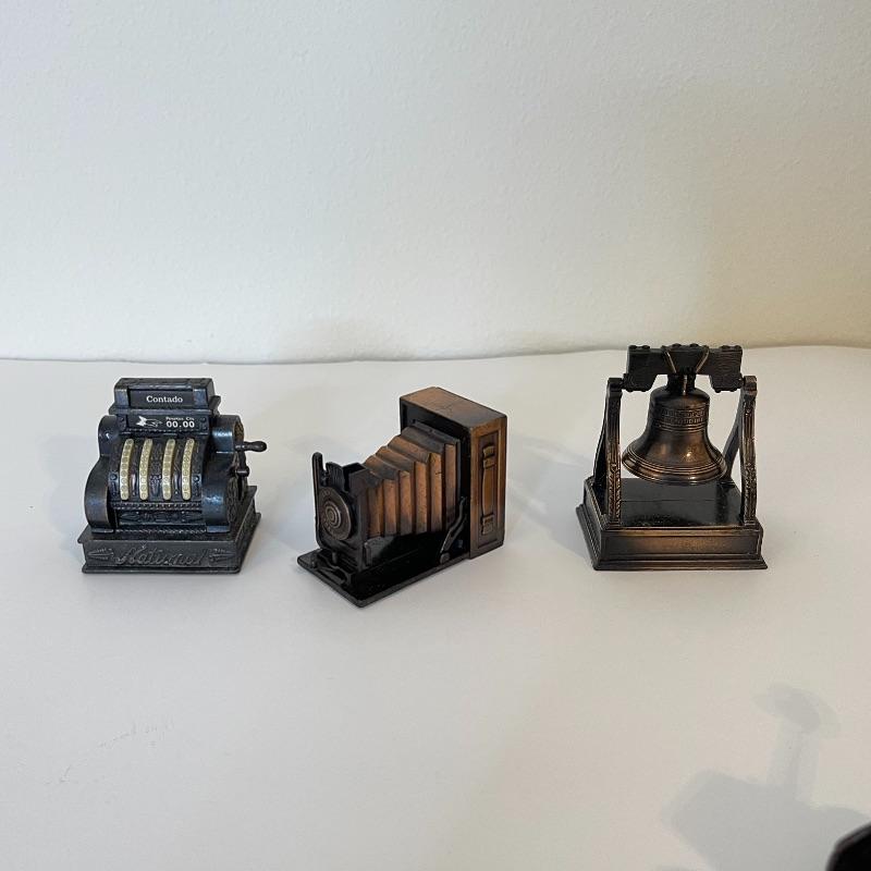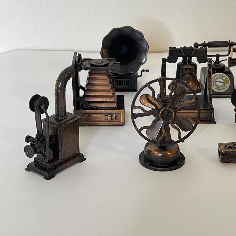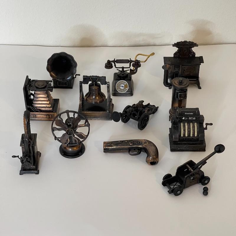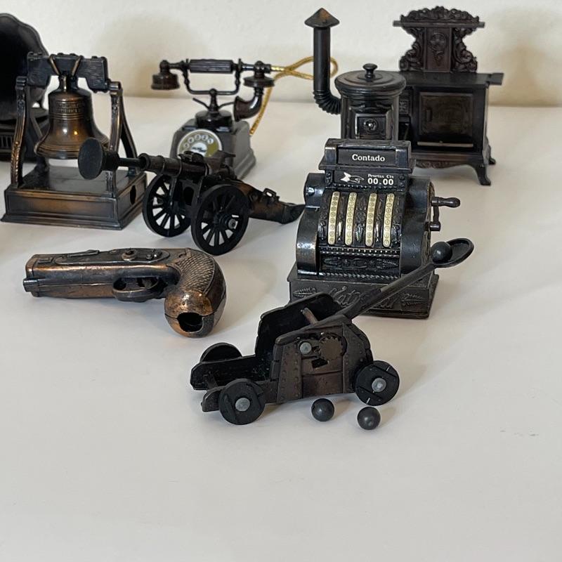 Cash register. pistol, telephone, cannon, camera, catapult, cinema, electric fan, liberty bell, phonograph, kitchen-range, stove
