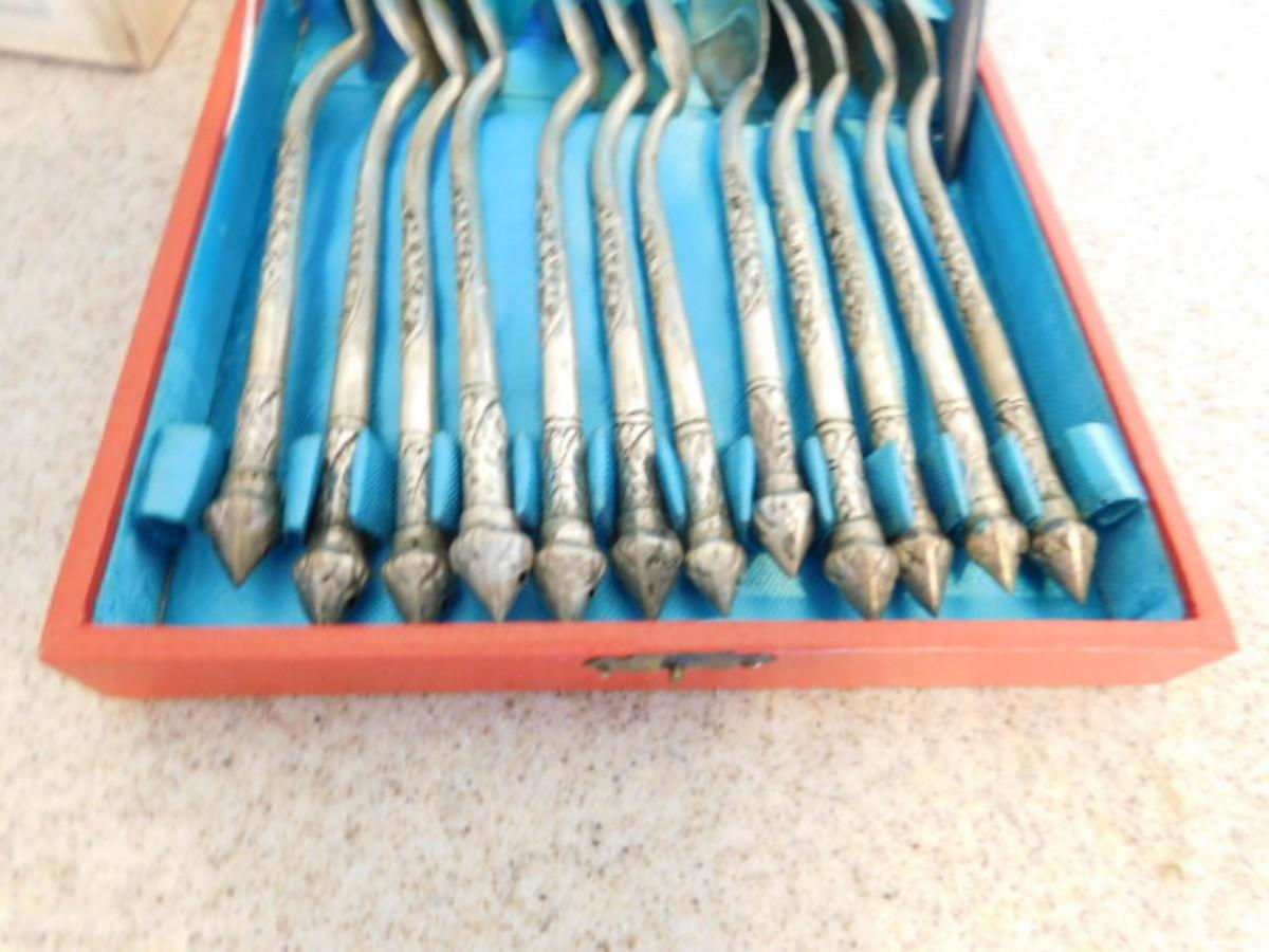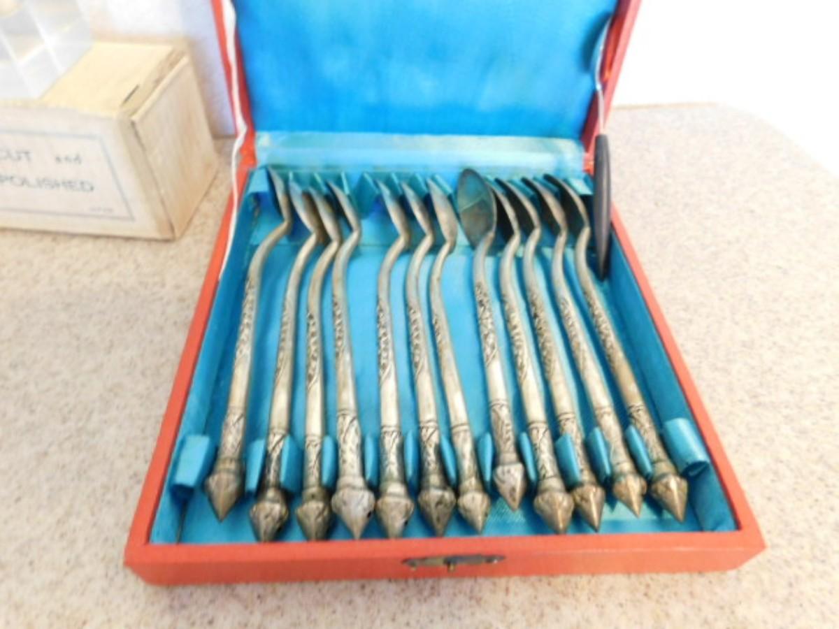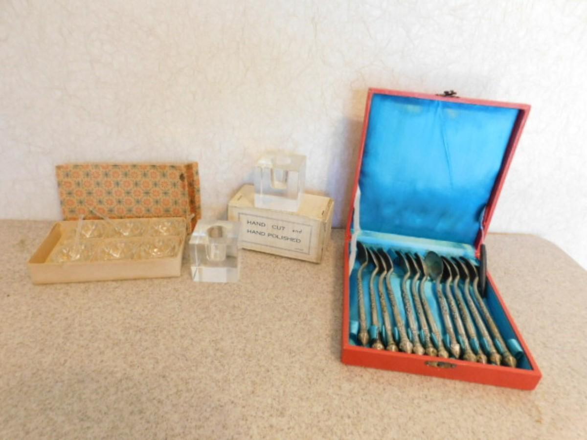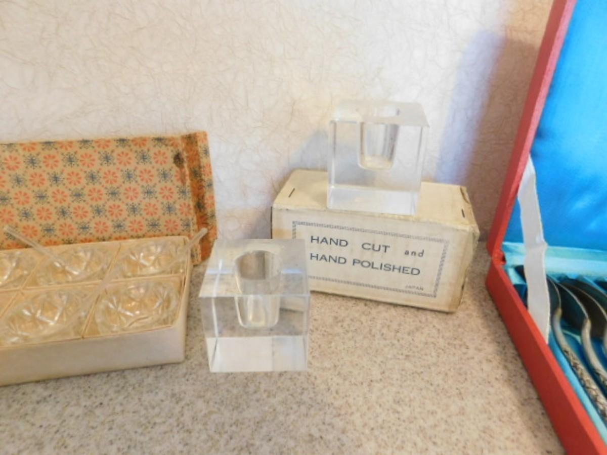 Vintage Collection of Salt Servers, Japanese Crystal Candle Holders, and Asian Hand-Crafted Stir Spoons