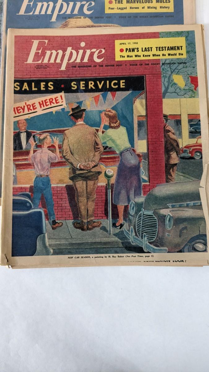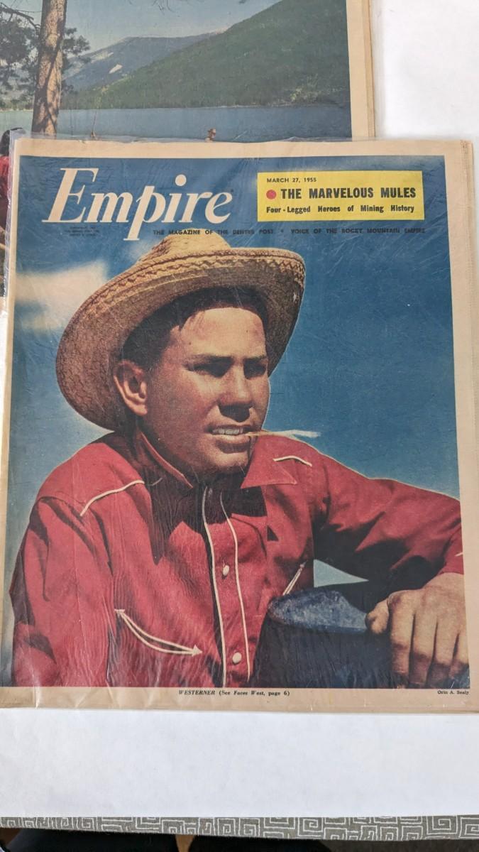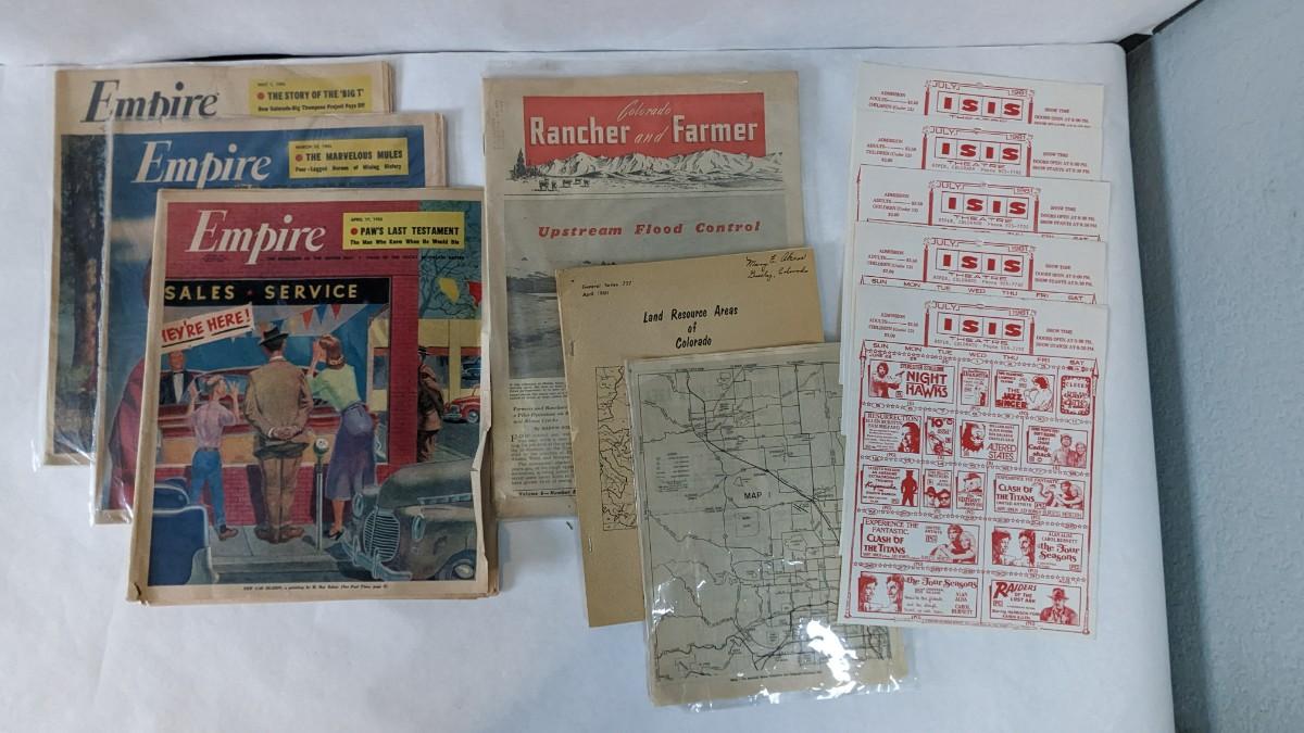 includes ISIS theatre Aspen 1981 posters, map and land resource book, 3 Empire inserts from 1955, and Colorado Rancher and Farmer from 1952. Fun stuff from CO with tons of framing/upcycling potential.