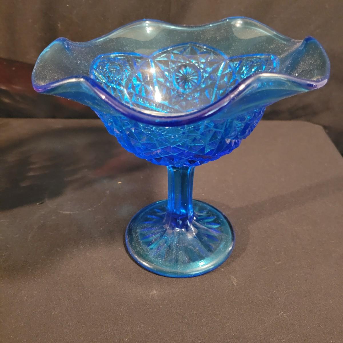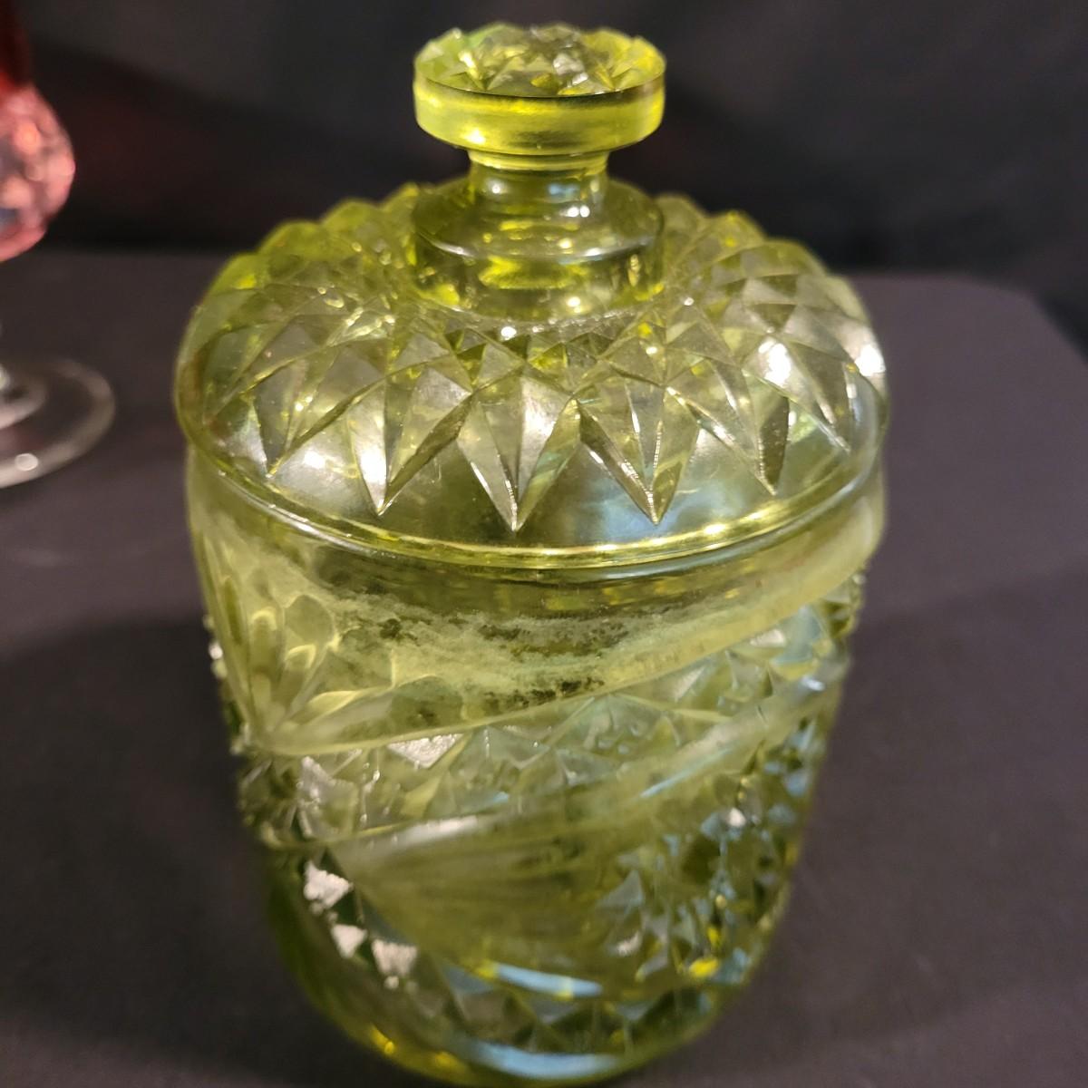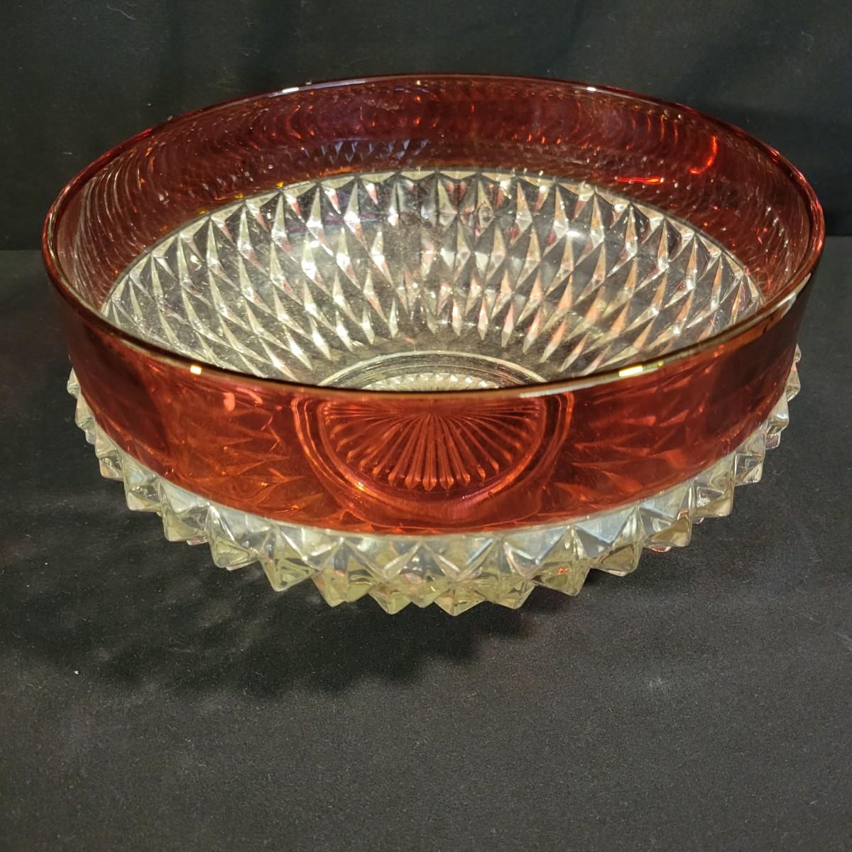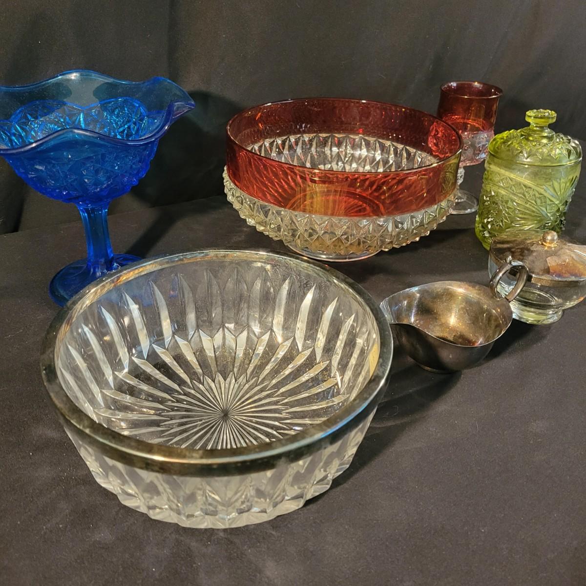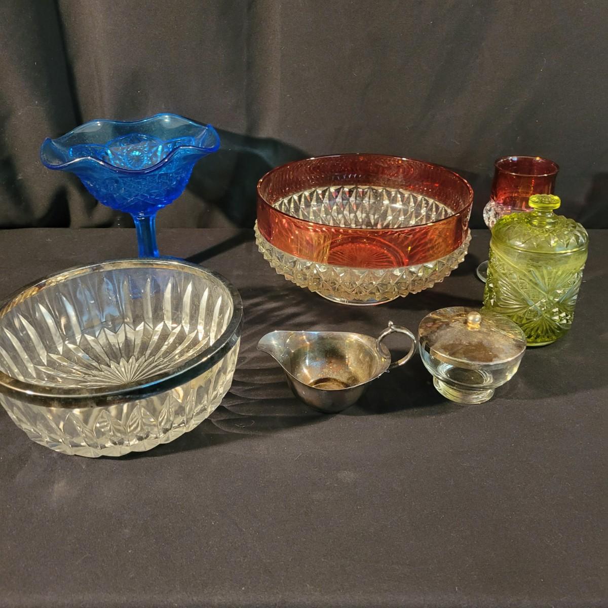 An assortment of colored glass bowls, an urn and glass in good condition with no notable damage. Includes a small bowl with what appears to be a plated silver lid, a plated silver gravy boat and a larger bowl with what appears to be a plated silver lip. Large bowl with red rim measures approximately 10" x 5" Shipping available