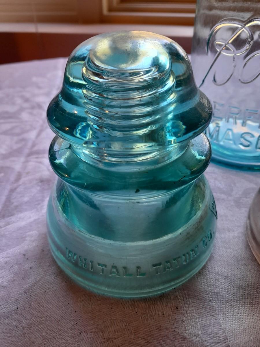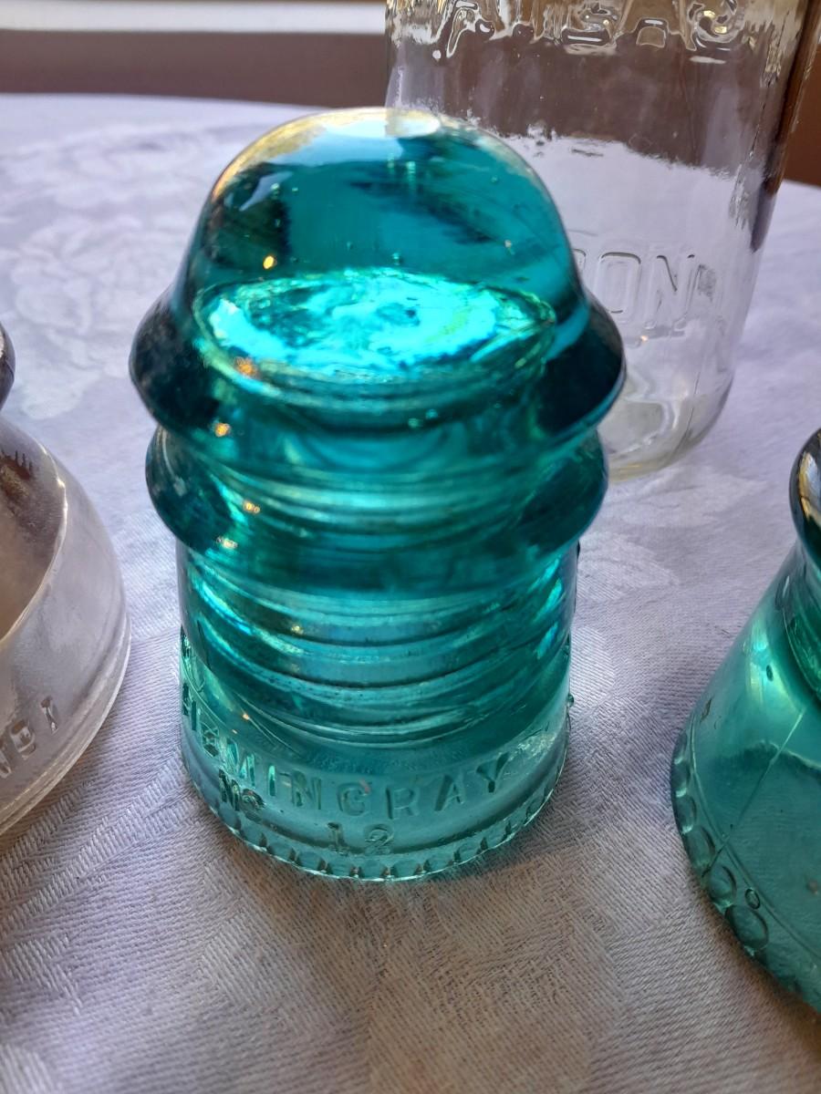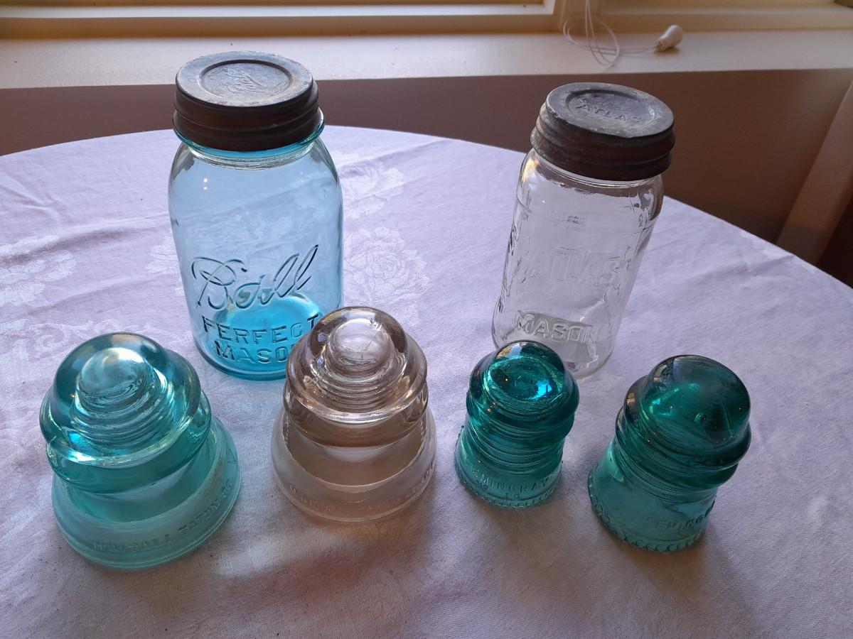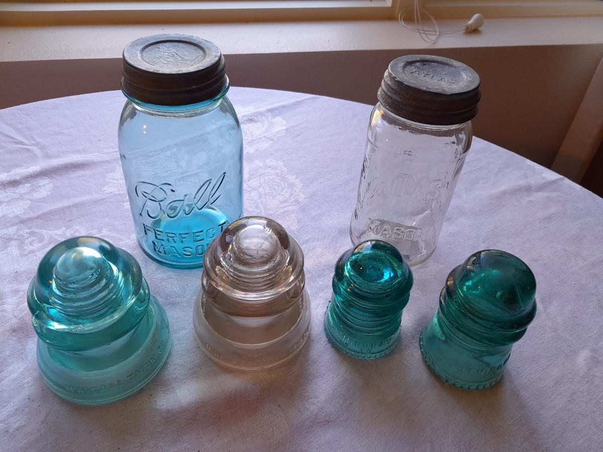 VINTAGE COLORED GLASS INSULATORS AND ZINC LIDDED JARS