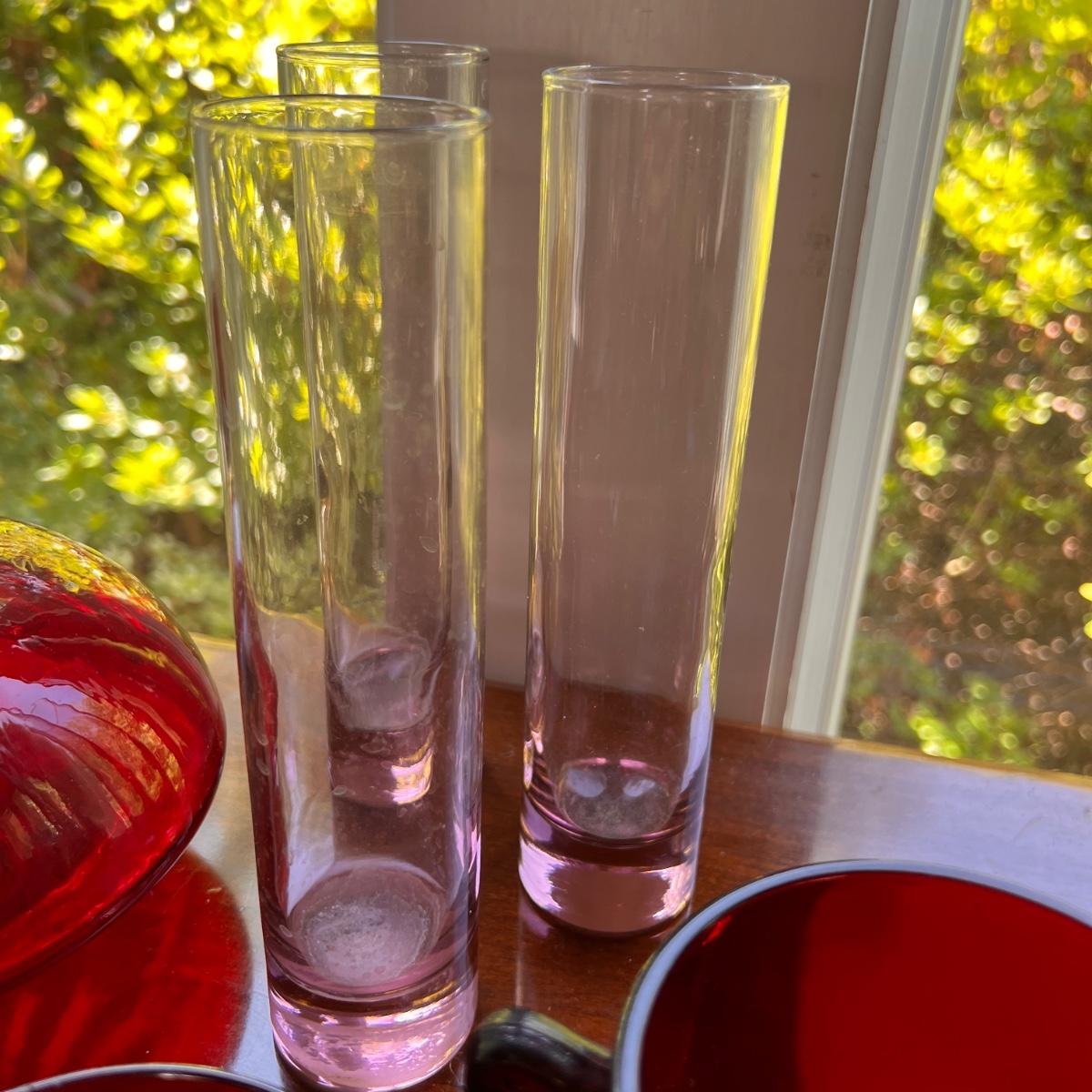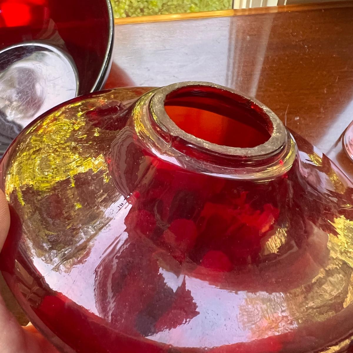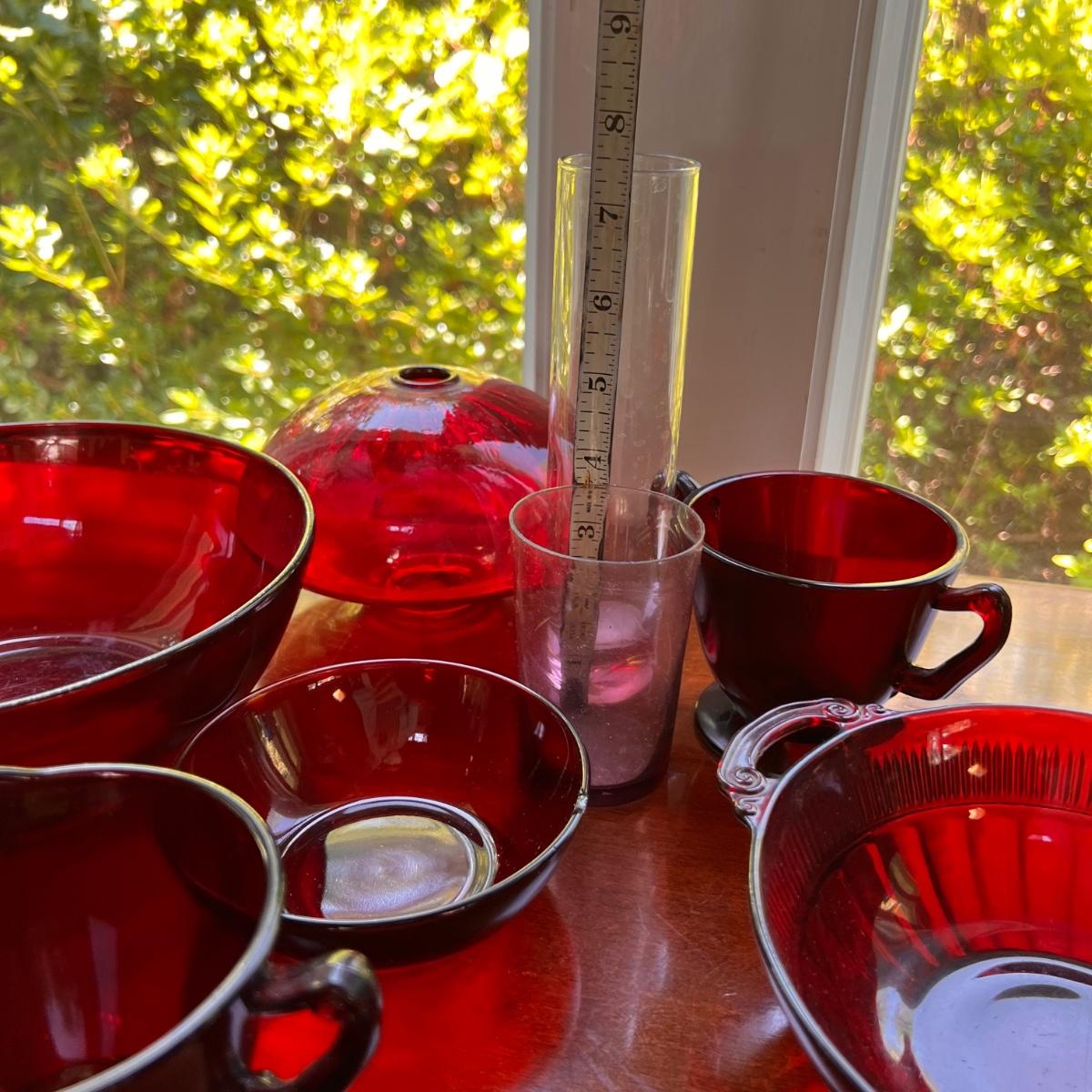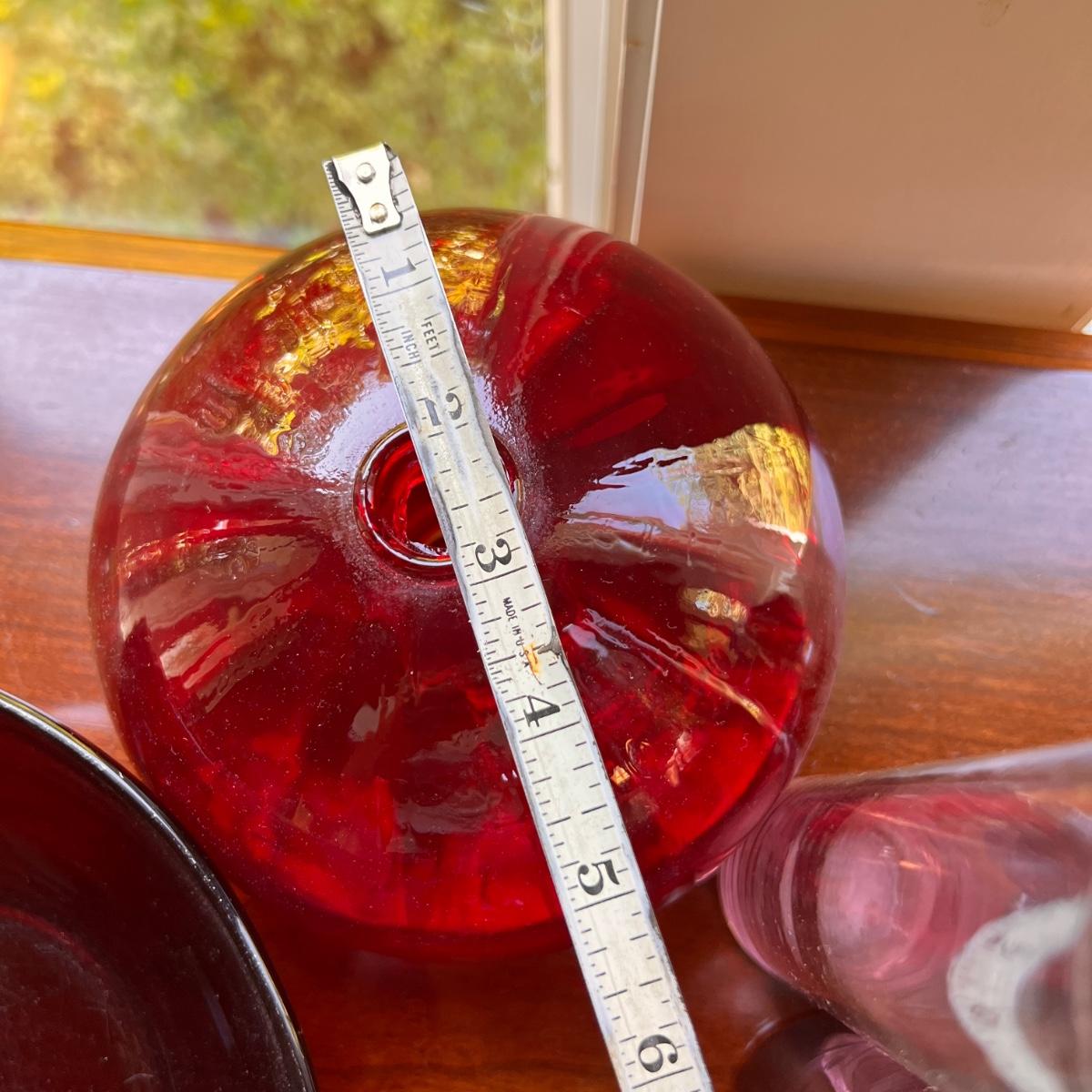 Cranberry red and violet colored glass lot including bowls, cups, lamp base and more.