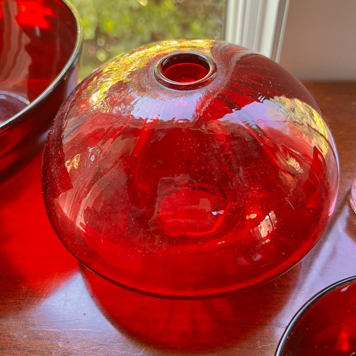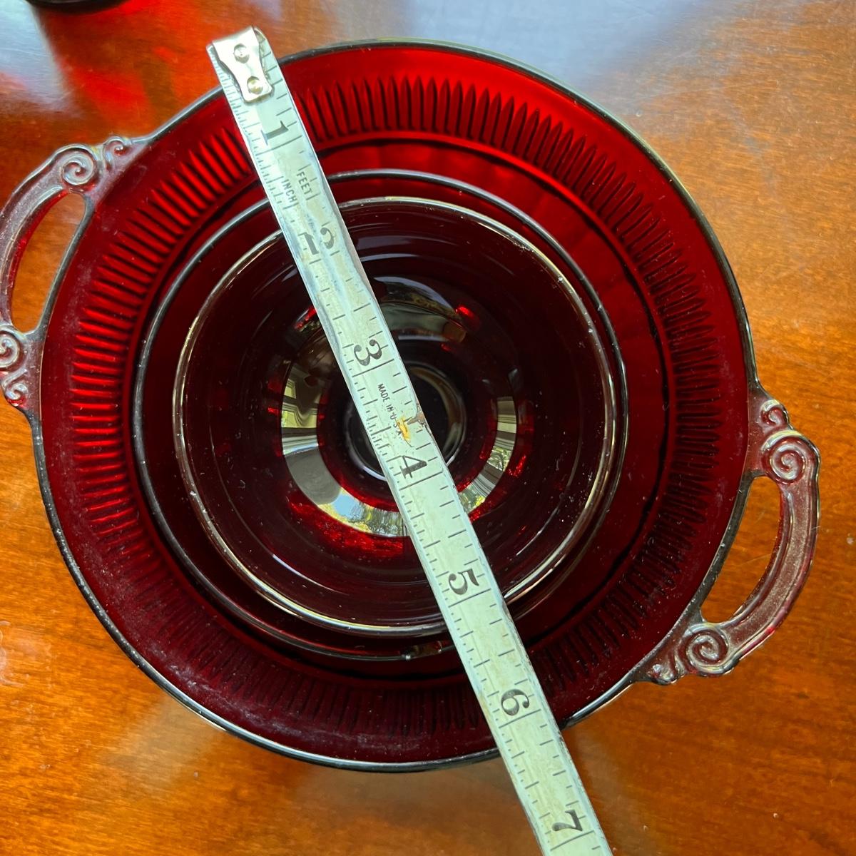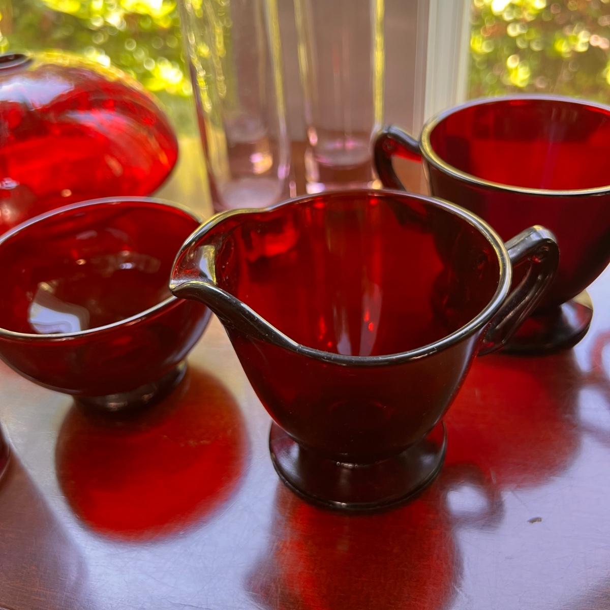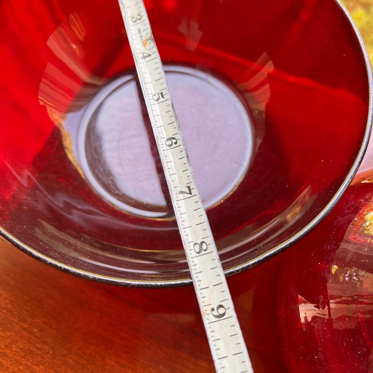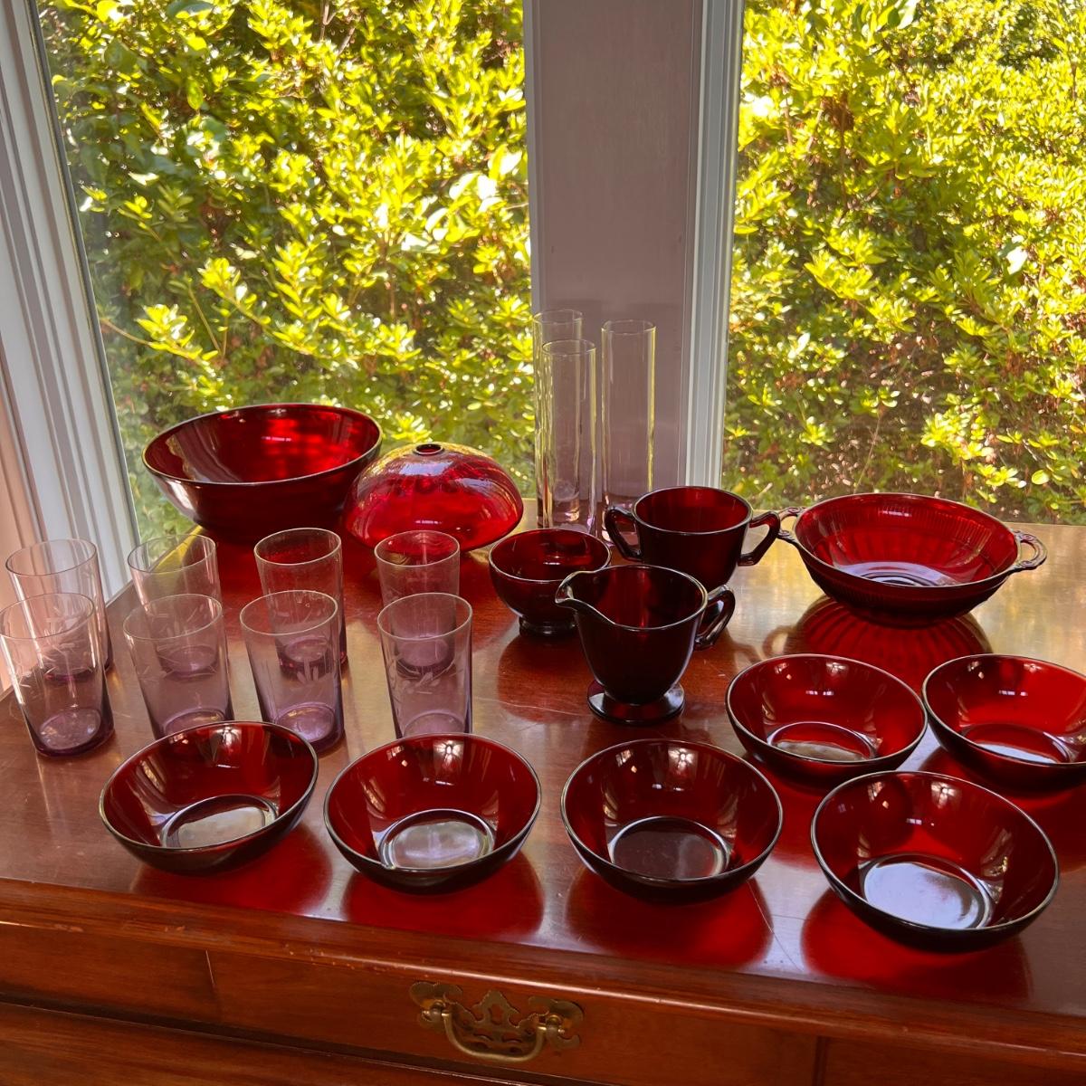 Cranberry red and violet colored glass lot including bowls, cups, lamp base and more.