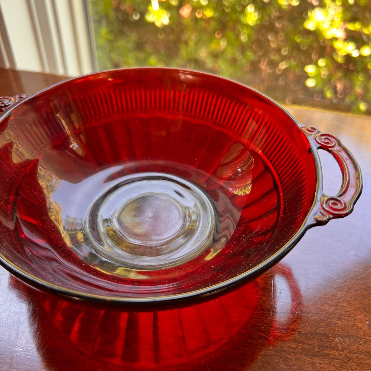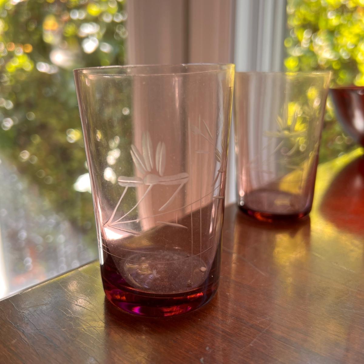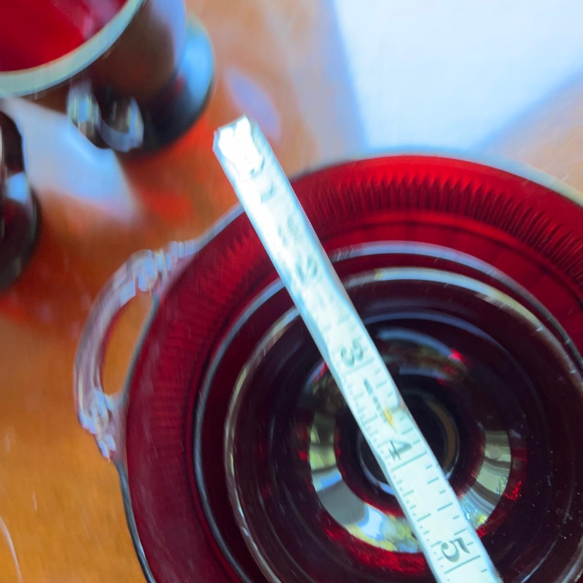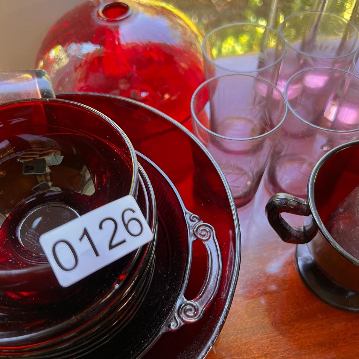 Cranberry red and violet colored glass lot including bowls, cups, lamp base and more.