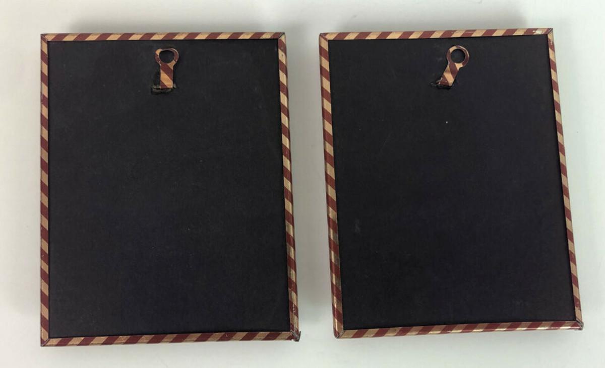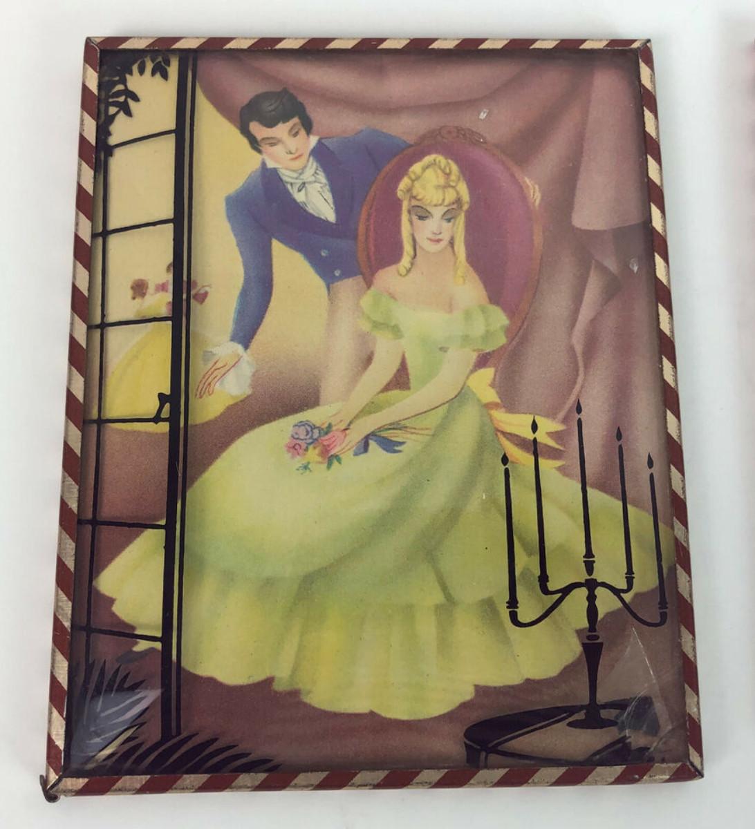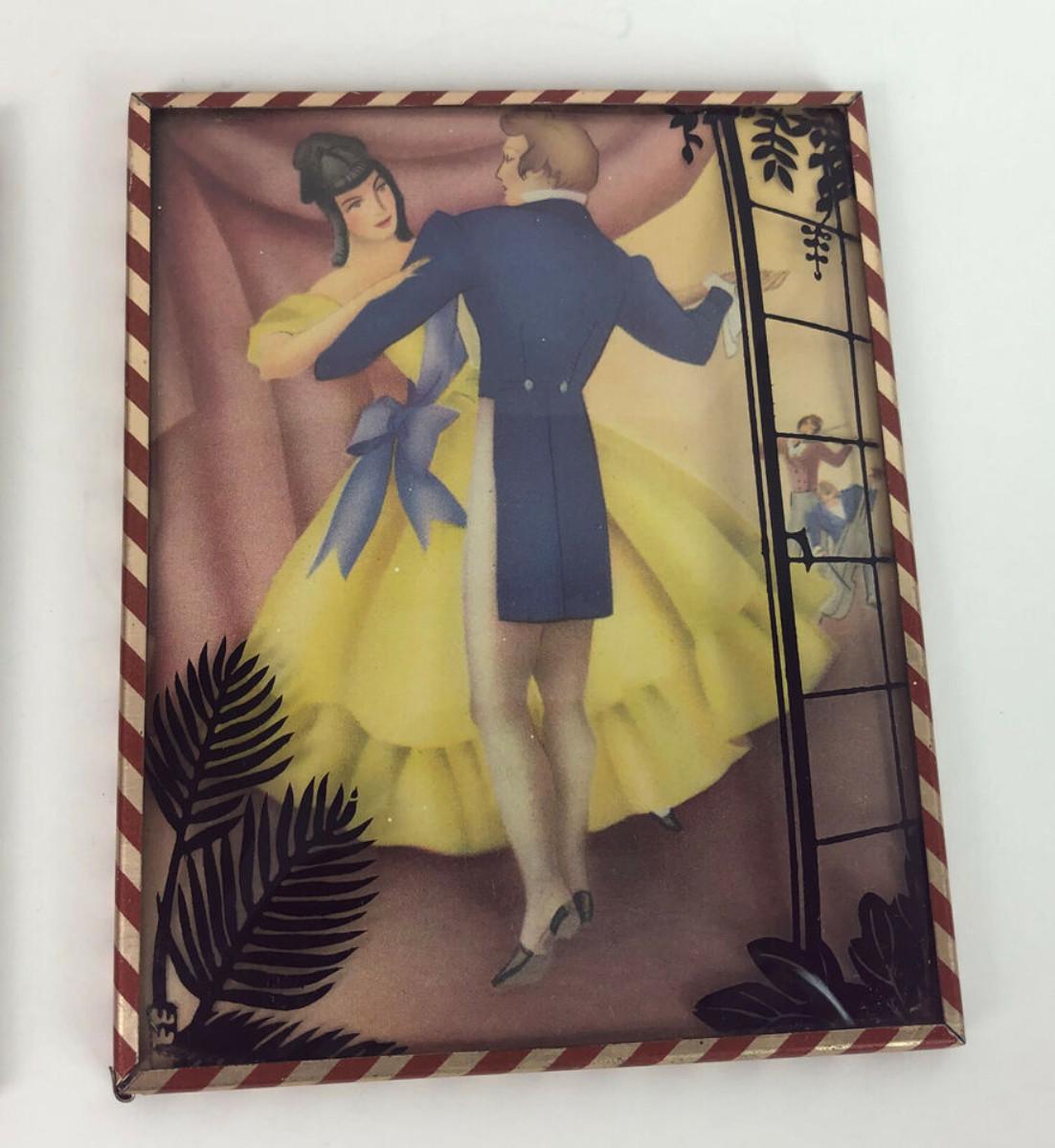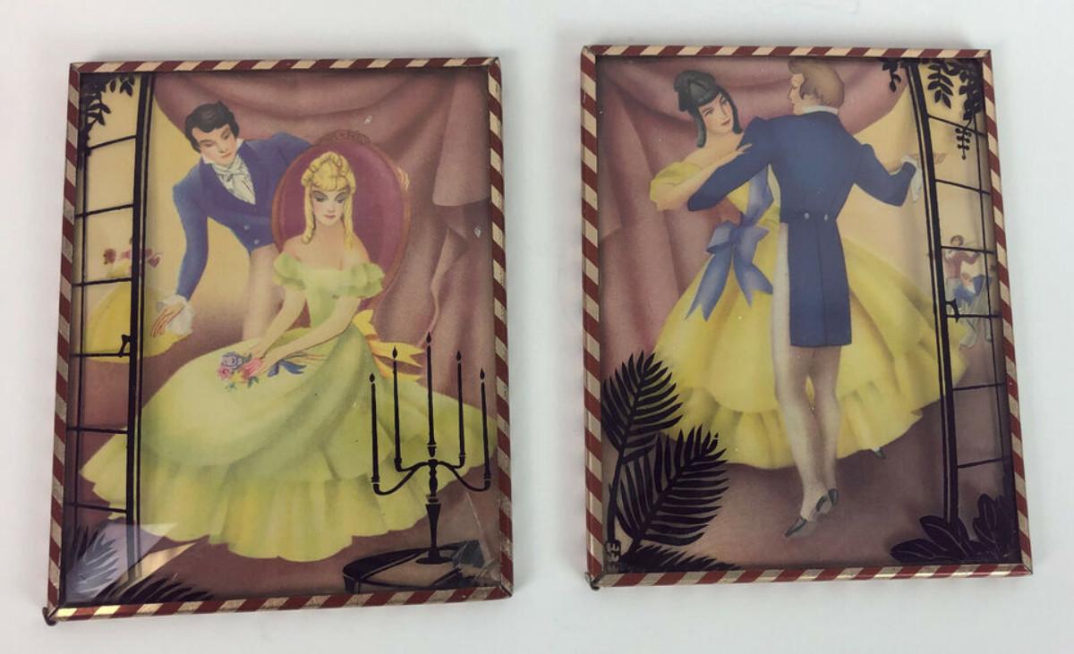 In good condition here are a pair of small 4 x 5" colored silhouettes with reverse painted accents on convex covers...Probably circa 1940's...The scenes feature 19th century scenes at a ball.
