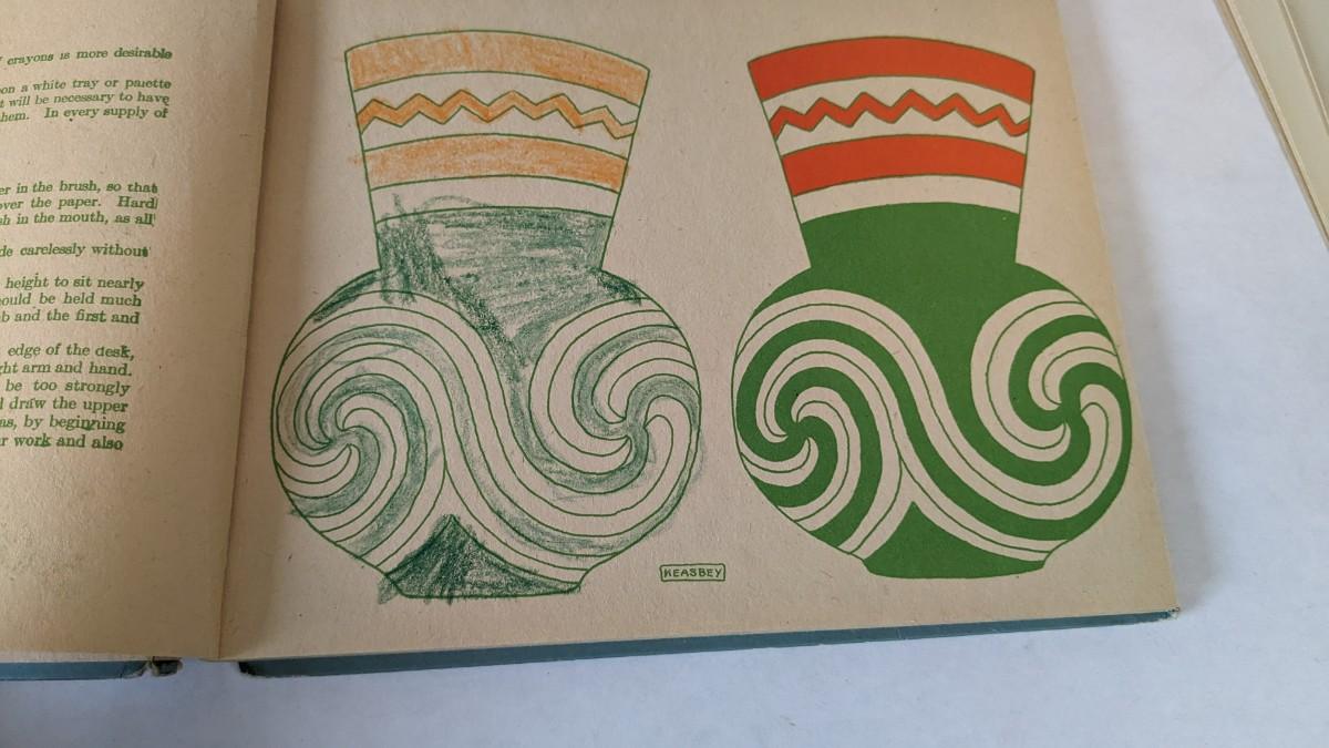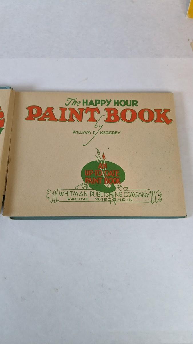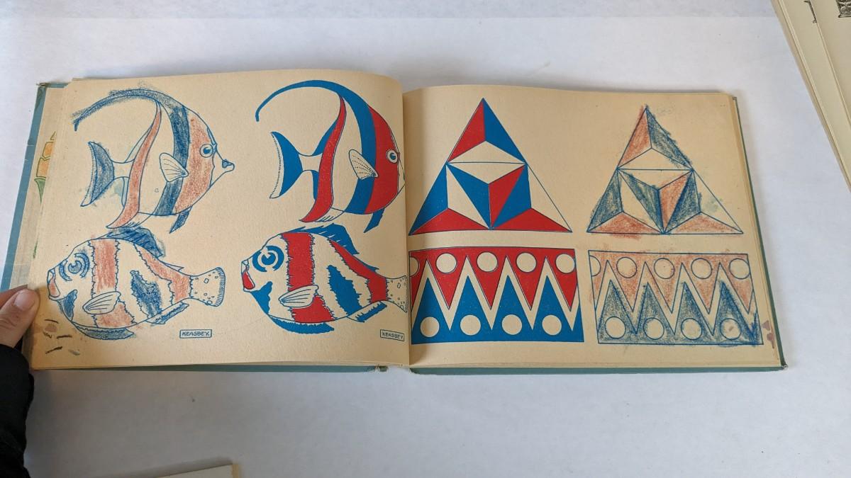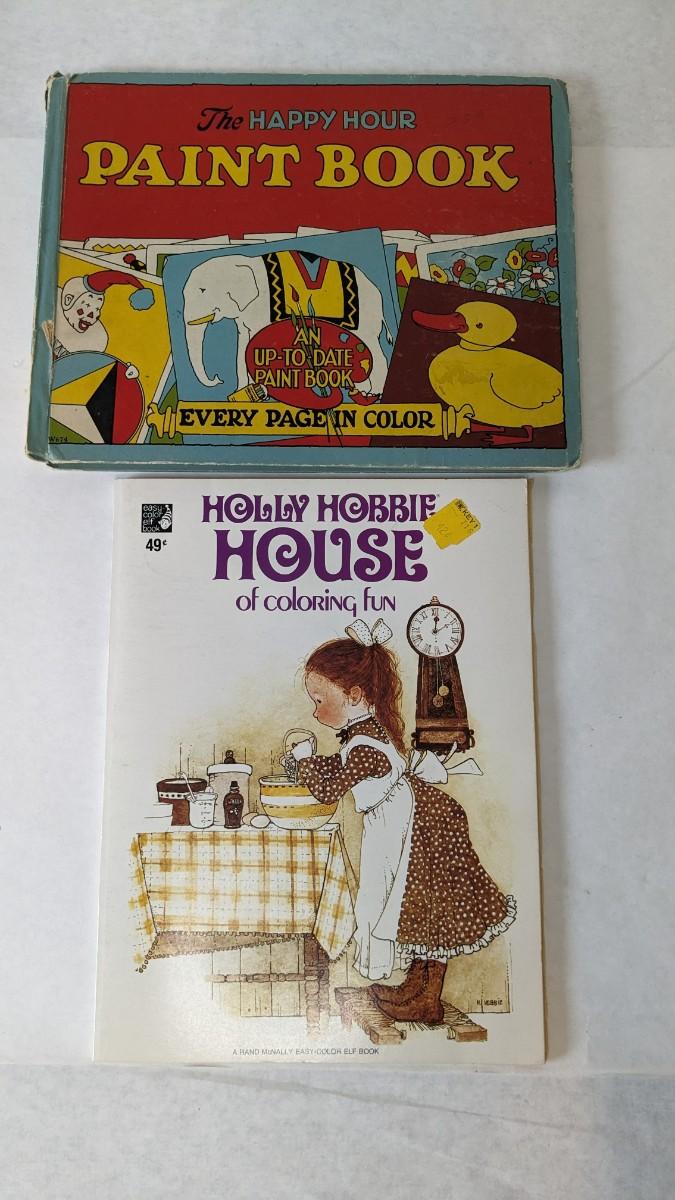 (2) including 1920's Keasbey book that has been colored throughout, would make a fantastic piece apart for framing. As well as Hollie Hobbie coloring book with pages ripped out but present, only one page appears colored.