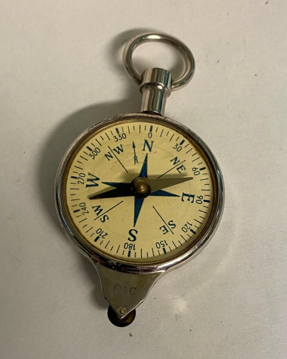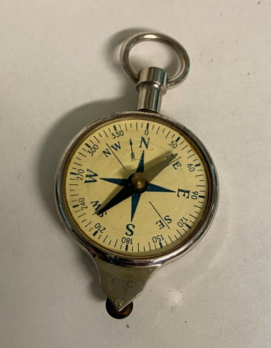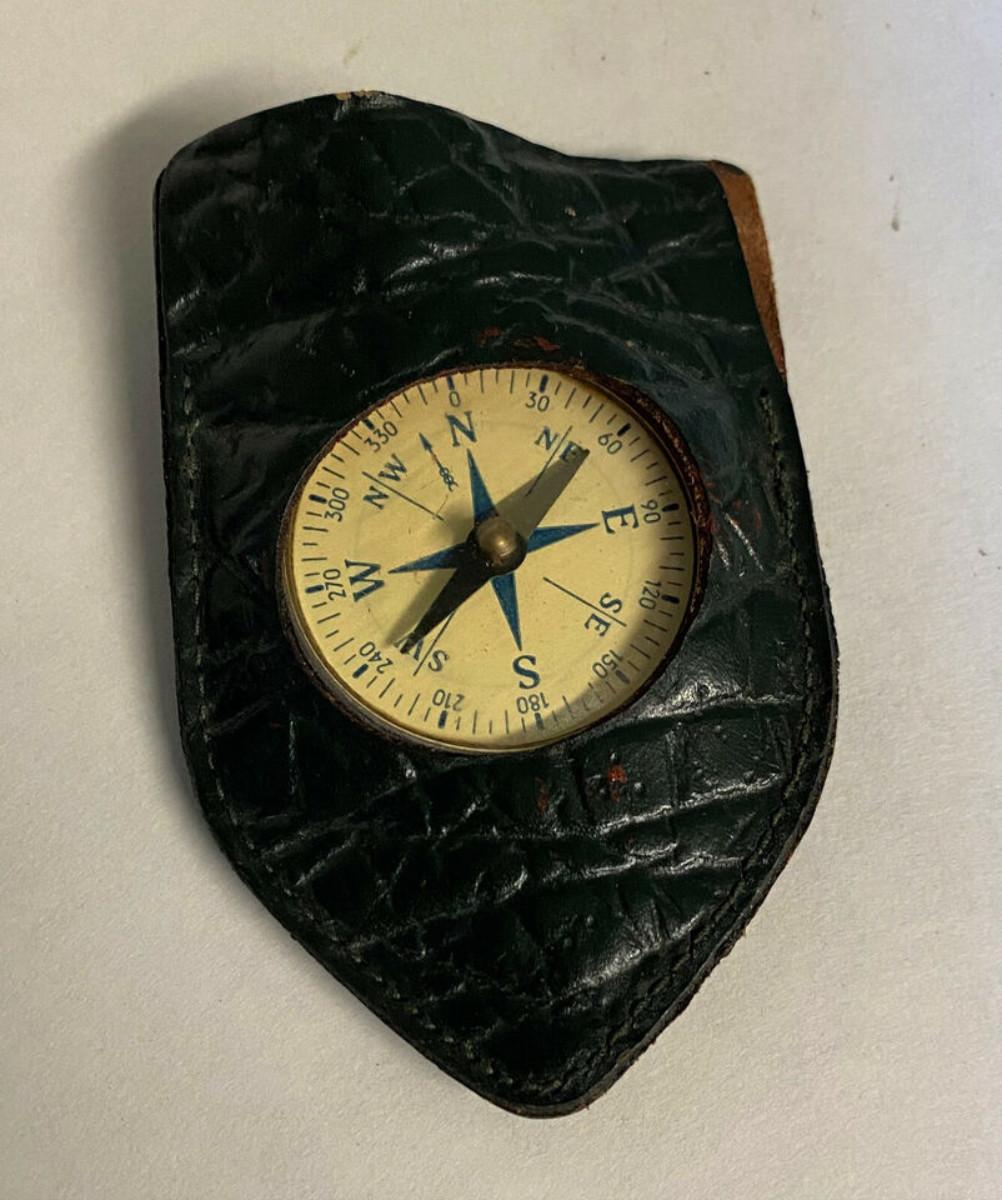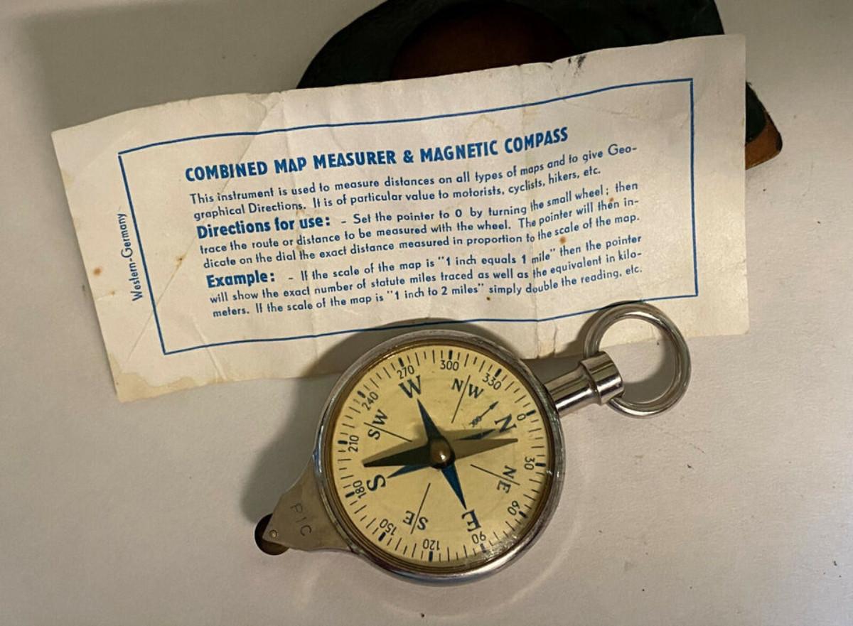 vintage combined map measurer and magnetic compass with a green leather..Made in Western Germany...includes an instruction sheet...as shown...Analog display..Working..Measures miles and kilometers...3" long with loop...Pocket-size...Stamped PIC? Manufacturer?