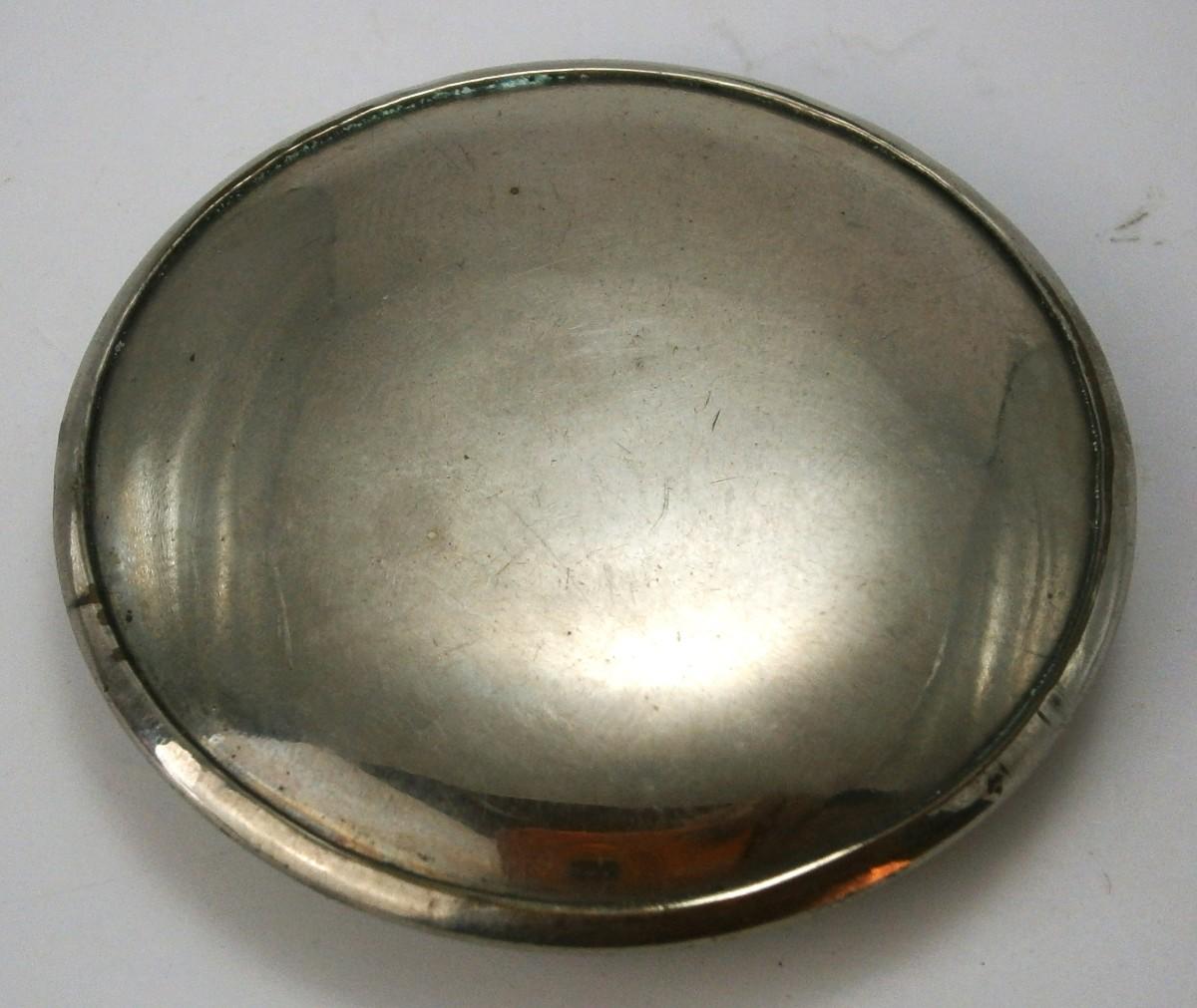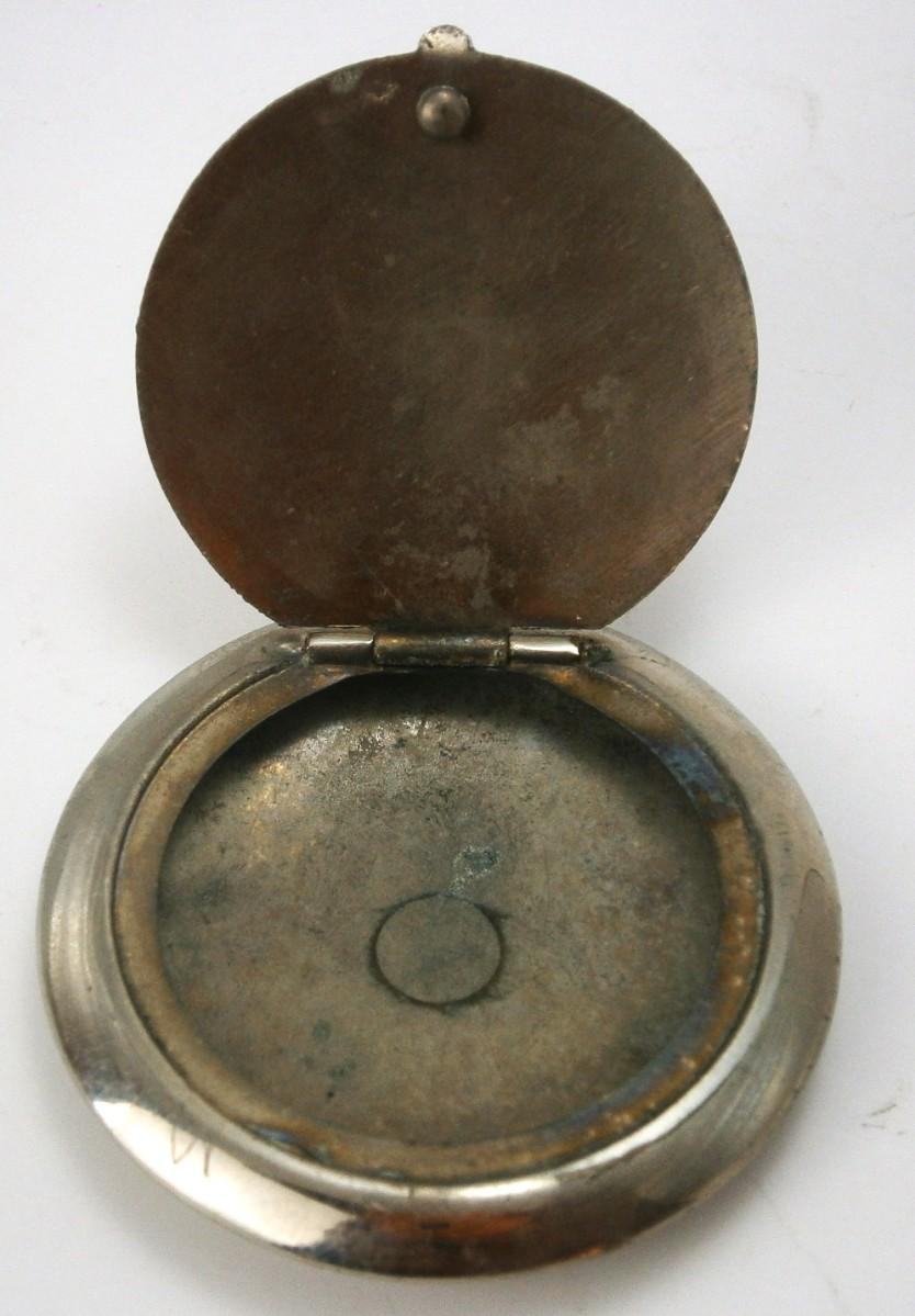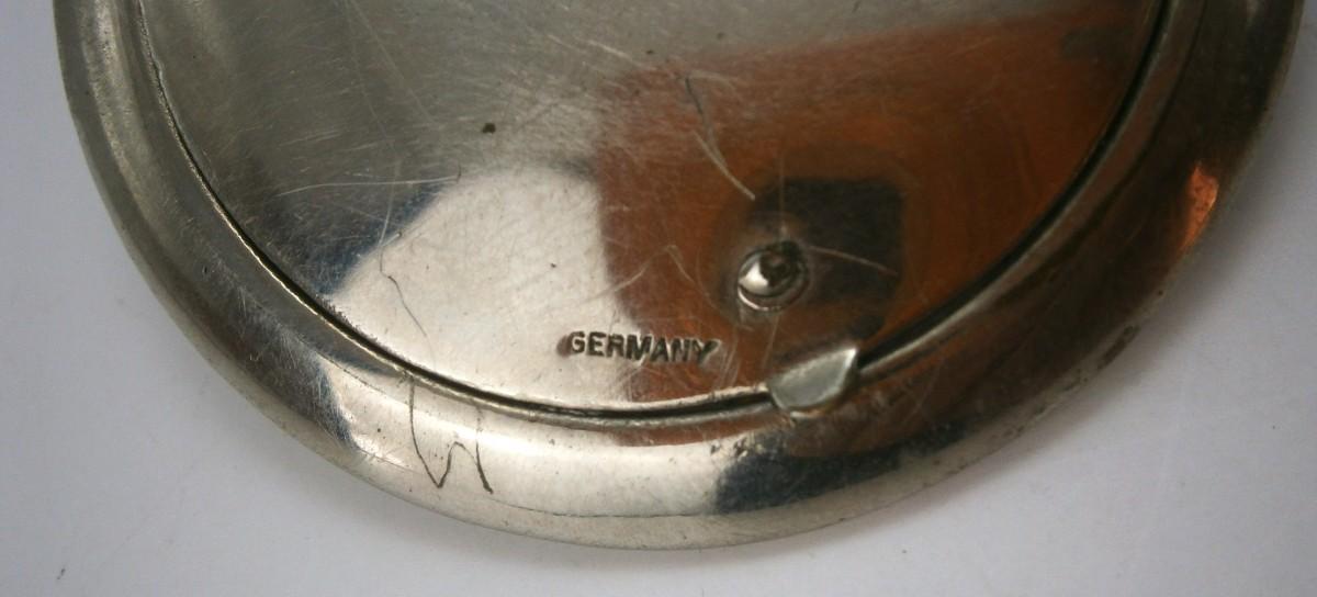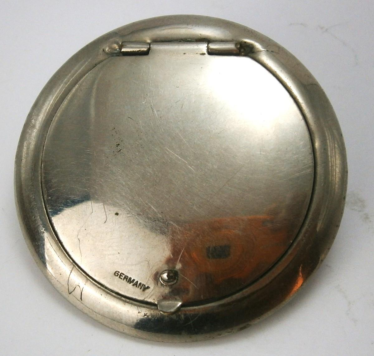 Vintage Compact made in Germany from the 1930's, chrome plated metal, 1 7/8 in. diameter.
