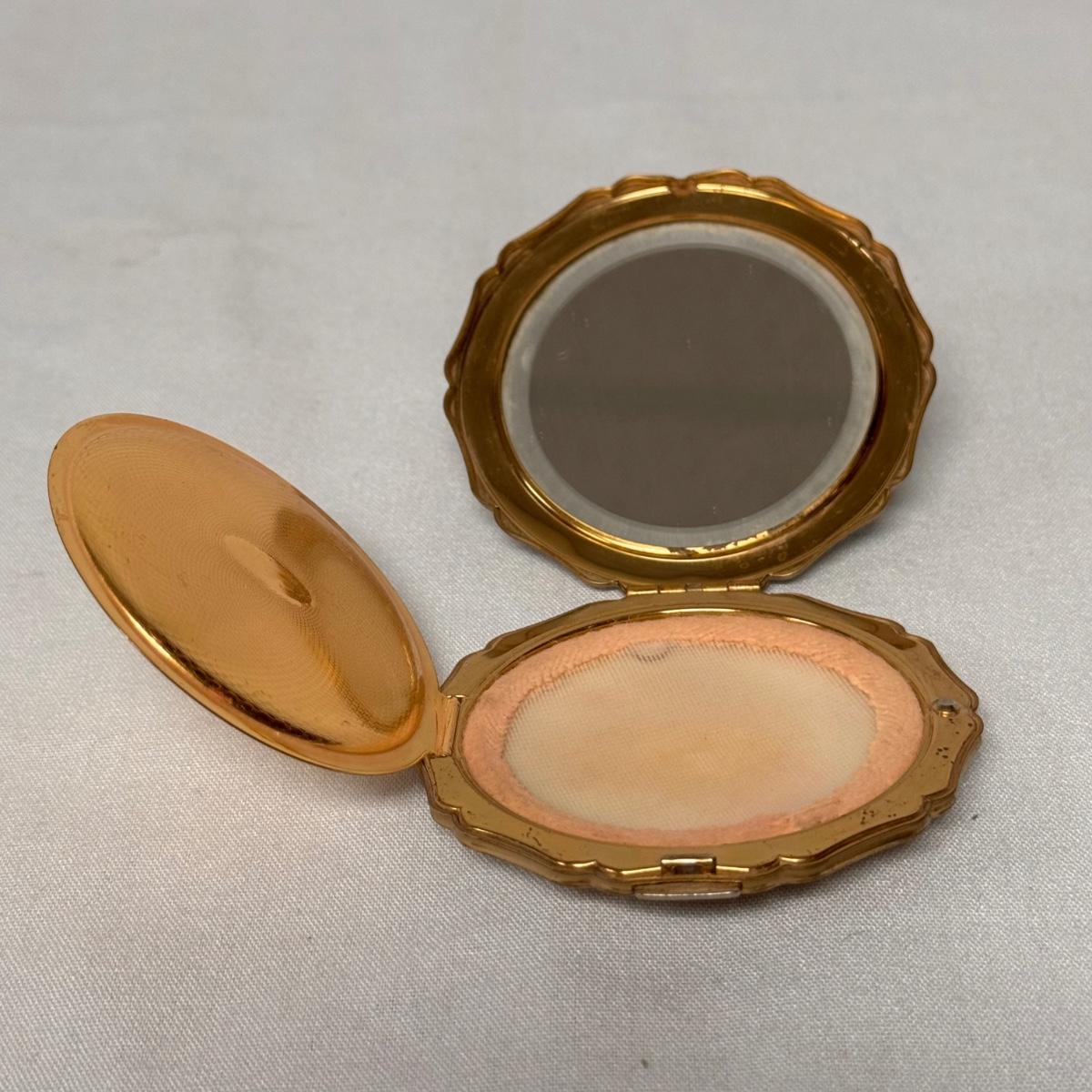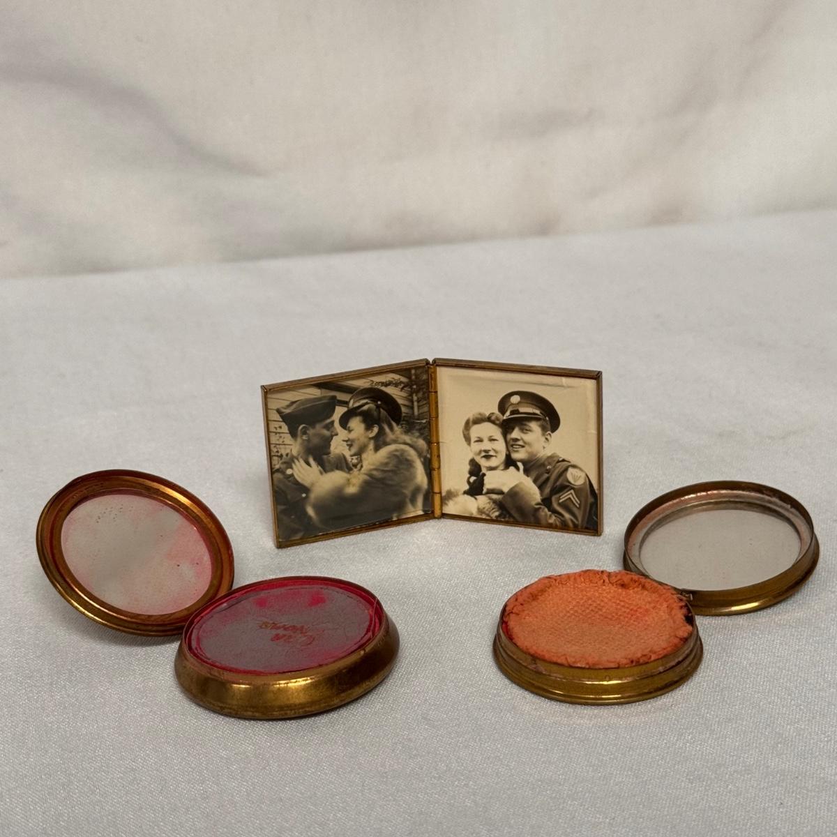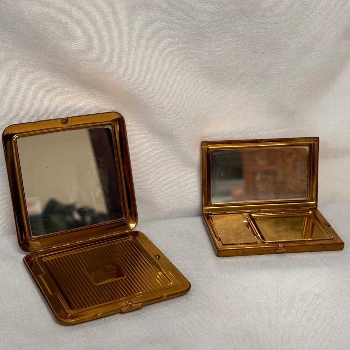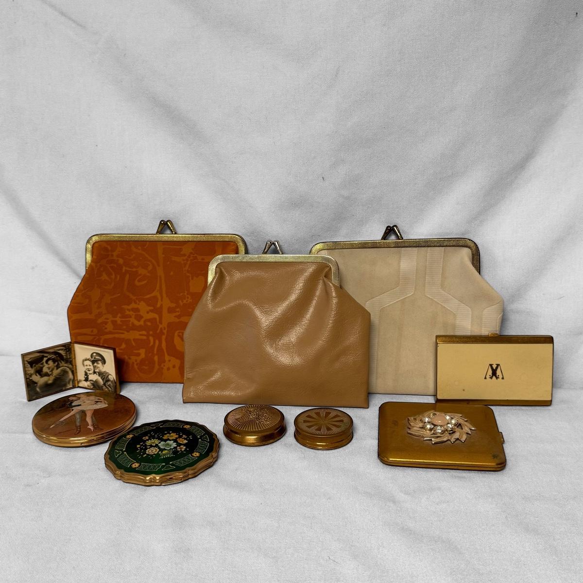 This lot includes three vintage coin wallets with sturdy clasps. It also includes six compact mirrors with powder from the following: Cara Nome Langloise Rogue, Du Barry Compact Bloom, Dorset Fifth Avenue, Elsie de Wolfe and two that are Stratton. There is also one compact double frame that has two lovely vintage pictures inserted. The largest coin wallet is the white one that measures 6” x 5”H. Shipping available.