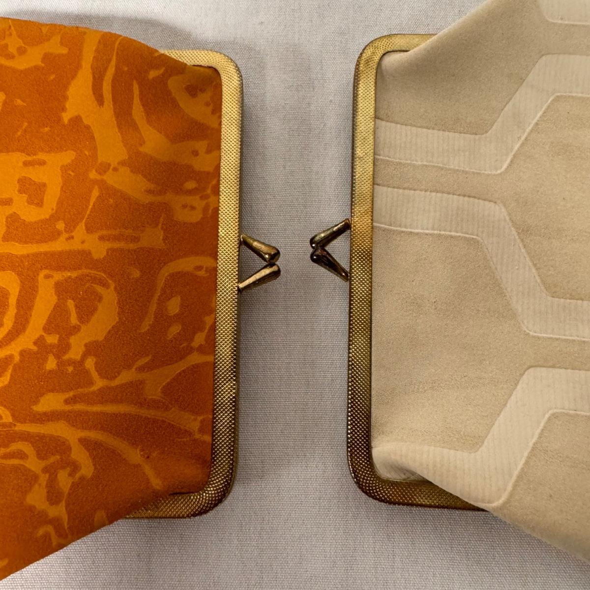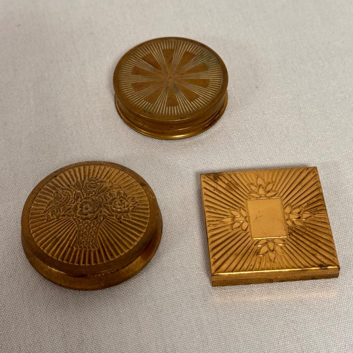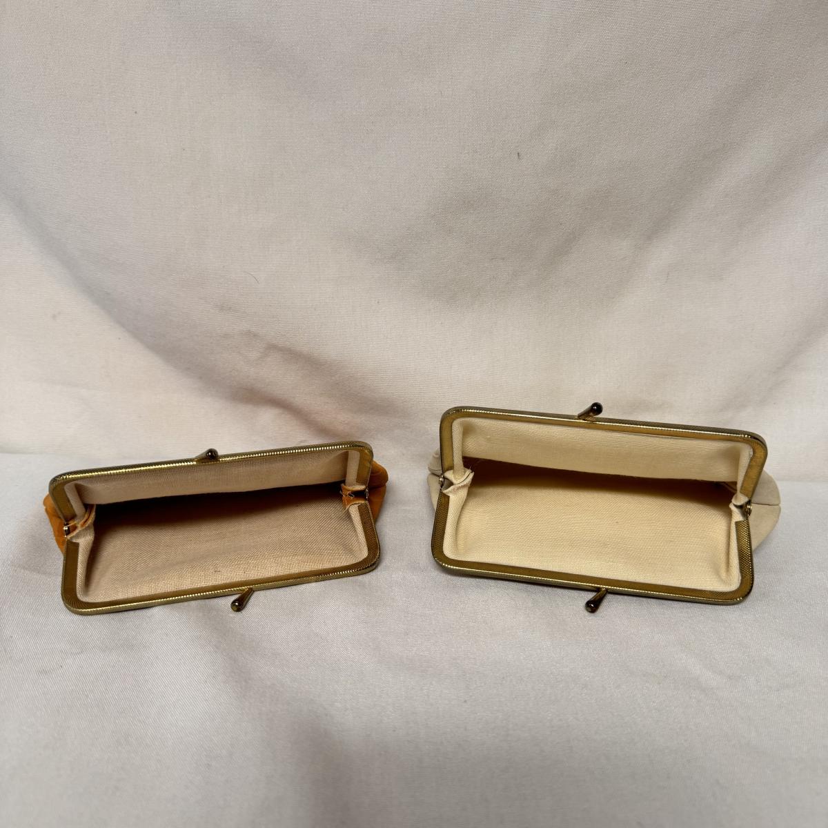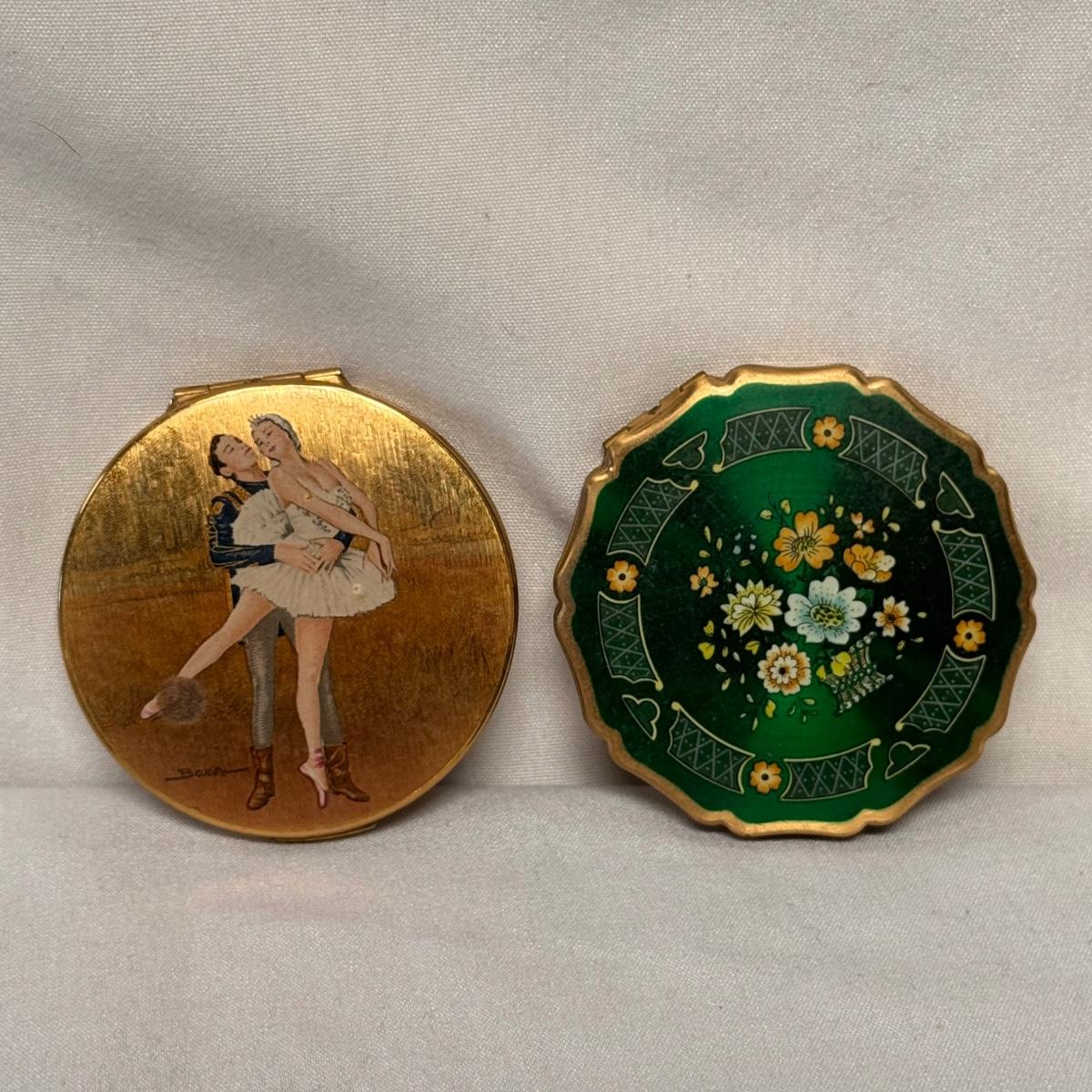 This lot includes three vintage coin wallets with sturdy clasps. It also includes six compact mirrors with powder from the following: Cara Nome Langloise Rogue, Du Barry Compact Bloom, Dorset Fifth Avenue, Elsie de Wolfe and two that are Stratton. There is also one compact double frame that has two lovely vintage pictures inserted. The largest coin wallet is the white one that measures 6” x 5”H. Shipping available.