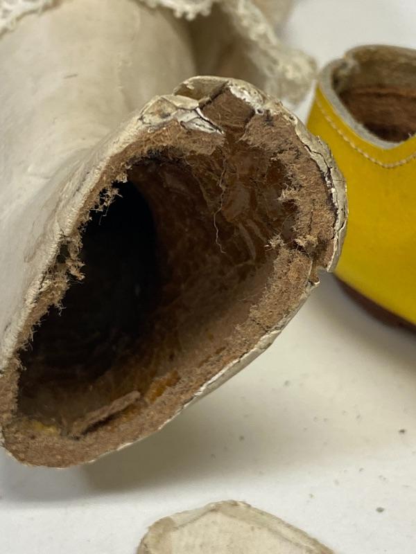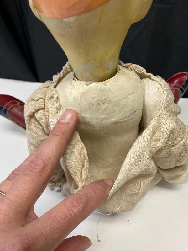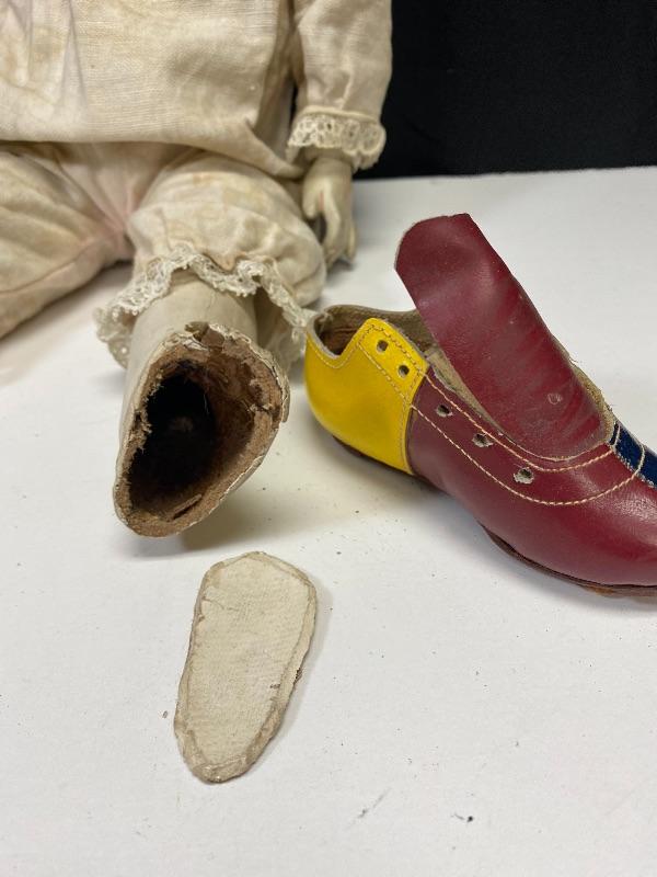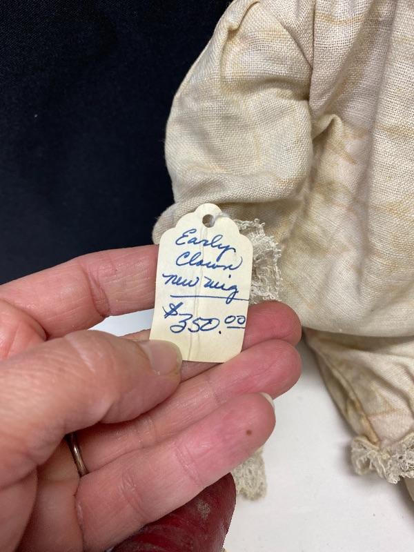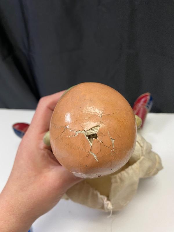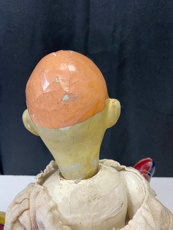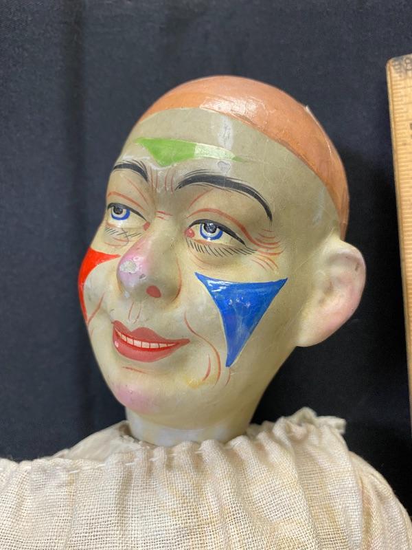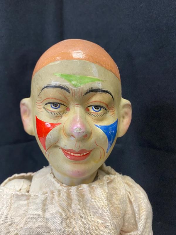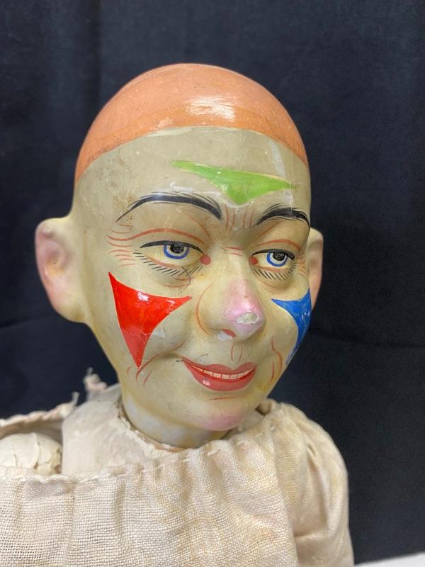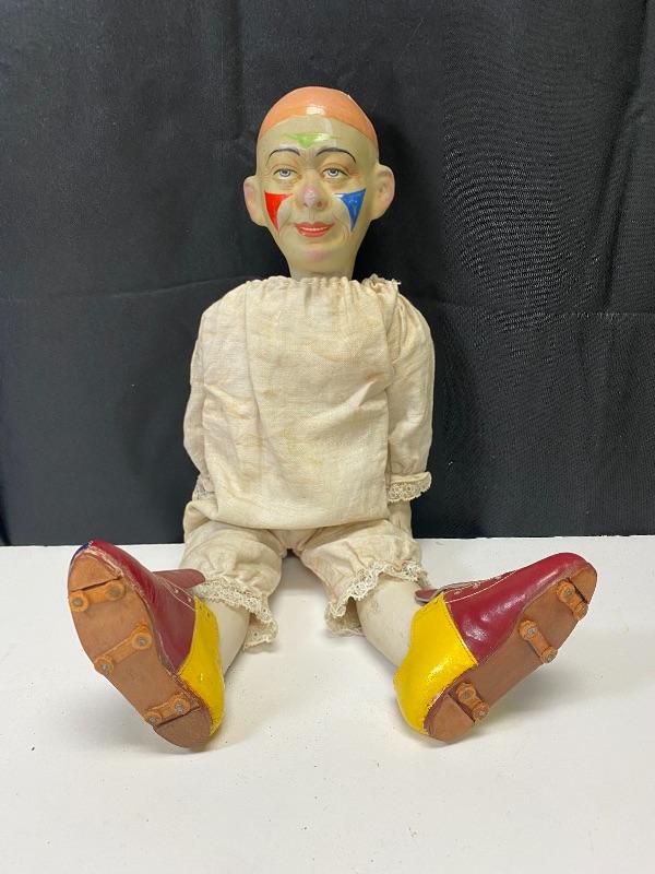 Vintage, possibly 1940s classic circus clown doll. Very lightweight composite, jointed body. Wearing what look like football cleats. There is a tag on him, hand written, says "early clown new wig $350.00" I do not know what happened to his wig. He does have a hole in the top of head and cracking/damage around it. 17" size.